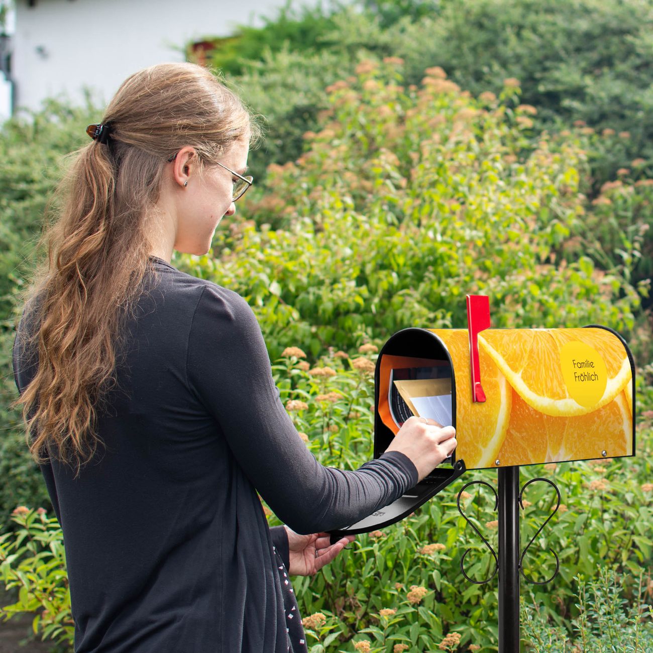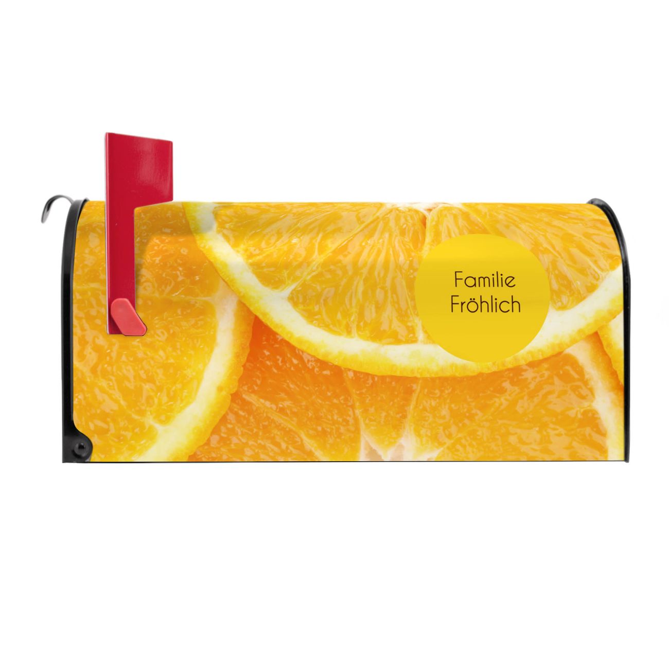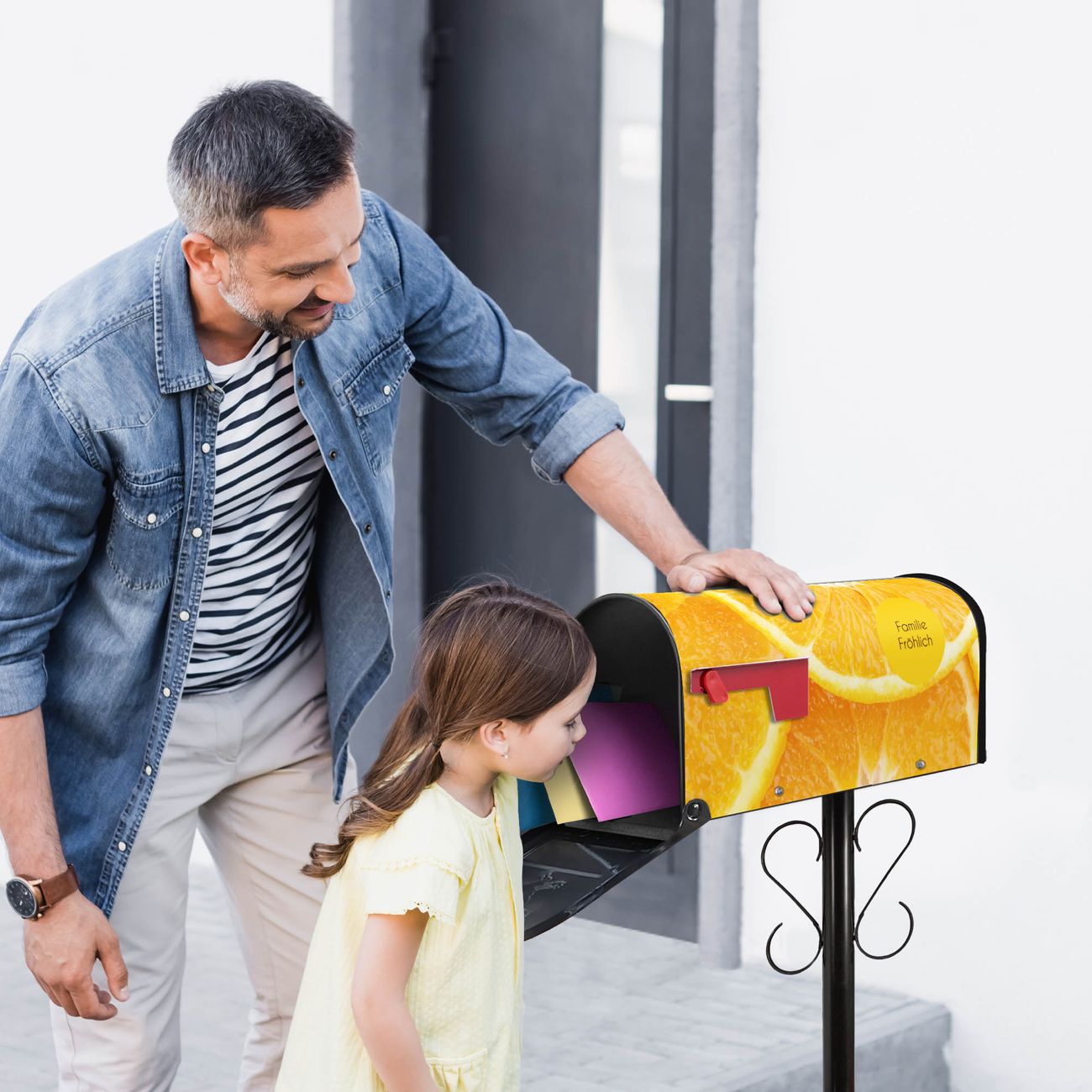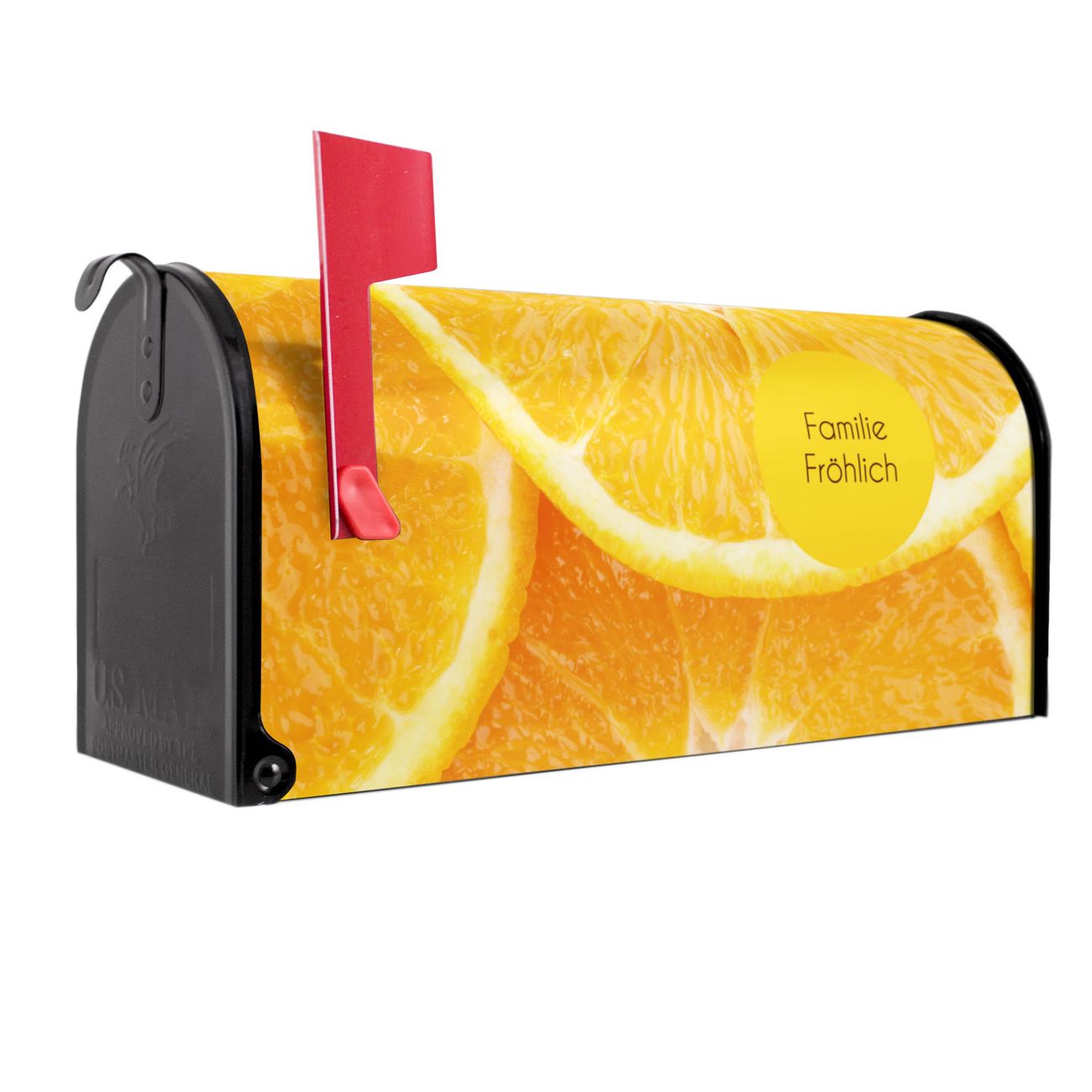 Der amerikanische Briefkasten von banjado mit Orangenscheiben Motiv bietet Ihnen ausreichend Fassungsvermögen, um große A4 Sendungen und Zeitschriften zu empfangen. Die typisch amerikanische rote Fahne zeigt Ihnen an, wenn Sie Post erhalten haben. Die US-Mailbox besteht aus verzinktem Stahlblech welches lackiert wurde und ist 48 x 22 x 16 CM (BxHxT) groß. Die Folie mit Motiv Orangenscheiben besteht aus einer wetter- und UV-resistenten Folie, die mit einem Schutzlaminat überzogen ist, sodass die US Mailbox zusätzlich vor Kratzern geschützt ist. An der Unterkante sind 4 Löcher je Seite um die Mailbox, typisch amerikanisch, an einem Holzpfahl oder einem Zaun zu befestigen. Auf Wunsch können Sie bei uns den passenden Standfuß oder die passende Wandhalterung kaufen um die US-Mailbox sicher zu befestigen. Wir bieten Ihnen ebenfalls Namensschilder, bereits beschriftet oder frei zu beschriften, und verschiedene selbst gestaltete Bitte-Keine-Werbung-Aufkleber.