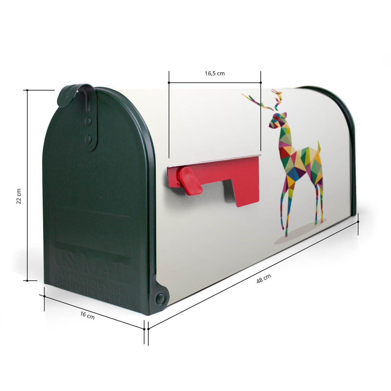 Der amerikanische Briefkasten von banjado mit Origami Hirsch Motiv bietet Ihnen ausreichend Fassungsvermögen, um große A4 Sendungen und Zeitschriften zu empfangen. Die typisch amerikanische rote Fahne zeigt Ihnen an, wenn Sie Post erhalten haben. Die US-Mailbox besteht aus verzinktem Stahlblech welches lackiert wurde und ist 48 x 22 x 16 CM (BxHxT) groß. Die Folie mit Motiv Origami Hirsch besteht aus einer wetter- und UV-resistenten Folie, die mit einem Schutzlaminat überzogen ist, sodass die US Mailbox zusätzlich vor Kratzern geschützt ist. An der Unterkante sind 4 Löcher je Seite um die Mailbox, typisch amerikanisch, an einem Holzpfahl oder einem Zaun zu befestigen. Auf Wunsch können Sie bei uns den passenden Standfuß oder die passende Wandhalterung kaufen um die US-Mailbox sicher zu befestigen. Wir bieten Ihnen ebenfalls Namensschilder, bereits beschriftet oder frei zu beschriften, und verschiedene selbst gestaltete Bitte-Keine-Werbung-Aufkleber.