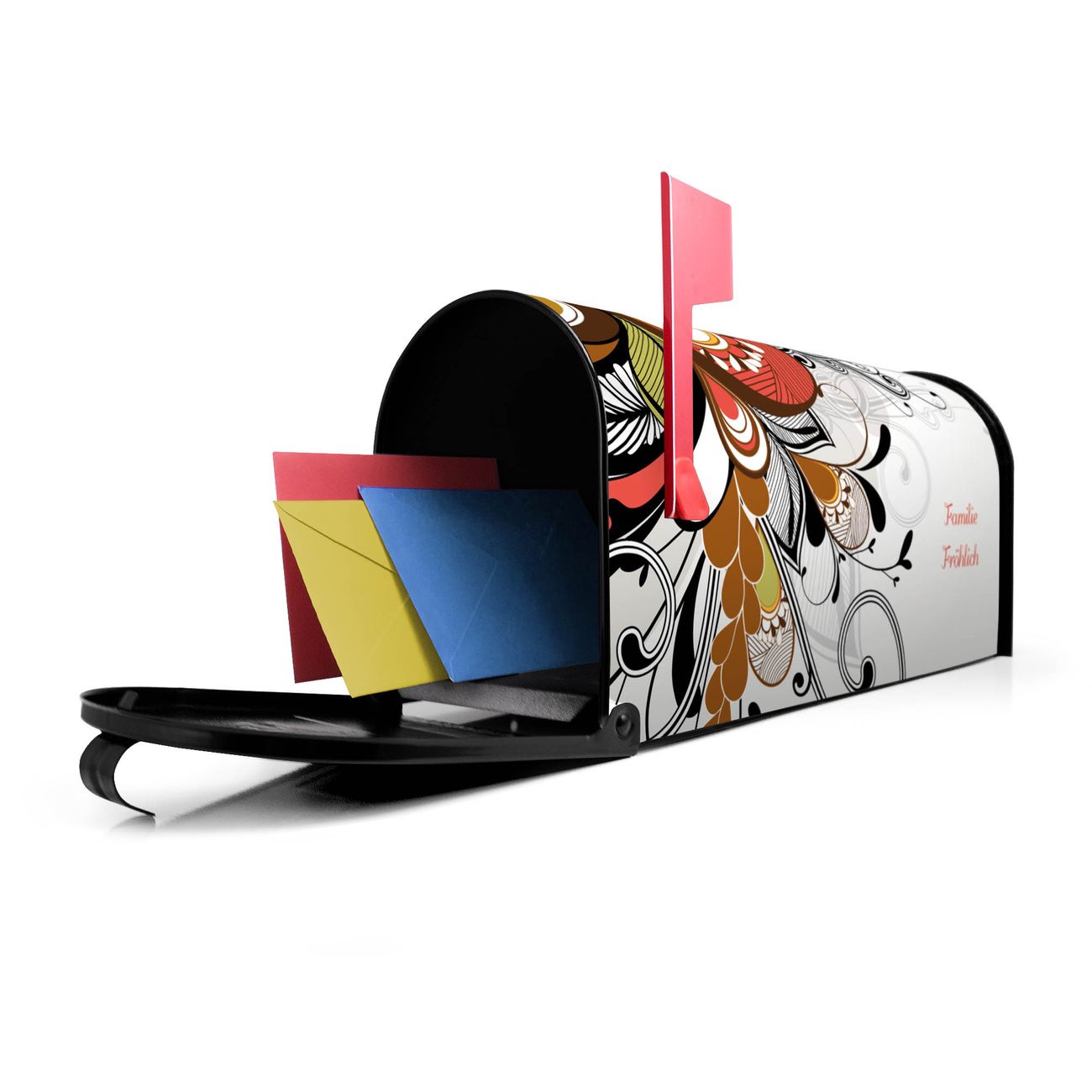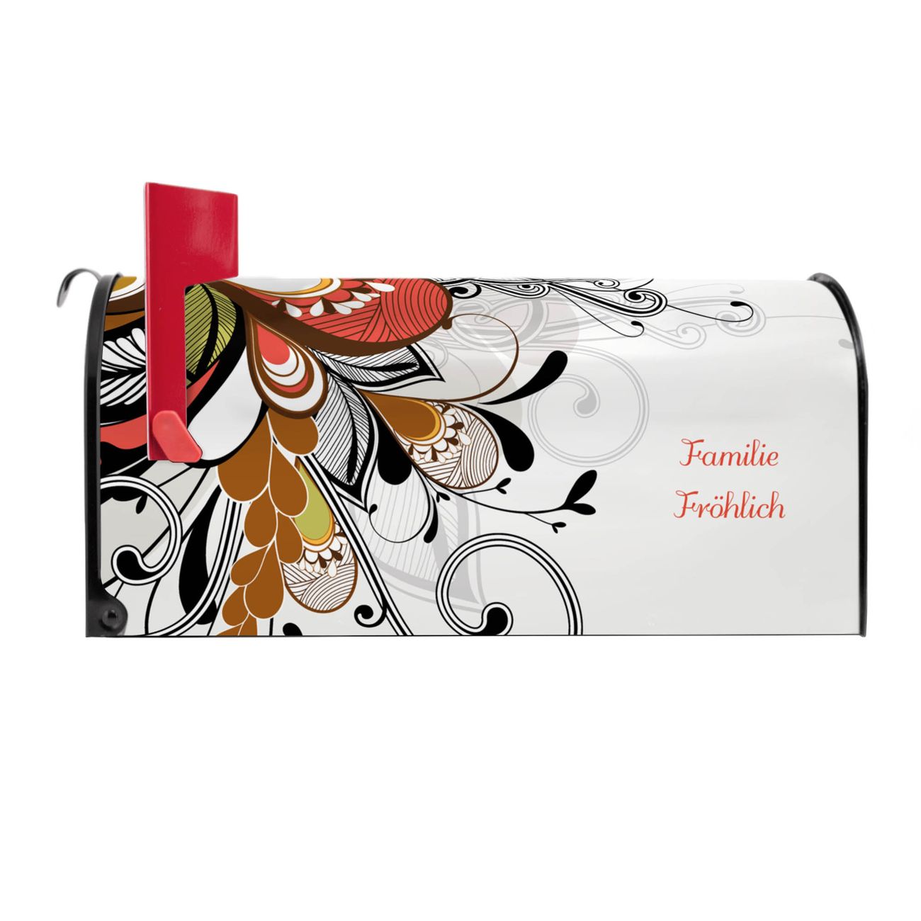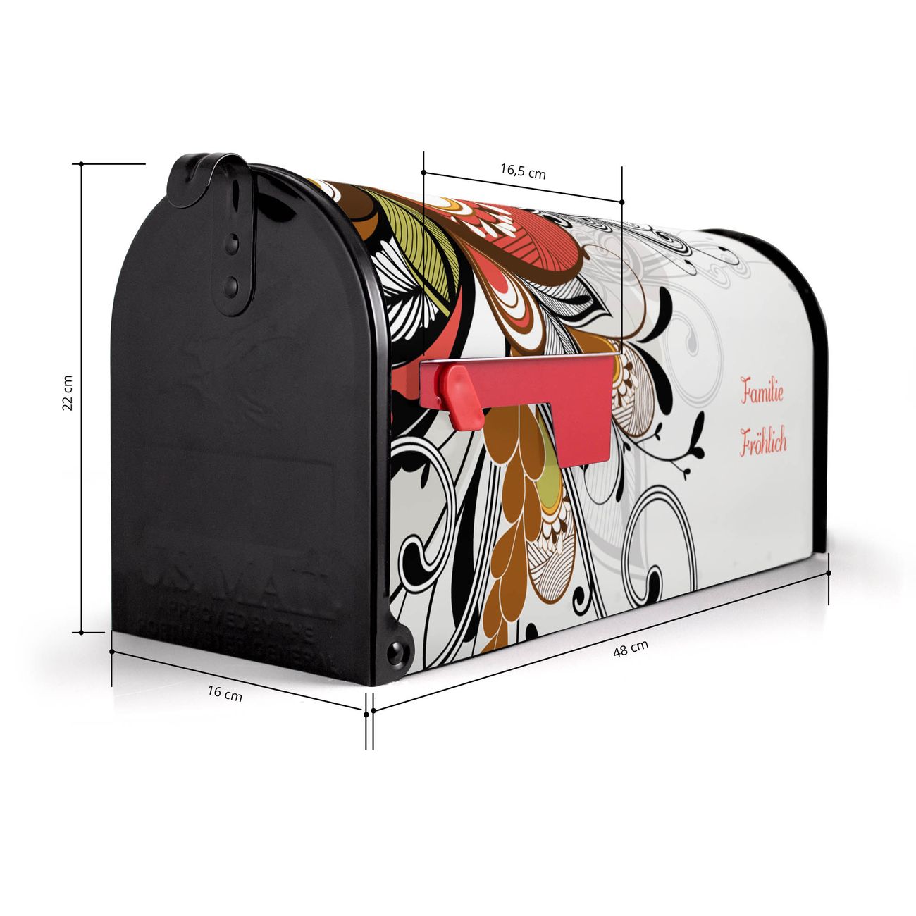 Der amerikanische Briefkasten von banjado mit Ornament 2 Motiv bietet Ihnen ausreichend Fassungsvermögen, um große A4 Sendungen und Zeitschriften zu empfangen. Die typisch amerikanische rote Fahne zeigt Ihnen an, wenn Sie Post erhalten haben. Die US-Mailbox besteht aus verzinktem Stahlblech welches lackiert wurde und ist 48 x 22 x 16 CM (BxHxT) groß. Die Folie mit Motiv Ornament 2 besteht aus einer wetter- und UV-resistenten Folie, die mit einem Schutzlaminat überzogen ist, sodass die US Mailbox zusätzlich vor Kratzern geschützt ist. An der Unterkante sind 4 Löcher je Seite um die Mailbox, typisch amerikanisch, an einem Holzpfahl oder einem Zaun zu befestigen. Auf Wunsch können Sie bei uns den passenden Standfuß oder die passende Wandhalterung kaufen um die US-Mailbox sicher zu befestigen. Wir bieten Ihnen ebenfalls Namensschilder, bereits beschriftet oder frei zu beschriften, und verschiedene selbst gestaltete Bitte-Keine-Werbung-Aufkleber.