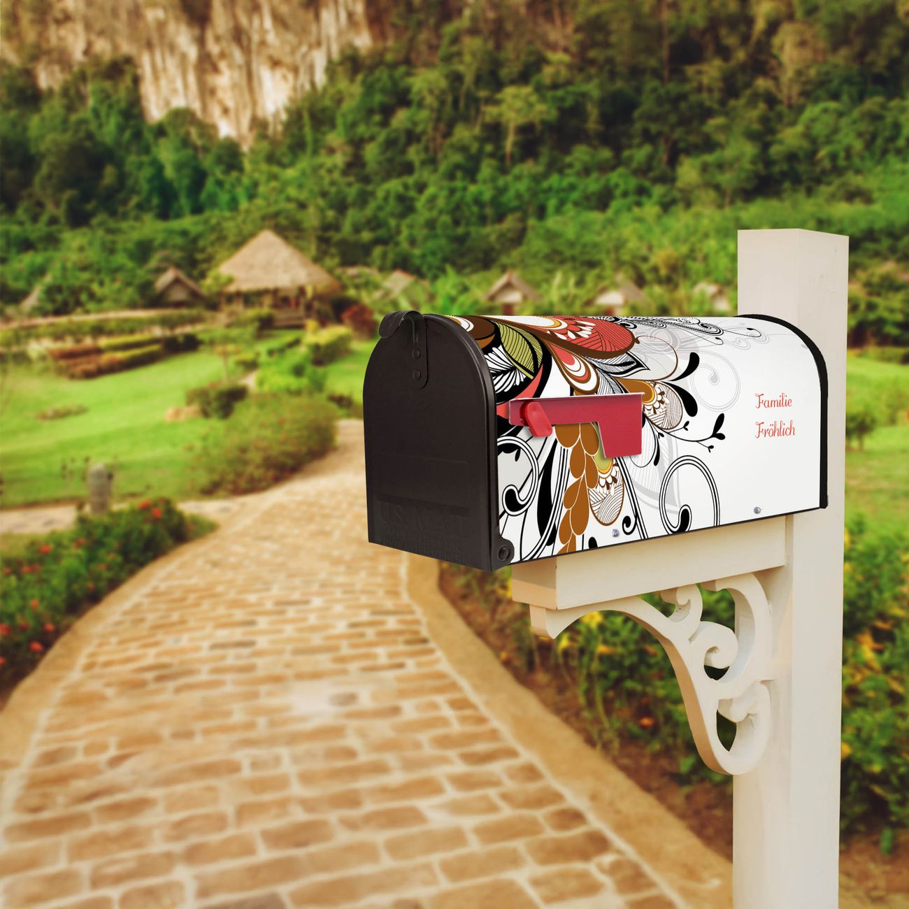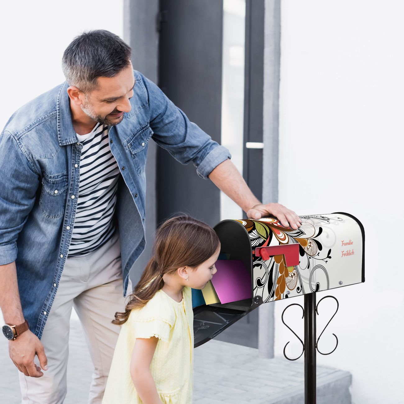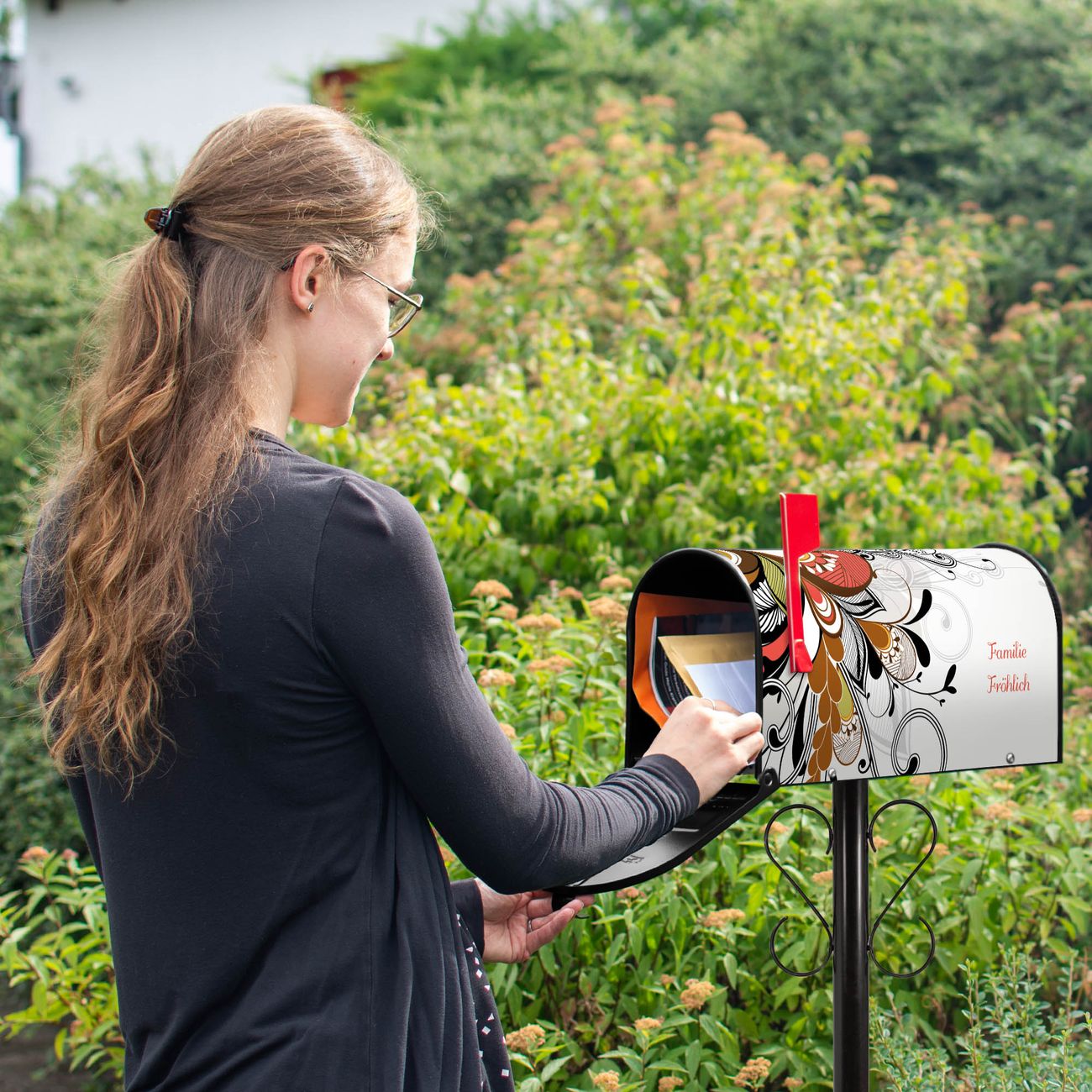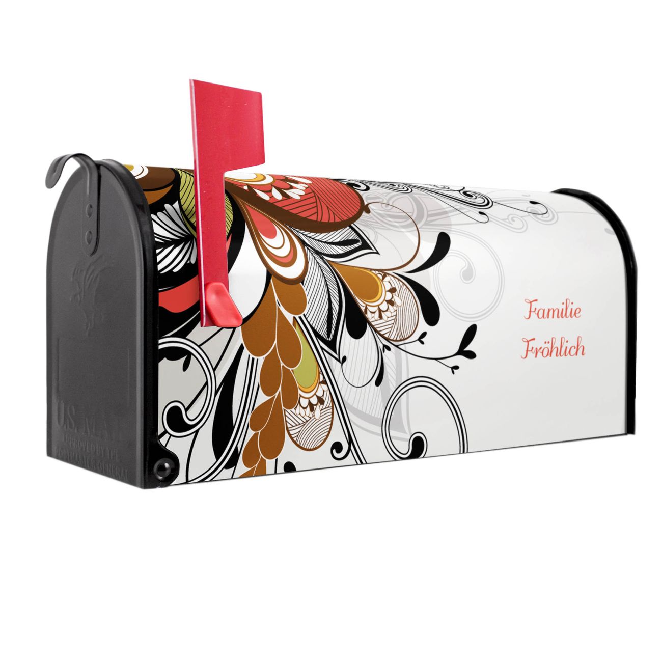 Der amerikanische Briefkasten von banjado mit Ornament 2 Motiv bietet Ihnen ausreichend Fassungsvermögen, um große A4 Sendungen und Zeitschriften zu empfangen. Die typisch amerikanische rote Fahne zeigt Ihnen an, wenn Sie Post erhalten haben. Die US-Mailbox besteht aus verzinktem Stahlblech welches lackiert wurde und ist 48 x 22 x 16 CM (BxHxT) groß. Die Folie mit Motiv Ornament 2 besteht aus einer wetter- und UV-resistenten Folie, die mit einem Schutzlaminat überzogen ist, sodass die US Mailbox zusätzlich vor Kratzern geschützt ist. An der Unterkante sind 4 Löcher je Seite um die Mailbox, typisch amerikanisch, an einem Holzpfahl oder einem Zaun zu befestigen. Auf Wunsch können Sie bei uns den passenden Standfuß oder die passende Wandhalterung kaufen um die US-Mailbox sicher zu befestigen. Wir bieten Ihnen ebenfalls Namensschilder, bereits beschriftet oder frei zu beschriften, und verschiedene selbst gestaltete Bitte-Keine-Werbung-Aufkleber.