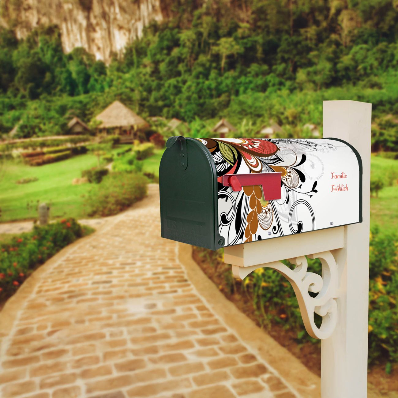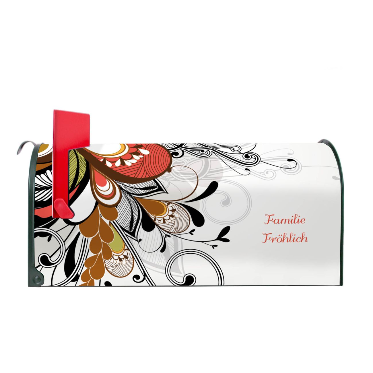 Der amerikanische Briefkasten von banjado mit WT Ornament 2 Motiv bietet Ihnen ausreichend Fassungsvermögen, um große A4 Sendungen und Zeitschriften zu empfangen. Die typisch amerikanische rote Fahne zeigt Ihnen an, wenn Sie Post erhalten haben. Die US-Mailbox besteht aus verzinktem Stahlblech welches lackiert wurde und ist 48 x 22 x 16 CM (BxHxT) groß. Die Folie mit Motiv WT Ornament 2 besteht aus einer wetter- und UV-resistenten Folie, die mit einem Schutzlaminat überzogen ist, sodass die US Mailbox zusätzlich vor Kratzern geschützt ist. An der Unterkante sind 4 Löcher je Seite um die Mailbox, typisch amerikanisch, an einem Holzpfahl oder einem Zaun zu befestigen. Auf Wunsch können Sie bei uns den passenden Standfuß oder die passende Wandhalterung kaufen um die US-Mailbox sicher zu befestigen. Wir bieten Ihnen ebenfalls Namensschilder, bereits beschriftet oder frei zu beschriften, und verschiedene selbst gestaltete Bitte-Keine-Werbung-Aufkleber.