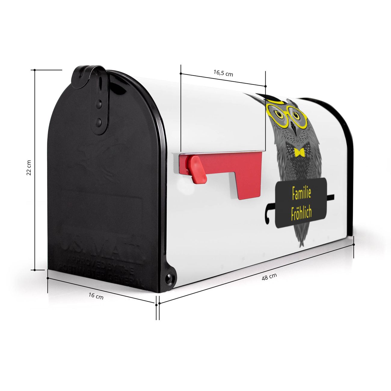 Der amerikanische Briefkasten von banjado mit Owling Motiv bietet Ihnen ausreichend Fassungsvermögen, um große A4 Sendungen und Zeitschriften zu empfangen. Die typisch amerikanische rote Fahne zeigt Ihnen an, wenn Sie Post erhalten haben. Die US-Mailbox besteht aus verzinktem Stahlblech welches lackiert wurde und ist 48 x 22 x 16 CM (BxHxT) groß. Die Folie mit Motiv Owling besteht aus einer wetter- und UV-resistenten Folie, die mit einem Schutzlaminat überzogen ist, sodass die US Mailbox zusätzlich vor Kratzern geschützt ist. An der Unterkante sind 4 Löcher je Seite um die Mailbox, typisch amerikanisch, an einem Holzpfahl oder einem Zaun zu befestigen. Auf Wunsch können Sie bei uns den passenden Standfuß oder die passende Wandhalterung kaufen um die US-Mailbox sicher zu befestigen. Wir bieten Ihnen ebenfalls Namensschilder, bereits beschriftet oder frei zu beschriften, und verschiedene selbst gestaltete Bitte-Keine-Werbung-Aufkleber.