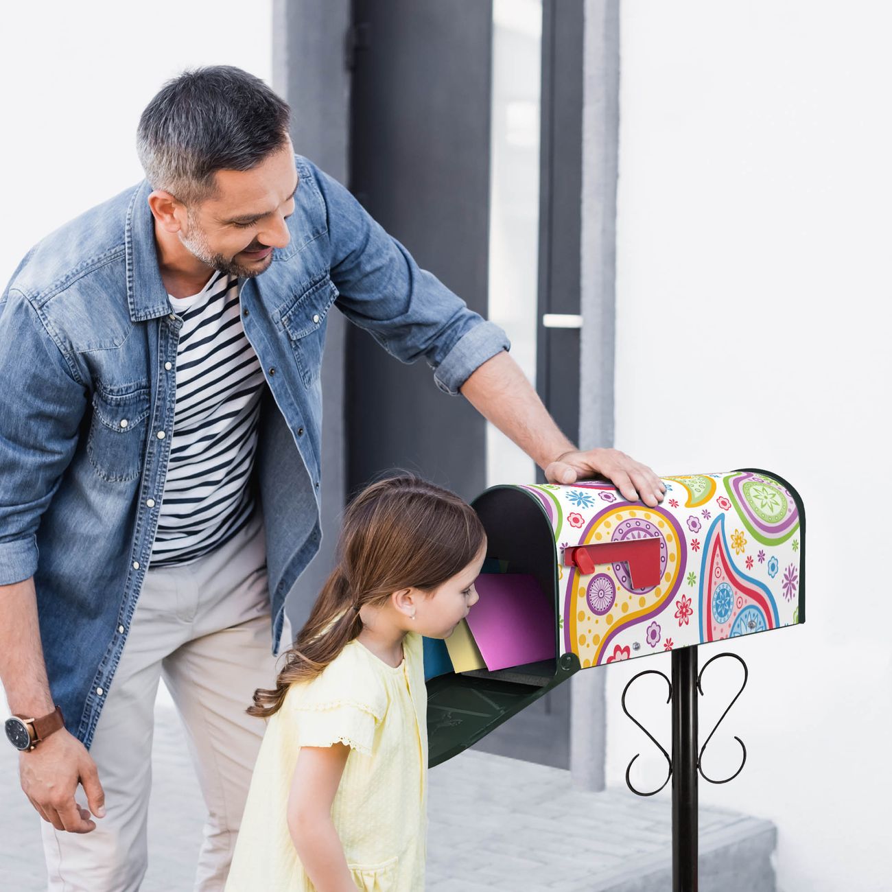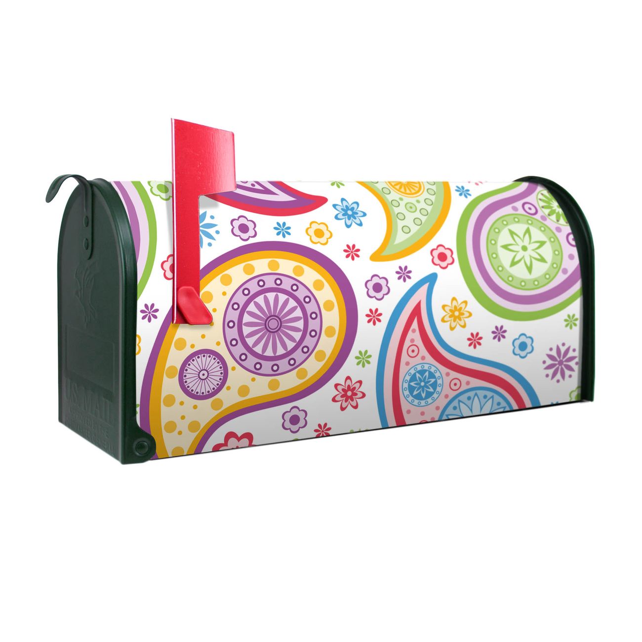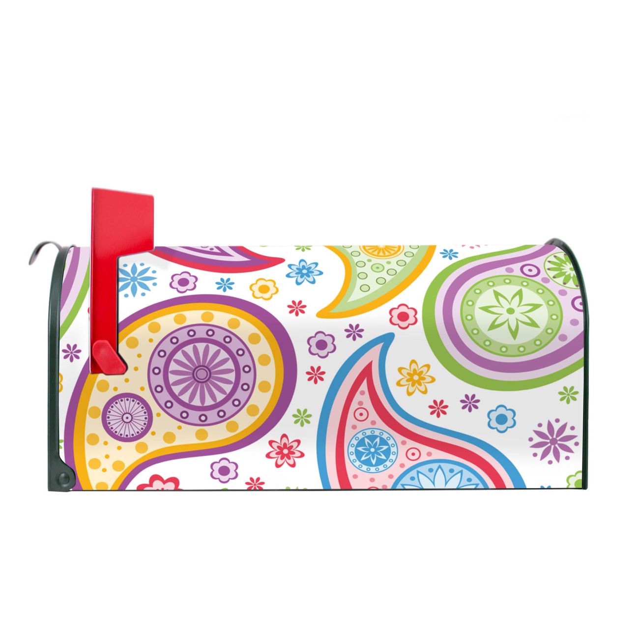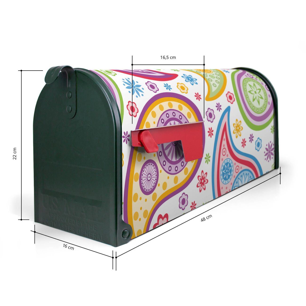 Der amerikanische Briefkasten von banjado mit Paisley bunt Motiv bietet Ihnen ausreichend Fassungsvermögen, um große A4 Sendungen und Zeitschriften zu empfangen. Die typisch amerikanische rote Fahne zeigt Ihnen an, wenn Sie Post erhalten haben. Die US-Mailbox besteht aus verzinktem Stahlblech welches lackiert wurde und ist 48 x 22 x 16 CM (BxHxT) groß. Die Folie mit Motiv Paisley bunt besteht aus einer wetter- und UV-resistenten Folie, die mit einem Schutzlaminat überzogen ist, sodass die US Mailbox zusätzlich vor Kratzern geschützt ist. An der Unterkante sind 4 Löcher je Seite um die Mailbox, typisch amerikanisch, an einem Holzpfahl oder einem Zaun zu befestigen. Auf Wunsch können Sie bei uns den passenden Standfuß oder die passende Wandhalterung kaufen um die US-Mailbox sicher zu befestigen. Wir bieten Ihnen ebenfalls Namensschilder, bereits beschriftet oder frei zu beschriften, und verschiedene selbst gestaltete Bitte-Keine-Werbung-Aufkleber.