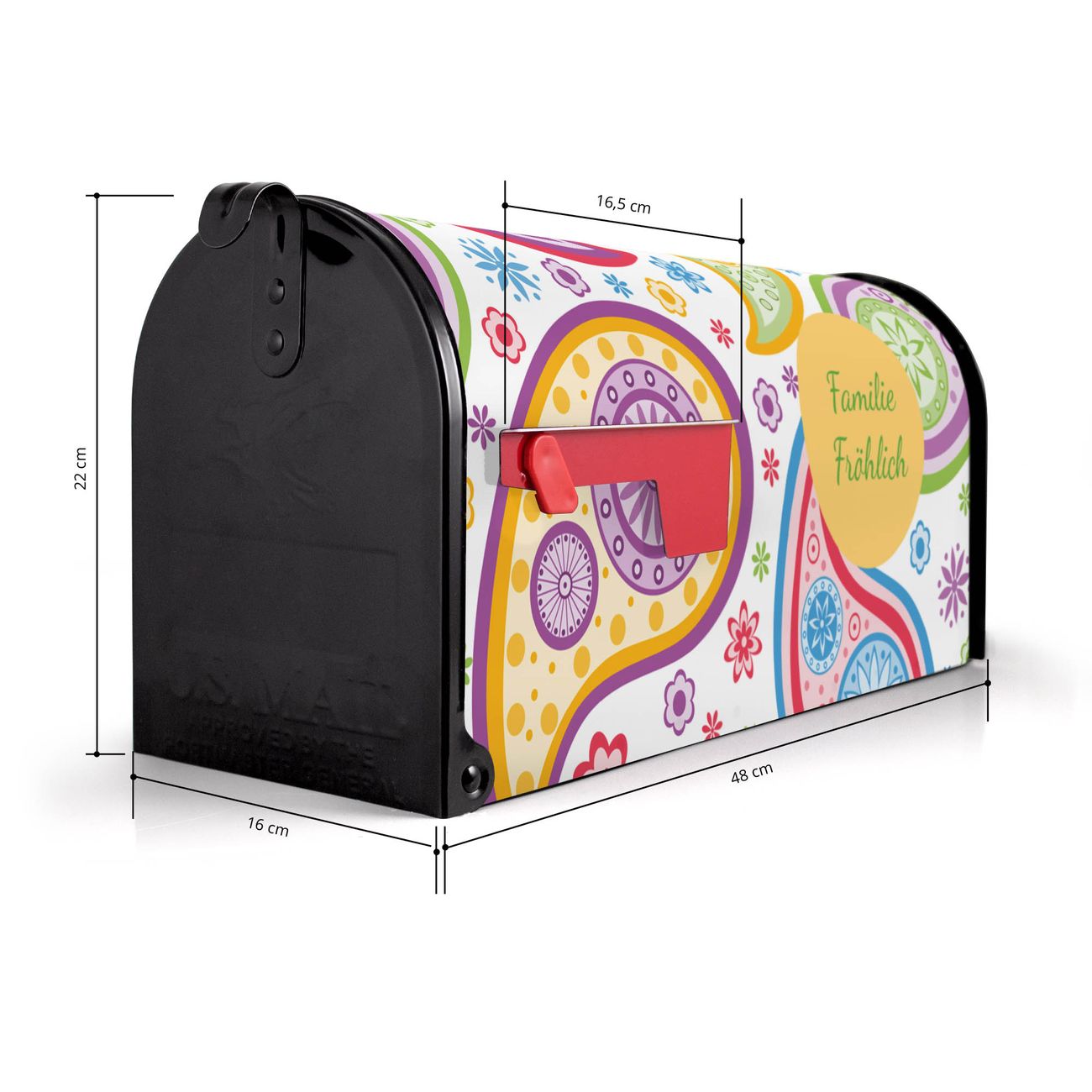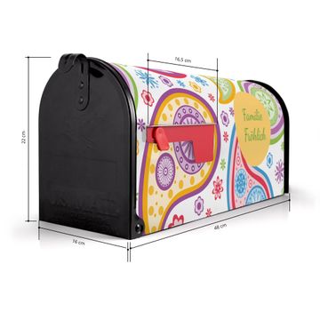 Der amerikanische Briefkasten von banjado mit Paisley bunt Motiv bietet Ihnen ausreichend Fassungsvermögen, um große A4 Sendungen und Zeitschriften zu empfangen. Die typisch amerikanische rote Fahne zeigt Ihnen an, wenn Sie Post erhalten haben. Die US-Mailbox besteht aus verzinktem Stahlblech welches lackiert wurde und ist 48 x 22 x 16 CM (BxHxT) groß. Die Folie mit Motiv Paisley bunt besteht aus einer wetter- und UV-resistenten Folie, die mit einem Schutzlaminat überzogen ist, sodass die US Mailbox zusätzlich vor Kratzern geschützt ist. An der Unterkante sind 4 Löcher je Seite um die Mailbox, typisch amerikanisch, an einem Holzpfahl oder einem Zaun zu befestigen. Auf Wunsch können Sie bei uns den passenden Standfuß oder die passende Wandhalterung kaufen um die US-Mailbox sicher zu befestigen. Wir bieten Ihnen ebenfalls Namensschilder, bereits beschriftet oder frei zu beschriften, und verschiedene selbst gestaltete Bitte-Keine-Werbung-Aufkleber.