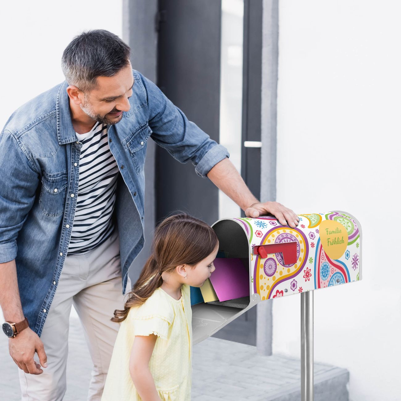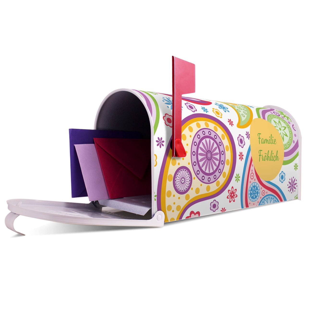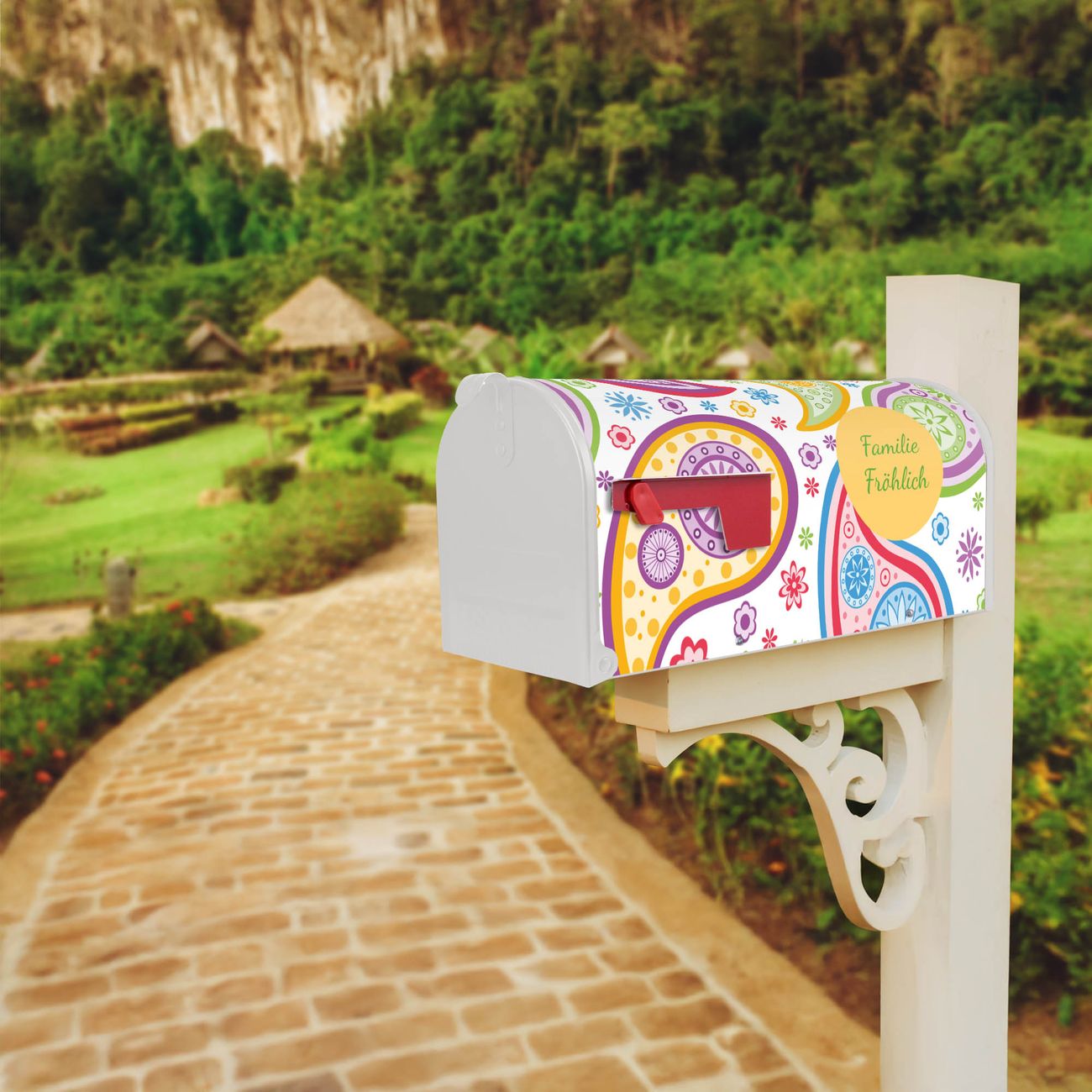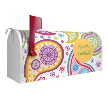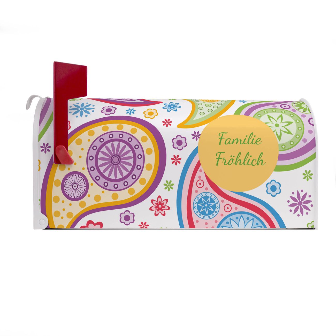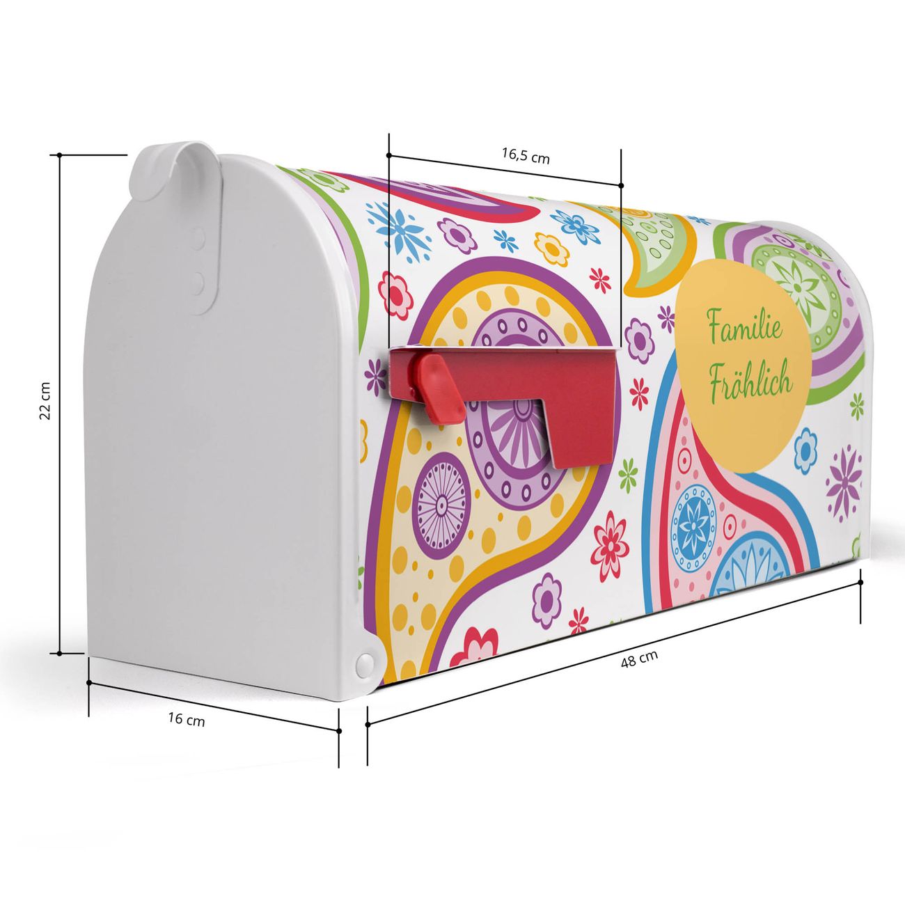 Der amerikanische Briefkasten von banjado mit Paisley bunt Motiv bietet Ihnen ausreichend Fassungsvermögen, um große A4 Sendungen und Zeitschriften zu empfangen. Die typisch amerikanische rote Fahne zeigt Ihnen an, wenn Sie Post erhalten haben. Die US-Mailbox besteht aus verzinktem Stahlblech welches lackiert wurde und ist 48 x 22 x 16 CM (BxHxT) groß. Die Folie mit Motiv Paisley bunt besteht aus einer wetter- und UV-resistenten Folie, die mit einem Schutzlaminat überzogen ist, sodass die US Mailbox zusätzlich vor Kratzern geschützt ist. An der Unterkante sind 4 Löcher je Seite um die Mailbox, typisch amerikanisch, an einem Holzpfahl oder einem Zaun zu befestigen. Auf Wunsch können Sie bei uns den passenden Standfuß oder die passende Wandhalterung kaufen um die US-Mailbox sicher zu befestigen. Wir bieten Ihnen ebenfalls Namensschilder, bereits beschriftet oder frei zu beschriften, und verschiedene selbst gestaltete Bitte-Keine-Werbung-Aufkleber.