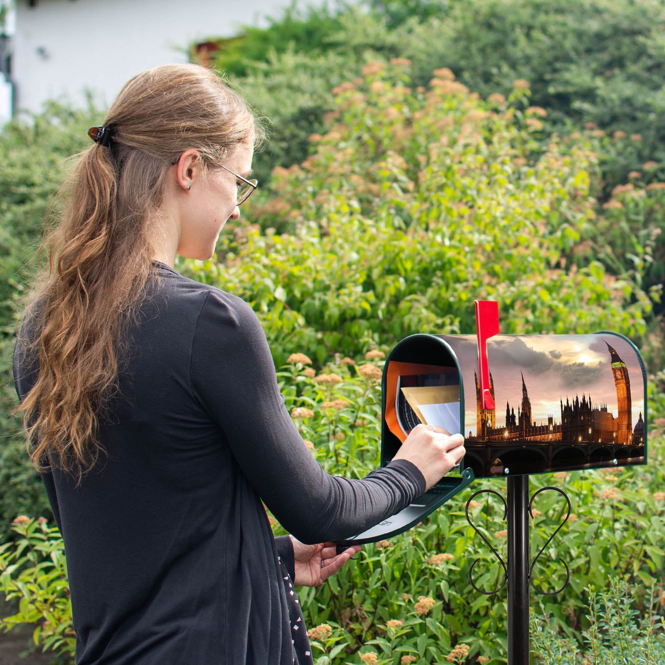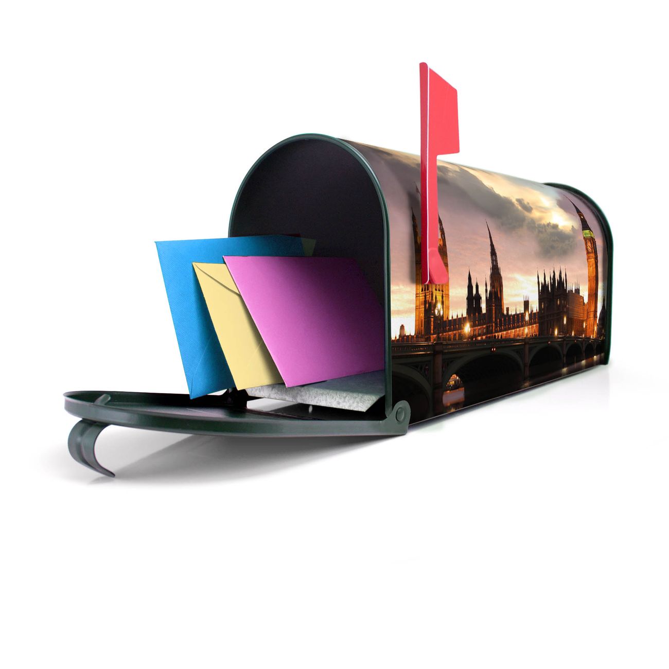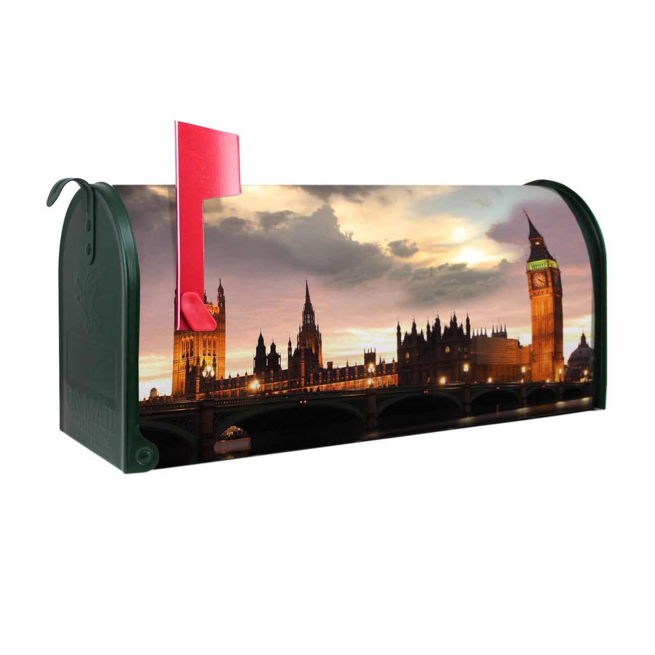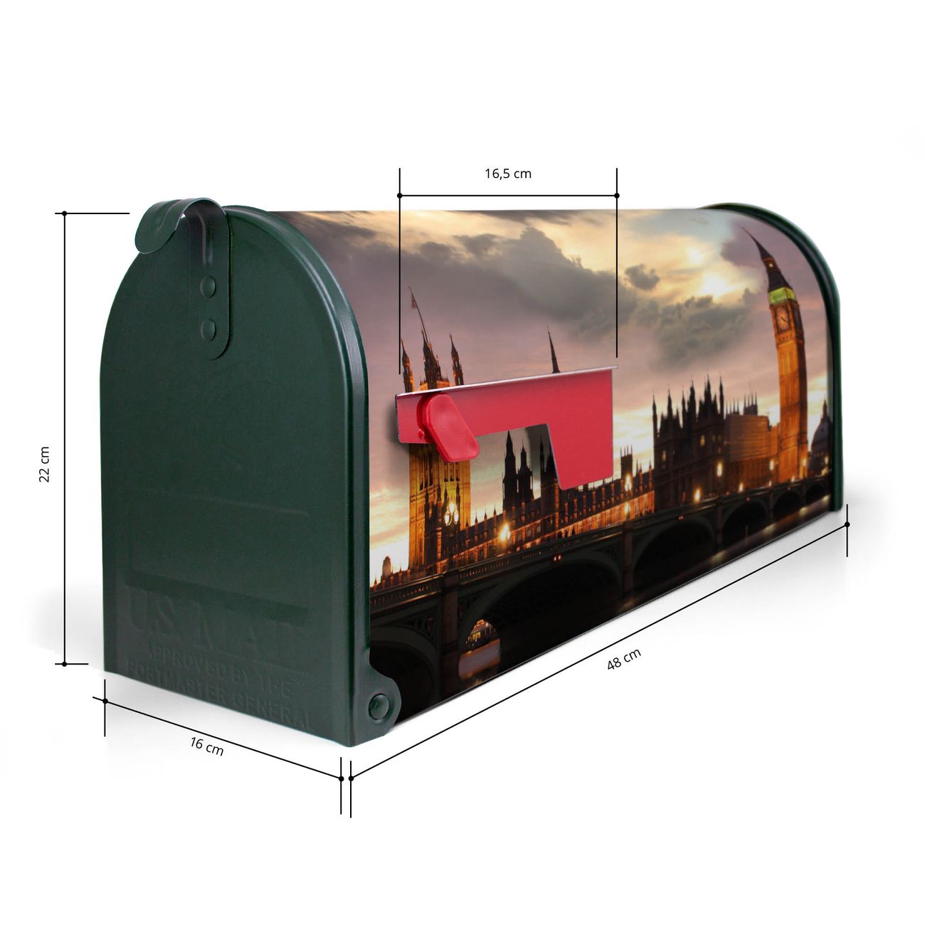 Der amerikanische Briefkasten von banjado mit Palace of Westminster Motiv bietet Ihnen ausreichend Fassungsvermögen, um große A4 Sendungen und Zeitschriften zu empfangen. Die typisch amerikanische rote Fahne zeigt Ihnen an, wenn Sie Post erhalten haben. Die US-Mailbox besteht aus verzinktem Stahlblech welches lackiert wurde und ist 48 x 22 x 16 CM (BxHxT) groß. Die Folie mit Motiv Palace of Westminster besteht aus einer wetter- und UV-resistenten Folie, die mit einem Schutzlaminat überzogen ist, sodass die US Mailbox zusätzlich vor Kratzern geschützt ist. An der Unterkante sind 4 Löcher je Seite um die Mailbox, typisch amerikanisch, an einem Holzpfahl oder einem Zaun zu befestigen. Auf Wunsch können Sie bei uns den passenden Standfuß oder die passende Wandhalterung kaufen um die US-Mailbox sicher zu befestigen. Wir bieten Ihnen ebenfalls Namensschilder, bereits beschriftet oder frei zu beschriften, und verschiedene selbst gestaltete Bitte-Keine-Werbung-Aufkleber.