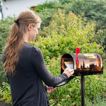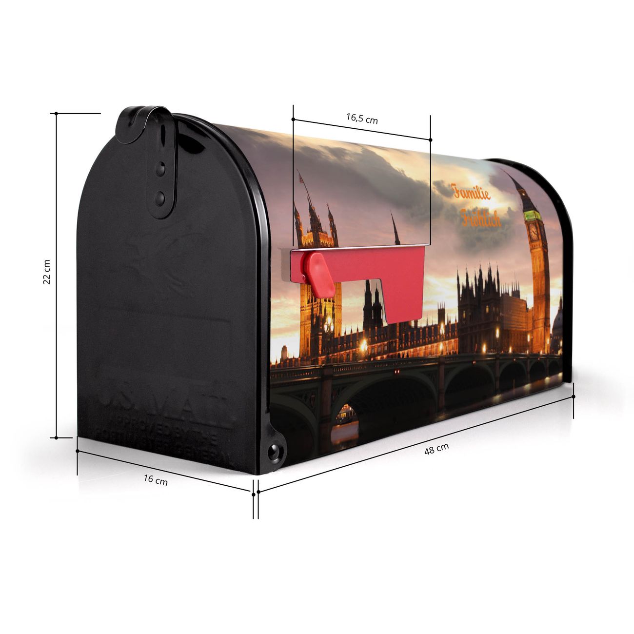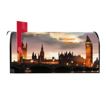 Der amerikanische Briefkasten von banjado mit Palace of Westminster Motiv bietet Ihnen ausreichend Fassungsvermögen, um große A4 Sendungen und Zeitschriften zu empfangen. Die typisch amerikanische rote Fahne zeigt Ihnen an, wenn Sie Post erhalten haben. Die US-Mailbox besteht aus verzinktem Stahlblech welches lackiert wurde und ist 48 x 22 x 16 CM (BxHxT) groß. Die Folie mit Motiv Palace of Westminster besteht aus einer wetter- und UV-resistenten Folie, die mit einem Schutzlaminat überzogen ist, sodass die US Mailbox zusätzlich vor Kratzern geschützt ist. An der Unterkante sind 4 Löcher je Seite um die Mailbox, typisch amerikanisch, an einem Holzpfahl oder einem Zaun zu befestigen. Auf Wunsch können Sie bei uns den passenden Standfuß oder die passende Wandhalterung kaufen um die US-Mailbox sicher zu befestigen. Wir bieten Ihnen ebenfalls Namensschilder, bereits beschriftet oder frei zu beschriften, und verschiedene selbst gestaltete Bitte-Keine-Werbung-Aufkleber.