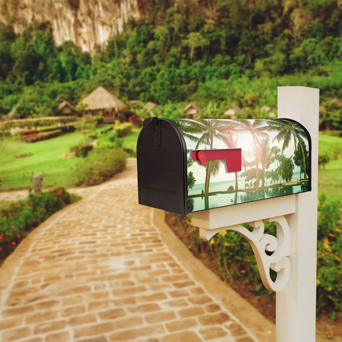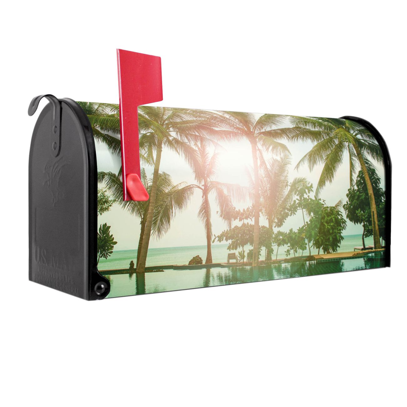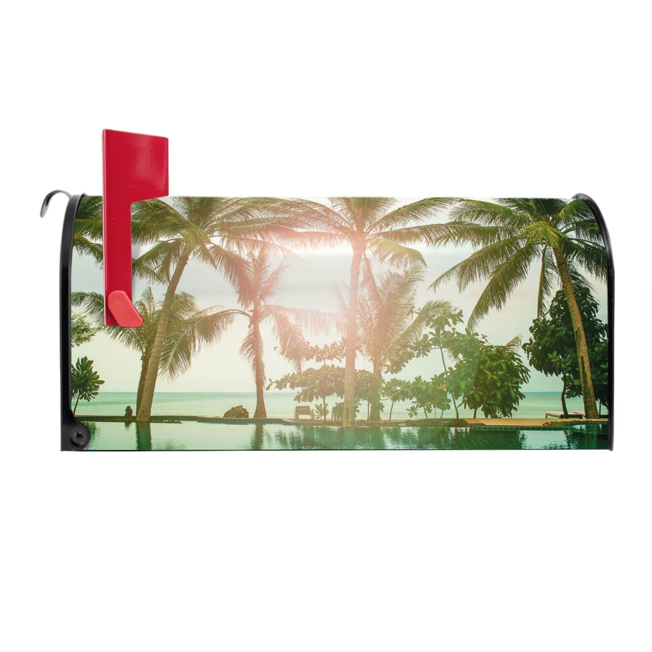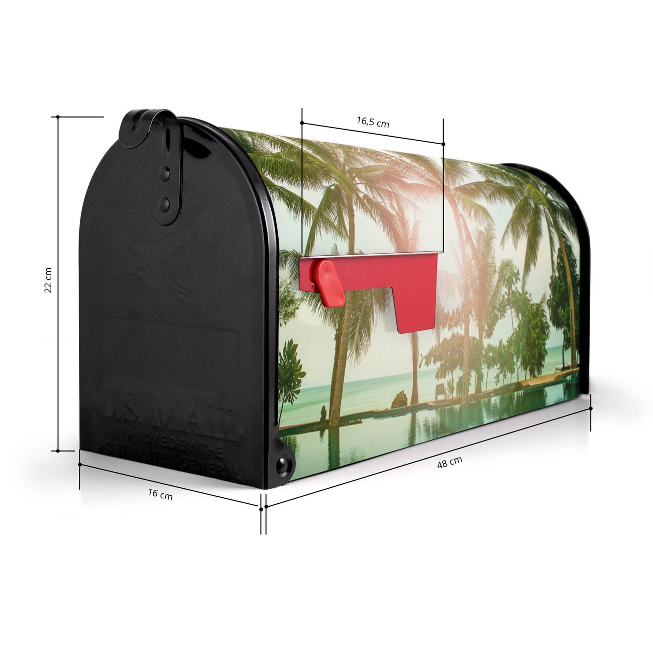 Der amerikanische Briefkasten von banjado mit Palmen Motiv bietet Ihnen ausreichend Fassungsvermögen, um große A4 Sendungen und Zeitschriften zu empfangen. Die typisch amerikanische rote Fahne zeigt Ihnen an, wenn Sie Post erhalten haben. Die US-Mailbox besteht aus verzinktem Stahlblech welches lackiert wurde und ist 48 x 22 x 16 CM (BxHxT) groß. Die Folie mit Motiv Palmen besteht aus einer wetter- und UV-resistenten Folie, die mit einem Schutzlaminat überzogen ist, sodass die US Mailbox zusätzlich vor Kratzern geschützt ist. An der Unterkante sind 4 Löcher je Seite um die Mailbox, typisch amerikanisch, an einem Holzpfahl oder einem Zaun zu befestigen. Auf Wunsch können Sie bei uns den passenden Standfuß oder die passende Wandhalterung kaufen um die US-Mailbox sicher zu befestigen. Wir bieten Ihnen ebenfalls Namensschilder, bereits beschriftet oder frei zu beschriften, und verschiedene selbst gestaltete Bitte-Keine-Werbung-Aufkleber.