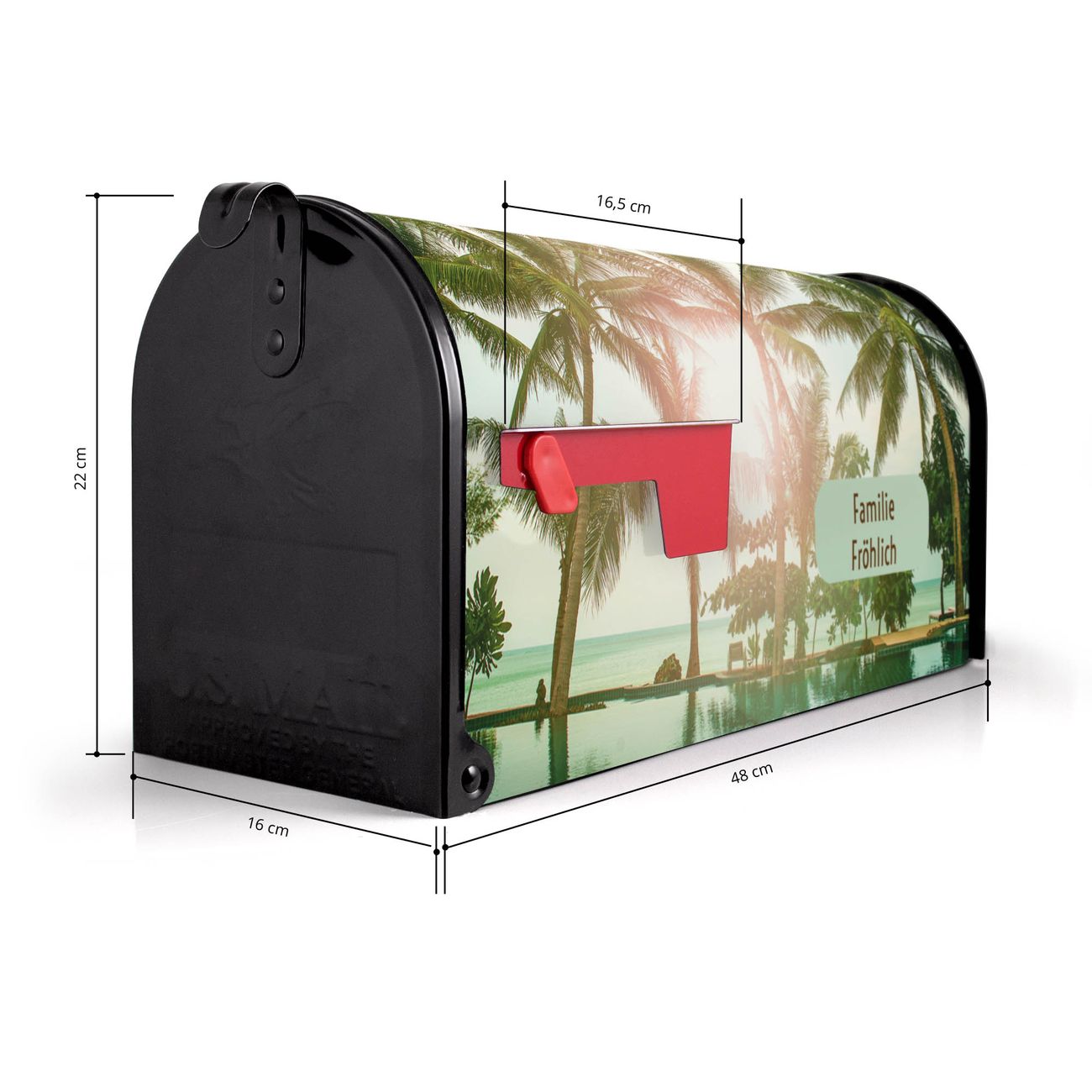 Der amerikanische Briefkasten von banjado mit Palmen Motiv bietet Ihnen ausreichend Fassungsvermögen, um große A4 Sendungen und Zeitschriften zu empfangen. Die typisch amerikanische rote Fahne zeigt Ihnen an, wenn Sie Post erhalten haben. Die US-Mailbox besteht aus verzinktem Stahlblech welches lackiert wurde und ist 48 x 22 x 16 CM (BxHxT) groß. Die Folie mit Motiv Palmen besteht aus einer wetter- und UV-resistenten Folie, die mit einem Schutzlaminat überzogen ist, sodass die US Mailbox zusätzlich vor Kratzern geschützt ist. An der Unterkante sind 4 Löcher je Seite um die Mailbox, typisch amerikanisch, an einem Holzpfahl oder einem Zaun zu befestigen. Auf Wunsch können Sie bei uns den passenden Standfuß oder die passende Wandhalterung kaufen um die US-Mailbox sicher zu befestigen. Wir bieten Ihnen ebenfalls Namensschilder, bereits beschriftet oder frei zu beschriften, und verschiedene selbst gestaltete Bitte-Keine-Werbung-Aufkleber.