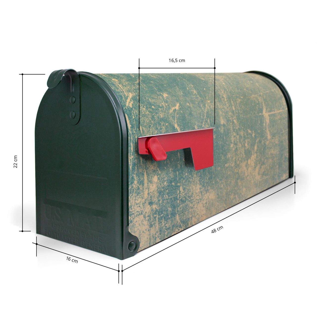 Der amerikanische Briefkasten von banjado mit Patina Grün Motiv bietet Ihnen ausreichend Fassungsvermögen, um große A4 Sendungen und Zeitschriften zu empfangen. Die typisch amerikanische rote Fahne zeigt Ihnen an, wenn Sie Post erhalten haben. Die US-Mailbox besteht aus verzinktem Stahlblech welches lackiert wurde und ist 48 x 22 x 16 CM (BxHxT) groß. Die Folie mit Motiv Patina Grün besteht aus einer wetter- und UV-resistenten Folie, die mit einem Schutzlaminat überzogen ist, sodass die US Mailbox zusätzlich vor Kratzern geschützt ist. An der Unterkante sind 4 Löcher je Seite um die Mailbox, typisch amerikanisch, an einem Holzpfahl oder einem Zaun zu befestigen. Auf Wunsch können Sie bei uns den passenden Standfuß oder die passende Wandhalterung kaufen um die US-Mailbox sicher zu befestigen. Wir bieten Ihnen ebenfalls Namensschilder, bereits beschriftet oder frei zu beschriften, und verschiedene selbst gestaltete Bitte-Keine-Werbung-Aufkleber.