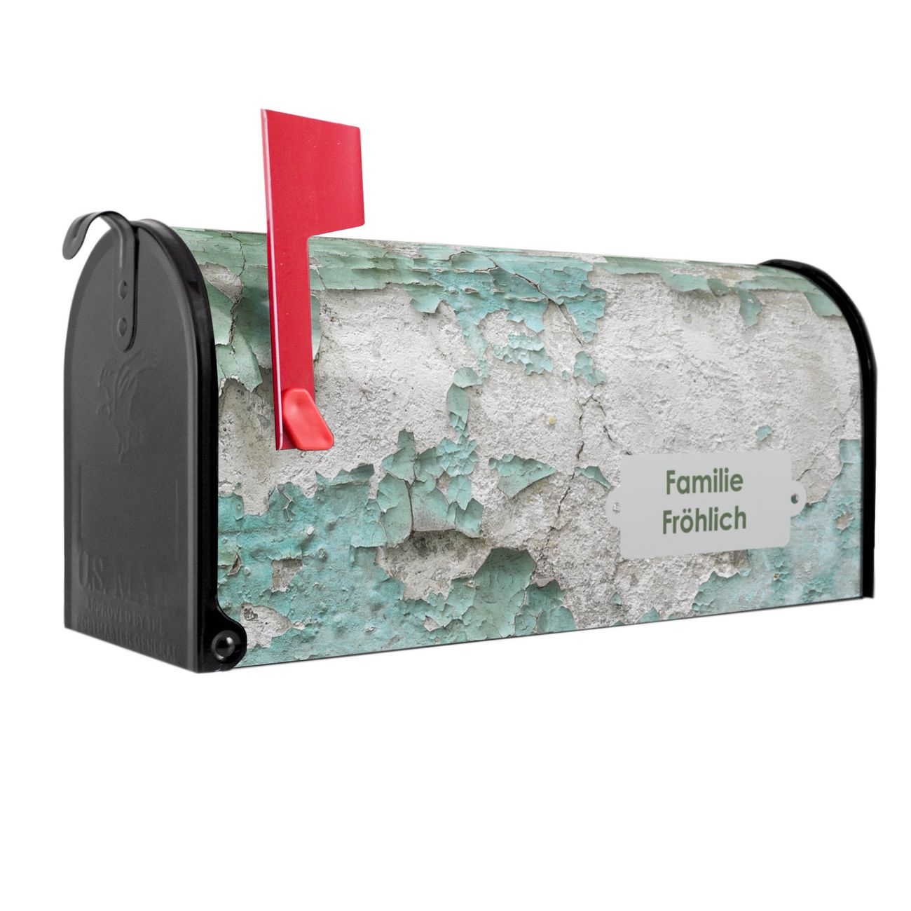 Der amerikanische Briefkasten von banjado mit Patina Mint Motiv bietet Ihnen ausreichend Fassungsvermögen, um große A4 Sendungen und Zeitschriften zu empfangen. Die typisch amerikanische rote Fahne zeigt Ihnen an, wenn Sie Post erhalten haben. Die US-Mailbox besteht aus verzinktem Stahlblech welches lackiert wurde und ist 48 x 22 x 16 CM (BxHxT) groß. Die Folie mit Motiv Patina Mint besteht aus einer wetter- und UV-resistenten Folie, die mit einem Schutzlaminat überzogen ist, sodass die US Mailbox zusätzlich vor Kratzern geschützt ist. An der Unterkante sind 4 Löcher je Seite um die Mailbox, typisch amerikanisch, an einem Holzpfahl oder einem Zaun zu befestigen. Auf Wunsch können Sie bei uns den passenden Standfuß oder die passende Wandhalterung kaufen um die US-Mailbox sicher zu befestigen. Wir bieten Ihnen ebenfalls Namensschilder, bereits beschriftet oder frei zu beschriften, und verschiedene selbst gestaltete Bitte-Keine-Werbung-Aufkleber.