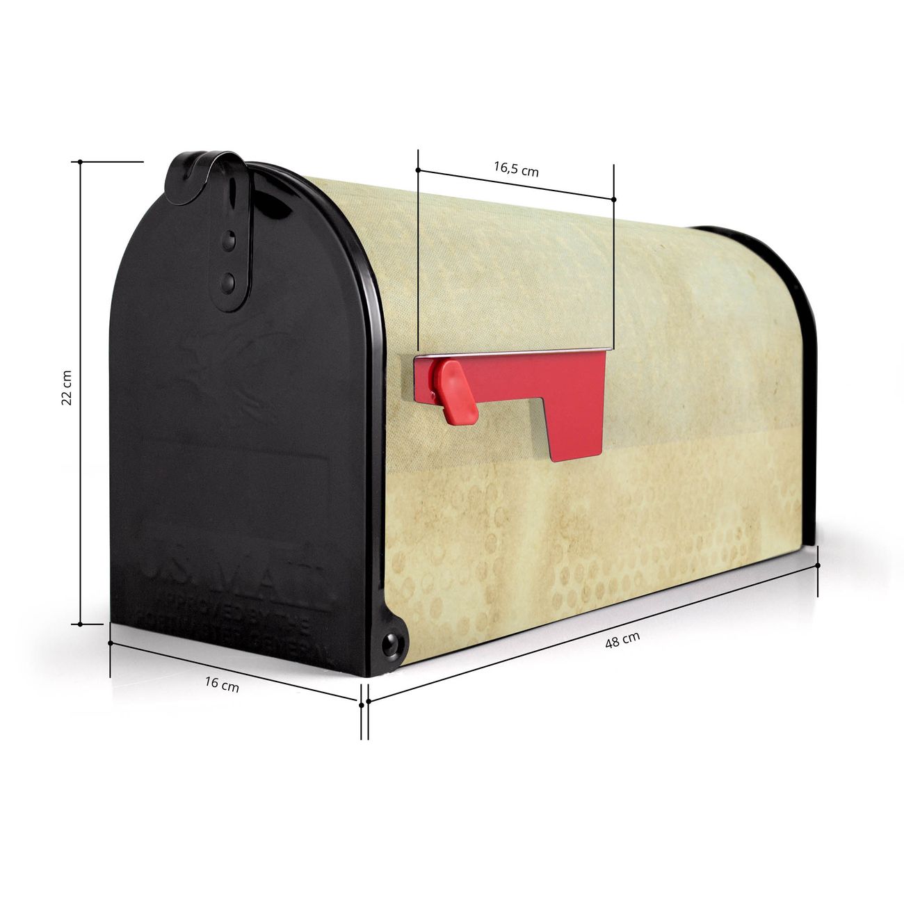 Der amerikanische Briefkasten von banjado mit Patina Papier Motiv bietet Ihnen ausreichend Fassungsvermögen, um große A4 Sendungen und Zeitschriften zu empfangen. Die typisch amerikanische rote Fahne zeigt Ihnen an, wenn Sie Post erhalten haben. Die US-Mailbox besteht aus verzinktem Stahlblech welches lackiert wurde und ist 48 x 22 x 16 CM (BxHxT) groß. Die Folie mit Motiv Patina Papier besteht aus einer wetter- und UV-resistenten Folie, die mit einem Schutzlaminat überzogen ist, sodass die US Mailbox zusätzlich vor Kratzern geschützt ist. An der Unterkante sind 4 Löcher je Seite um die Mailbox, typisch amerikanisch, an einem Holzpfahl oder einem Zaun zu befestigen. Auf Wunsch können Sie bei uns den passenden Standfuß oder die passende Wandhalterung kaufen um die US-Mailbox sicher zu befestigen. Wir bieten Ihnen ebenfalls Namensschilder, bereits beschriftet oder frei zu beschriften, und verschiedene selbst gestaltete Bitte-Keine-Werbung-Aufkleber.