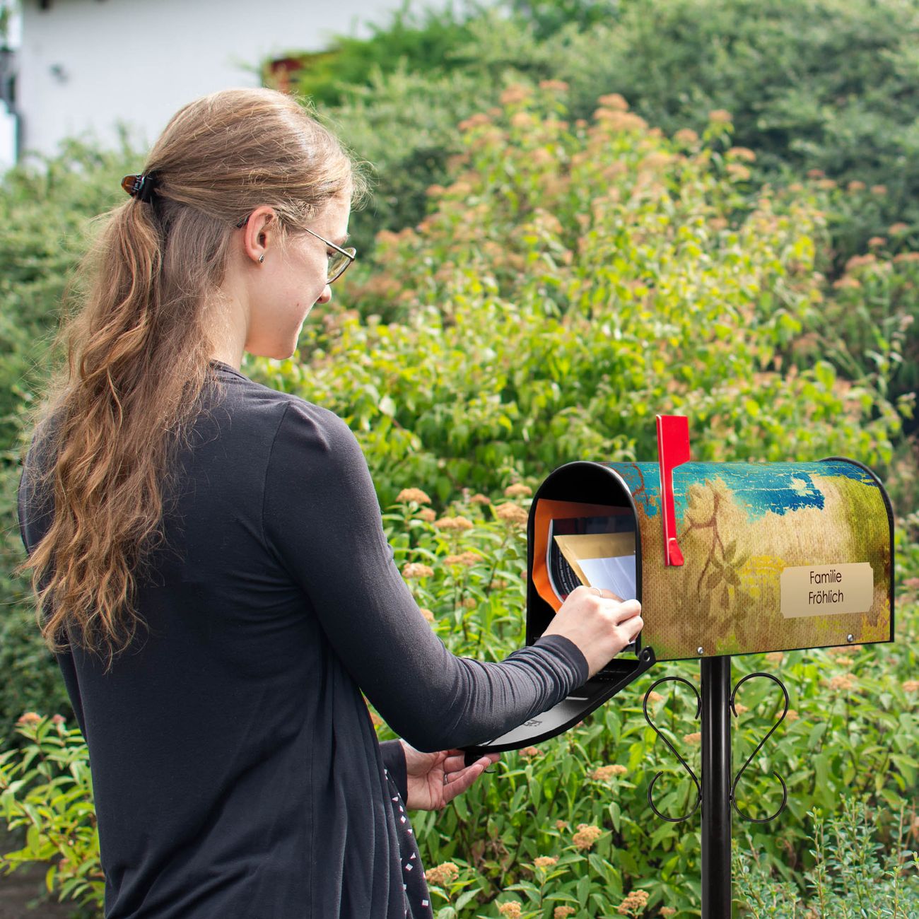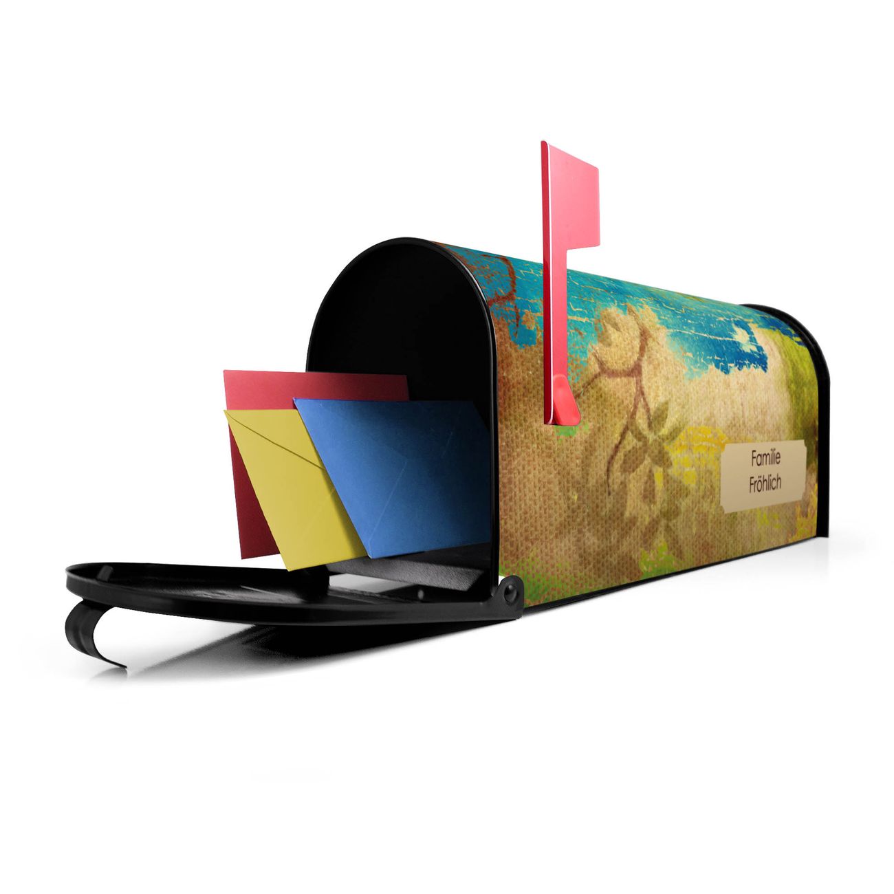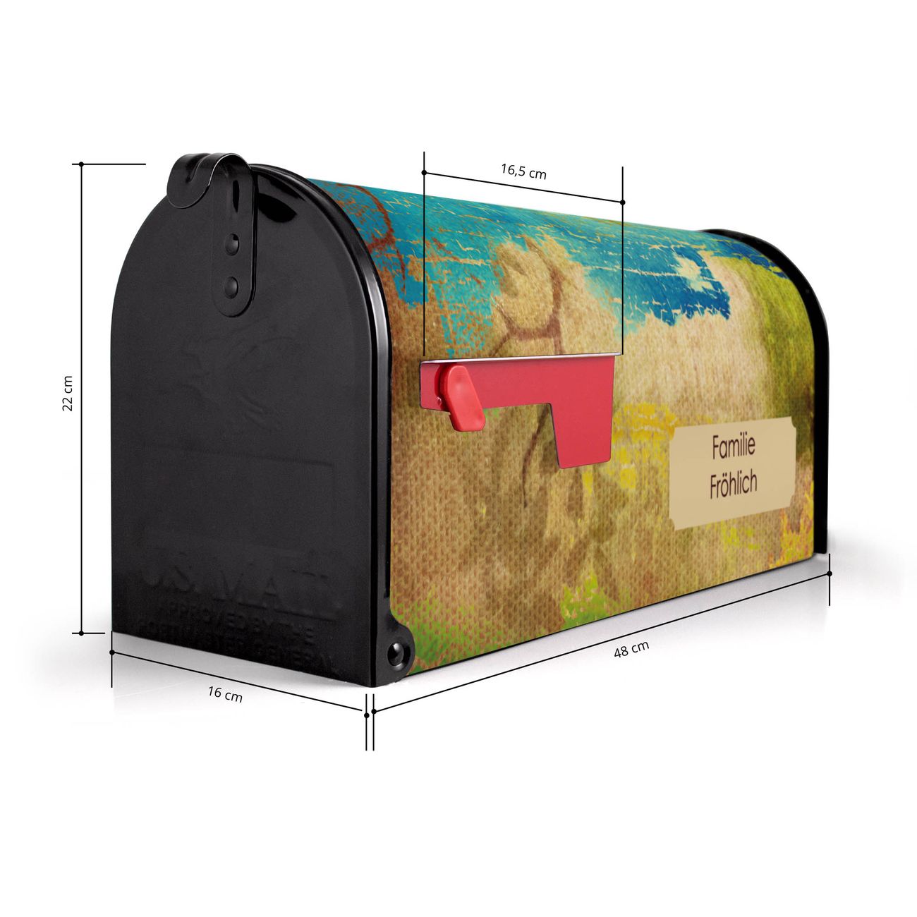 Der amerikanische Briefkasten von banjado mit Patina Motiv bietet Ihnen ausreichend Fassungsvermögen, um große A4 Sendungen und Zeitschriften zu empfangen. Die typisch amerikanische rote Fahne zeigt Ihnen an, wenn Sie Post erhalten haben. Die US-Mailbox besteht aus verzinktem Stahlblech welches lackiert wurde und ist 48 x 22 x 16 CM (BxHxT) groß. Die Folie mit Motiv Patina besteht aus einer wetter- und UV-resistenten Folie, die mit einem Schutzlaminat überzogen ist, sodass die US Mailbox zusätzlich vor Kratzern geschützt ist. An der Unterkante sind 4 Löcher je Seite um die Mailbox, typisch amerikanisch, an einem Holzpfahl oder einem Zaun zu befestigen. Auf Wunsch können Sie bei uns den passenden Standfuß oder die passende Wandhalterung kaufen um die US-Mailbox sicher zu befestigen. Wir bieten Ihnen ebenfalls Namensschilder, bereits beschriftet oder frei zu beschriften, und verschiedene selbst gestaltete Bitte-Keine-Werbung-Aufkleber.