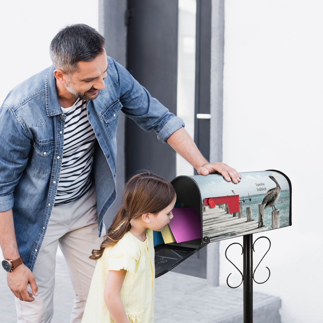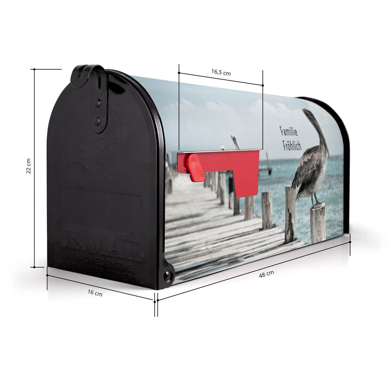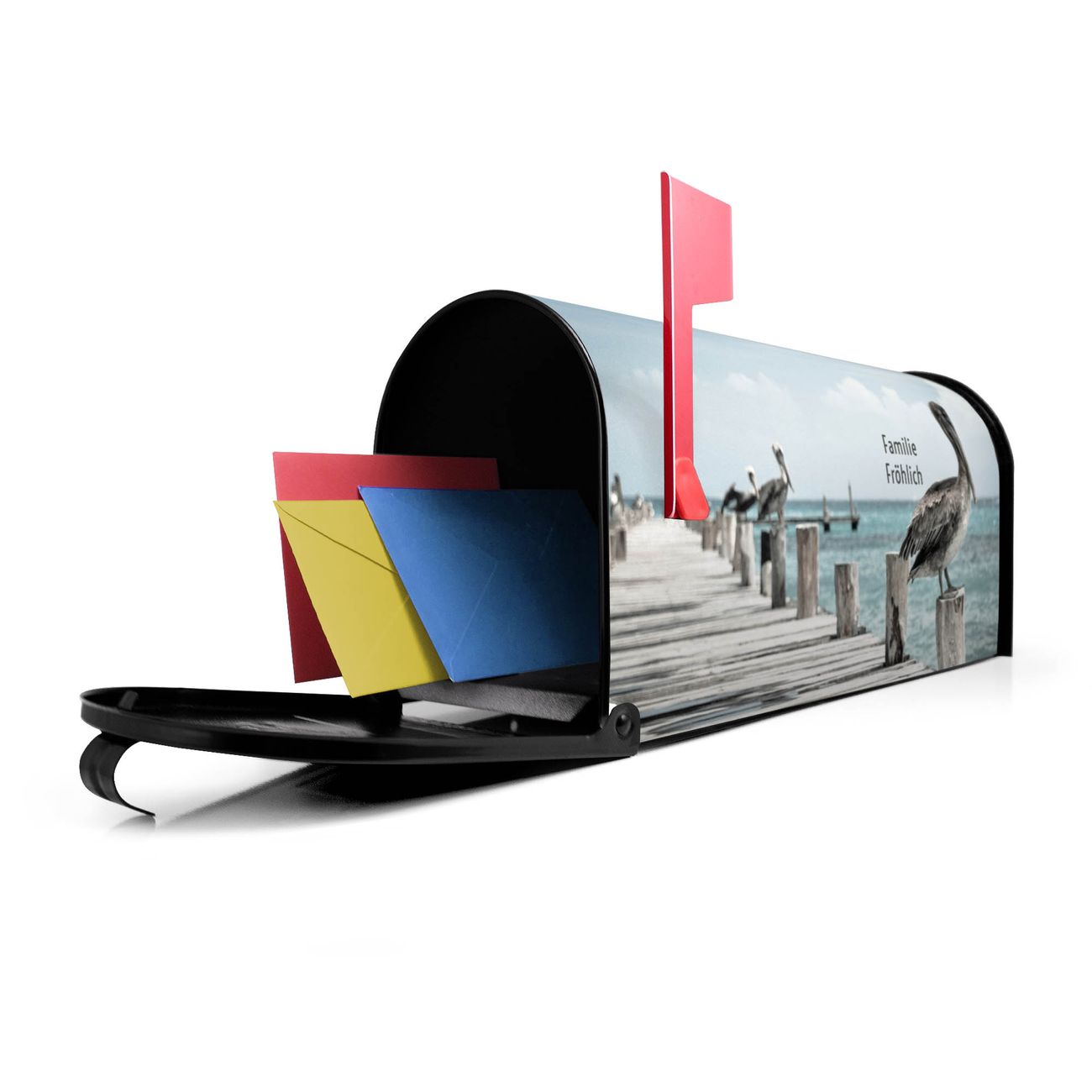 Der amerikanische Briefkasten von banjado mit Pelikane Motiv bietet Ihnen ausreichend Fassungsvermögen, um große A4 Sendungen und Zeitschriften zu empfangen. Die typisch amerikanische rote Fahne zeigt Ihnen an, wenn Sie Post erhalten haben. Die US-Mailbox besteht aus verzinktem Stahlblech welches lackiert wurde und ist 48 x 22 x 16 CM (BxHxT) groß. Die Folie mit Motiv Pelikane besteht aus einer wetter- und UV-resistenten Folie, die mit einem Schutzlaminat überzogen ist, sodass die US Mailbox zusätzlich vor Kratzern geschützt ist. An der Unterkante sind 4 Löcher je Seite um die Mailbox, typisch amerikanisch, an einem Holzpfahl oder einem Zaun zu befestigen. Auf Wunsch können Sie bei uns den passenden Standfuß oder die passende Wandhalterung kaufen um die US-Mailbox sicher zu befestigen. Wir bieten Ihnen ebenfalls Namensschilder, bereits beschriftet oder frei zu beschriften, und verschiedene selbst gestaltete Bitte-Keine-Werbung-Aufkleber.
