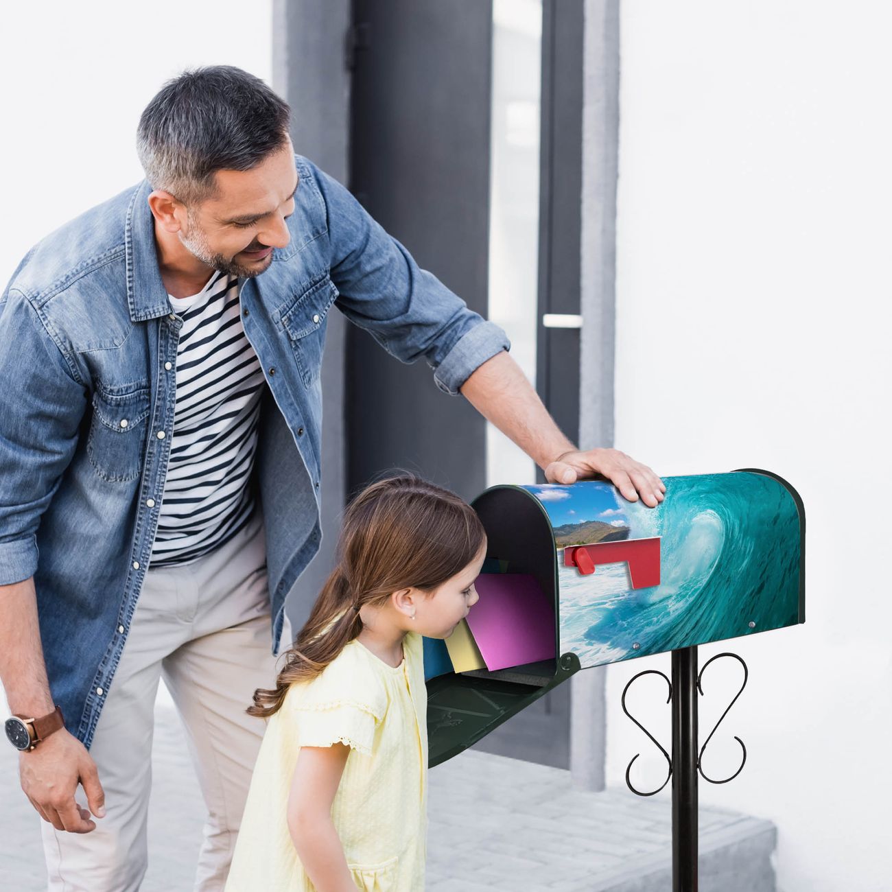 Der amerikanische Briefkasten von banjado mit Perfekte Welle Motiv bietet Ihnen ausreichend Fassungsvermögen, um große A4 Sendungen und Zeitschriften zu empfangen. Die typisch amerikanische rote Fahne zeigt Ihnen an, wenn Sie Post erhalten haben. Die US-Mailbox besteht aus verzinktem Stahlblech welches lackiert wurde und ist 48 x 22 x 16 CM (BxHxT) groß. Die Folie mit Motiv Perfekte Welle besteht aus einer wetter- und UV-resistenten Folie, die mit einem Schutzlaminat überzogen ist, sodass die US Mailbox zusätzlich vor Kratzern geschützt ist. An der Unterkante sind 4 Löcher je Seite um die Mailbox, typisch amerikanisch, an einem Holzpfahl oder einem Zaun zu befestigen. Auf Wunsch können Sie bei uns den passenden Standfuß oder die passende Wandhalterung kaufen um die US-Mailbox sicher zu befestigen. Wir bieten Ihnen ebenfalls Namensschilder, bereits beschriftet oder frei zu beschriften, und verschiedene selbst gestaltete Bitte-Keine-Werbung-Aufkleber.