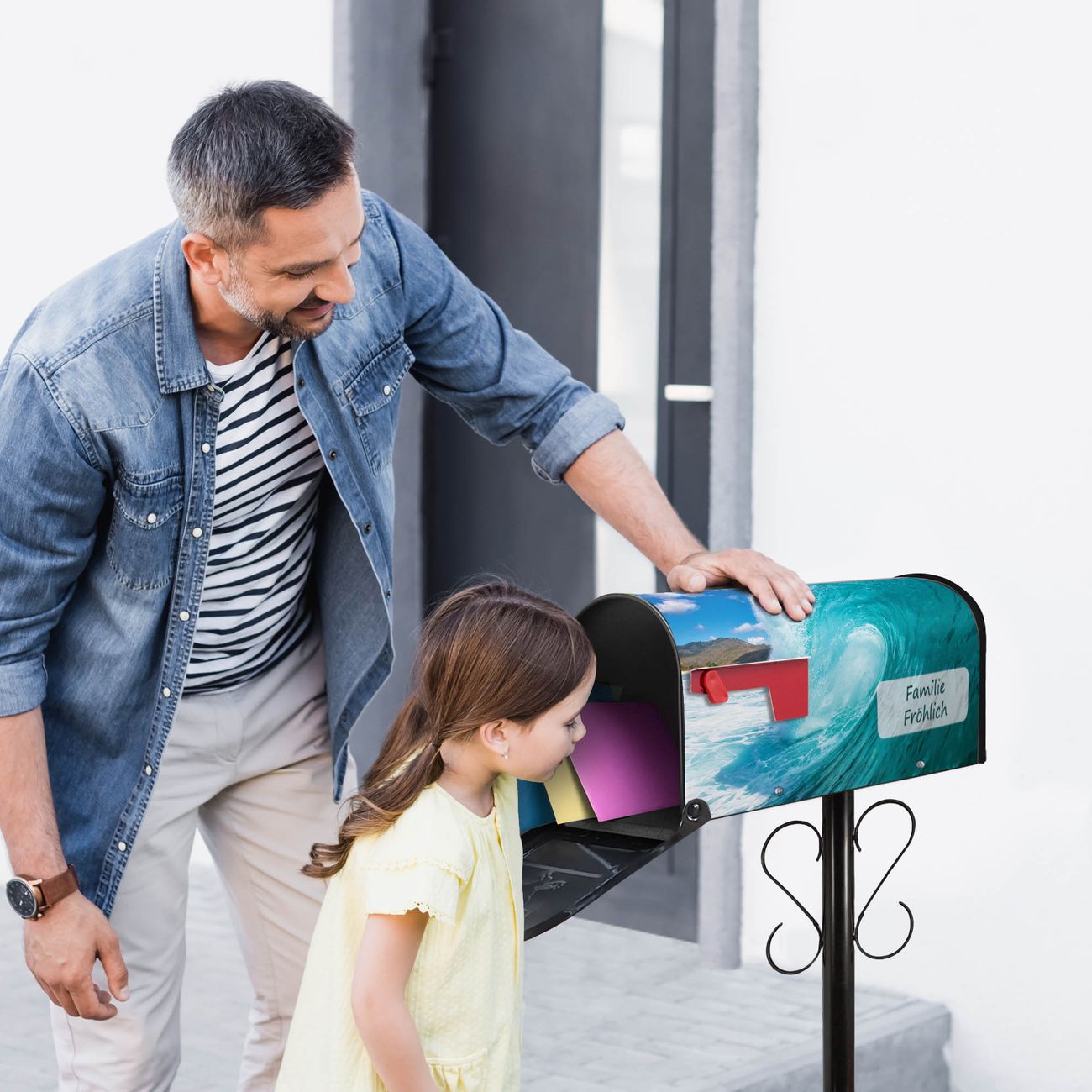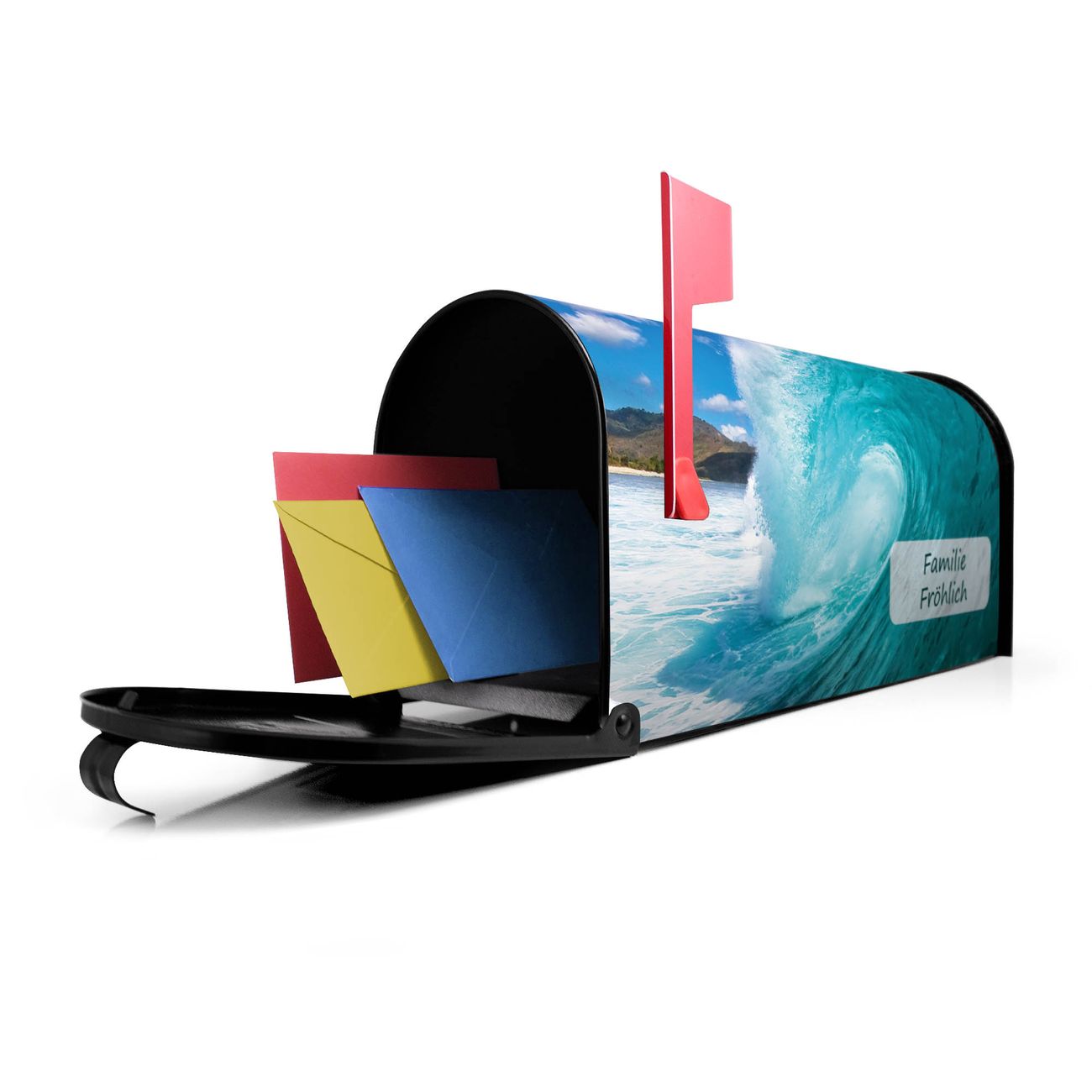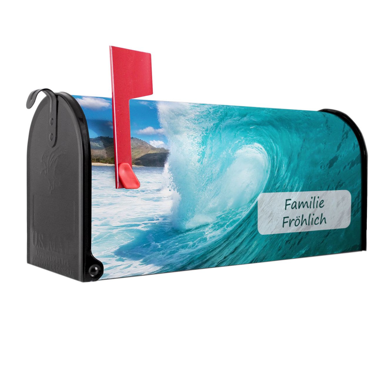 Der amerikanische Briefkasten von banjado mit Perfekte Welle Motiv bietet Ihnen ausreichend Fassungsvermögen, um große A4 Sendungen und Zeitschriften zu empfangen. Die typisch amerikanische rote Fahne zeigt Ihnen an, wenn Sie Post erhalten haben. Die US-Mailbox besteht aus verzinktem Stahlblech welches lackiert wurde und ist 48 x 22 x 16 CM (BxHxT) groß. Die Folie mit Motiv Perfekte Welle besteht aus einer wetter- und UV-resistenten Folie, die mit einem Schutzlaminat überzogen ist, sodass die US Mailbox zusätzlich vor Kratzern geschützt ist. An der Unterkante sind 4 Löcher je Seite um die Mailbox, typisch amerikanisch, an einem Holzpfahl oder einem Zaun zu befestigen. Auf Wunsch können Sie bei uns den passenden Standfuß oder die passende Wandhalterung kaufen um die US-Mailbox sicher zu befestigen. Wir bieten Ihnen ebenfalls Namensschilder, bereits beschriftet oder frei zu beschriften, und verschiedene selbst gestaltete Bitte-Keine-Werbung-Aufkleber.