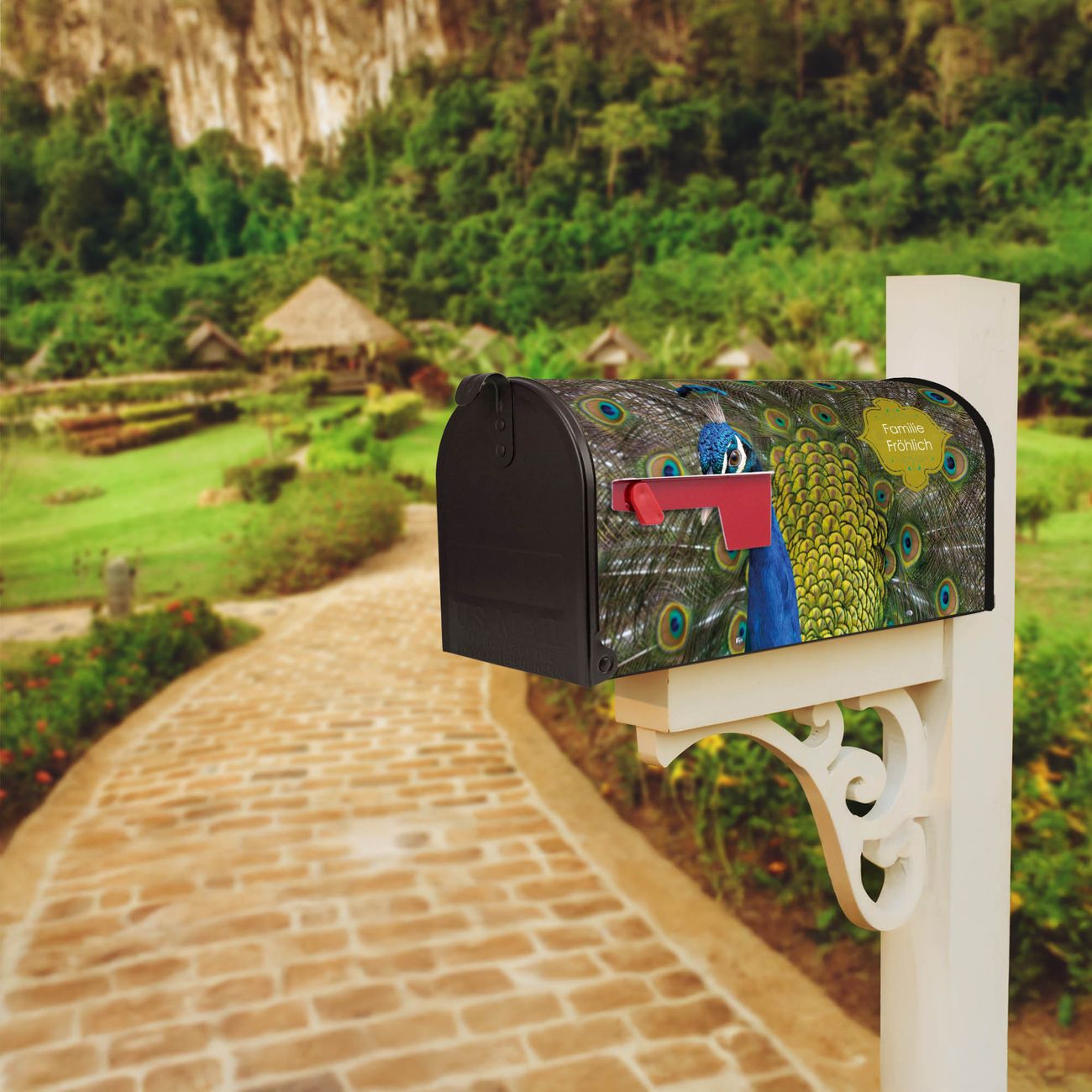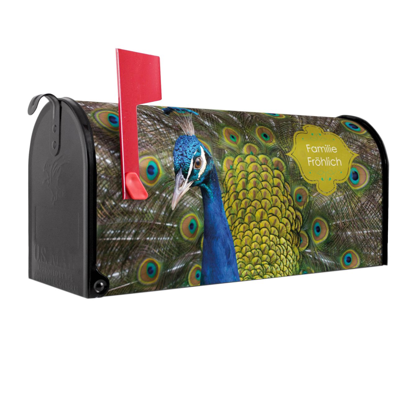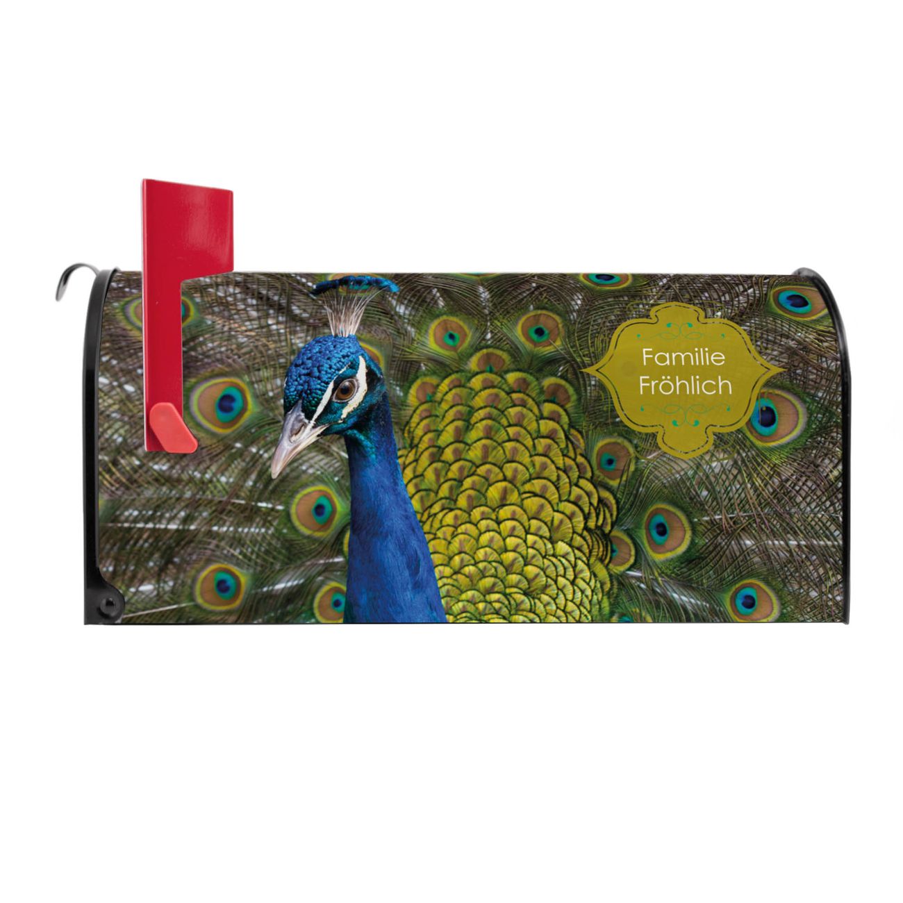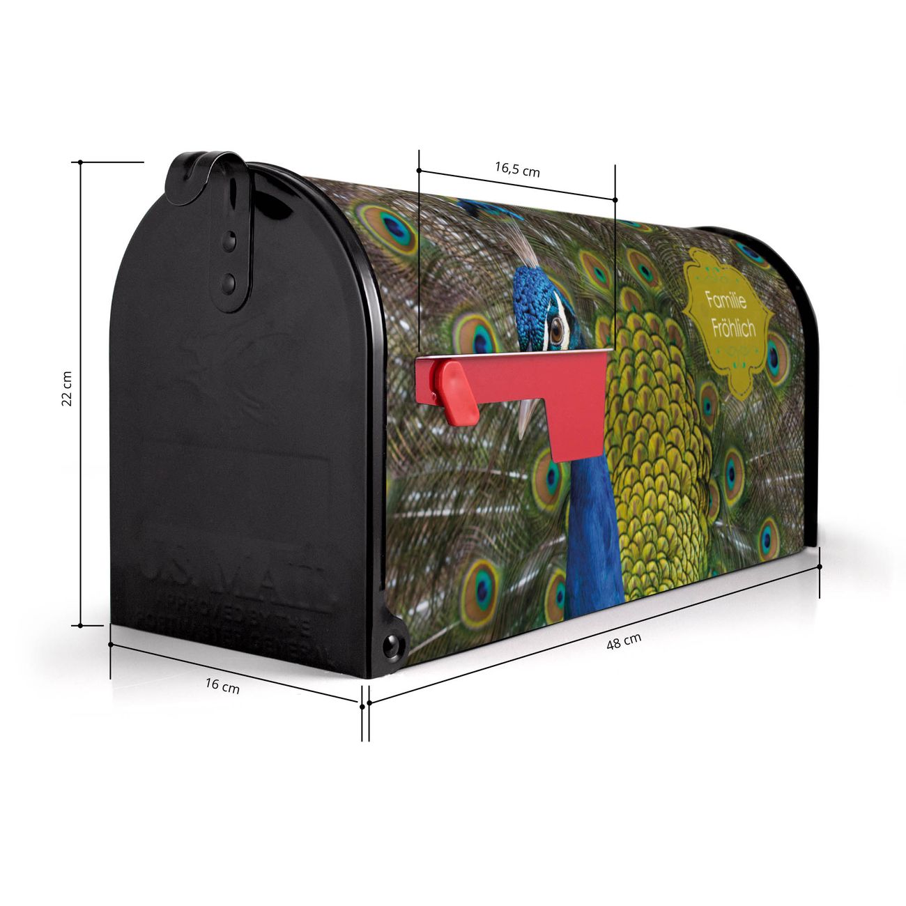 Der amerikanische Briefkasten von banjado mit Pfau Motiv bietet Ihnen ausreichend Fassungsvermögen, um große A4 Sendungen und Zeitschriften zu empfangen. Die typisch amerikanische rote Fahne zeigt Ihnen an, wenn Sie Post erhalten haben. Die US-Mailbox besteht aus verzinktem Stahlblech welches lackiert wurde und ist 48 x 22 x 16 CM (BxHxT) groß. Die Folie mit Motiv Pfau besteht aus einer wetter- und UV-resistenten Folie, die mit einem Schutzlaminat überzogen ist, sodass die US Mailbox zusätzlich vor Kratzern geschützt ist. An der Unterkante sind 4 Löcher je Seite um die Mailbox, typisch amerikanisch, an einem Holzpfahl oder einem Zaun zu befestigen. Auf Wunsch können Sie bei uns den passenden Standfuß oder die passende Wandhalterung kaufen um die US-Mailbox sicher zu befestigen. Wir bieten Ihnen ebenfalls Namensschilder, bereits beschriftet oder frei zu beschriften, und verschiedene selbst gestaltete Bitte-Keine-Werbung-Aufkleber.