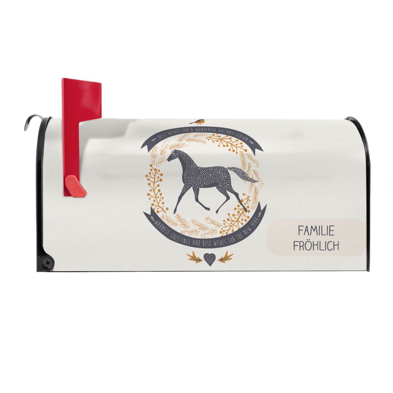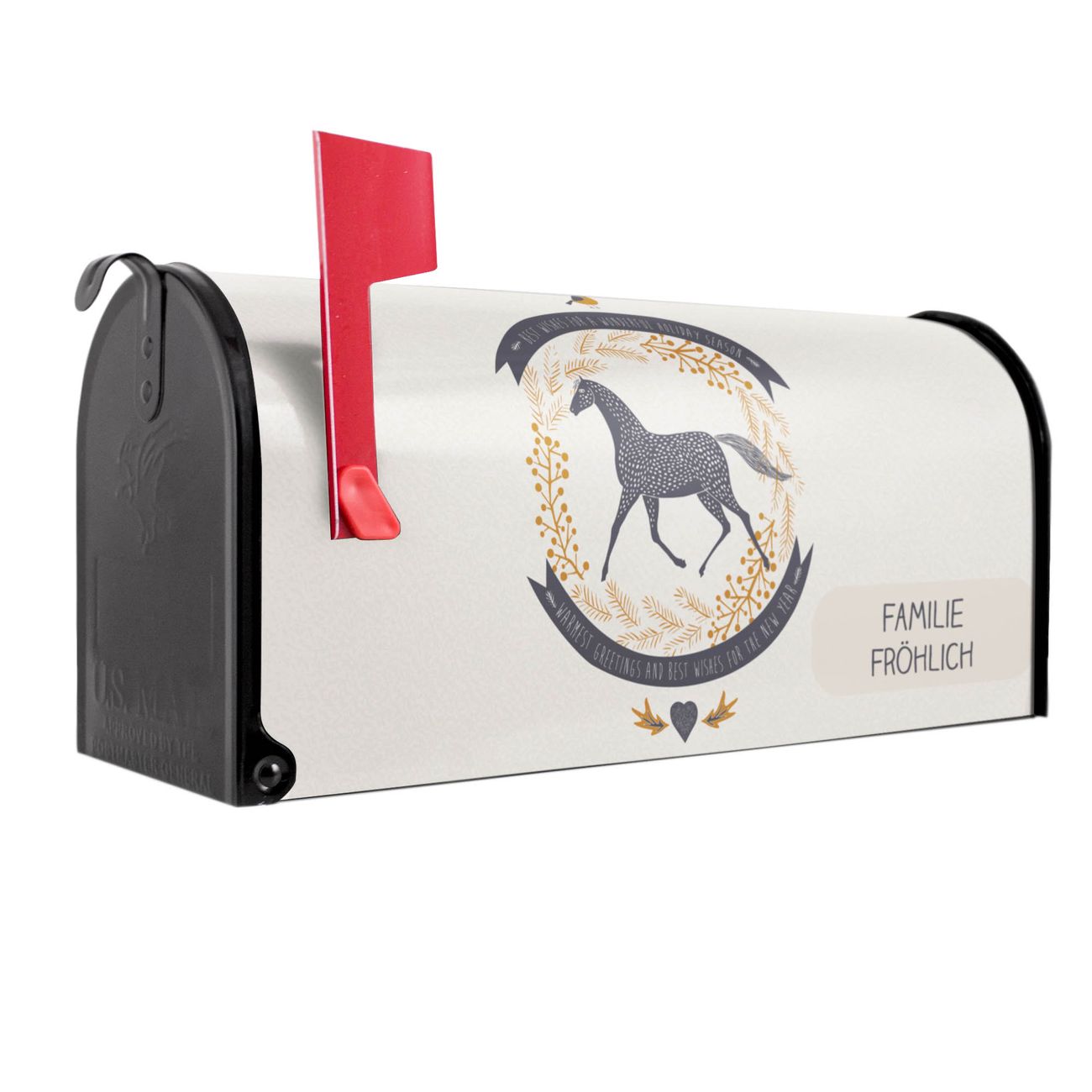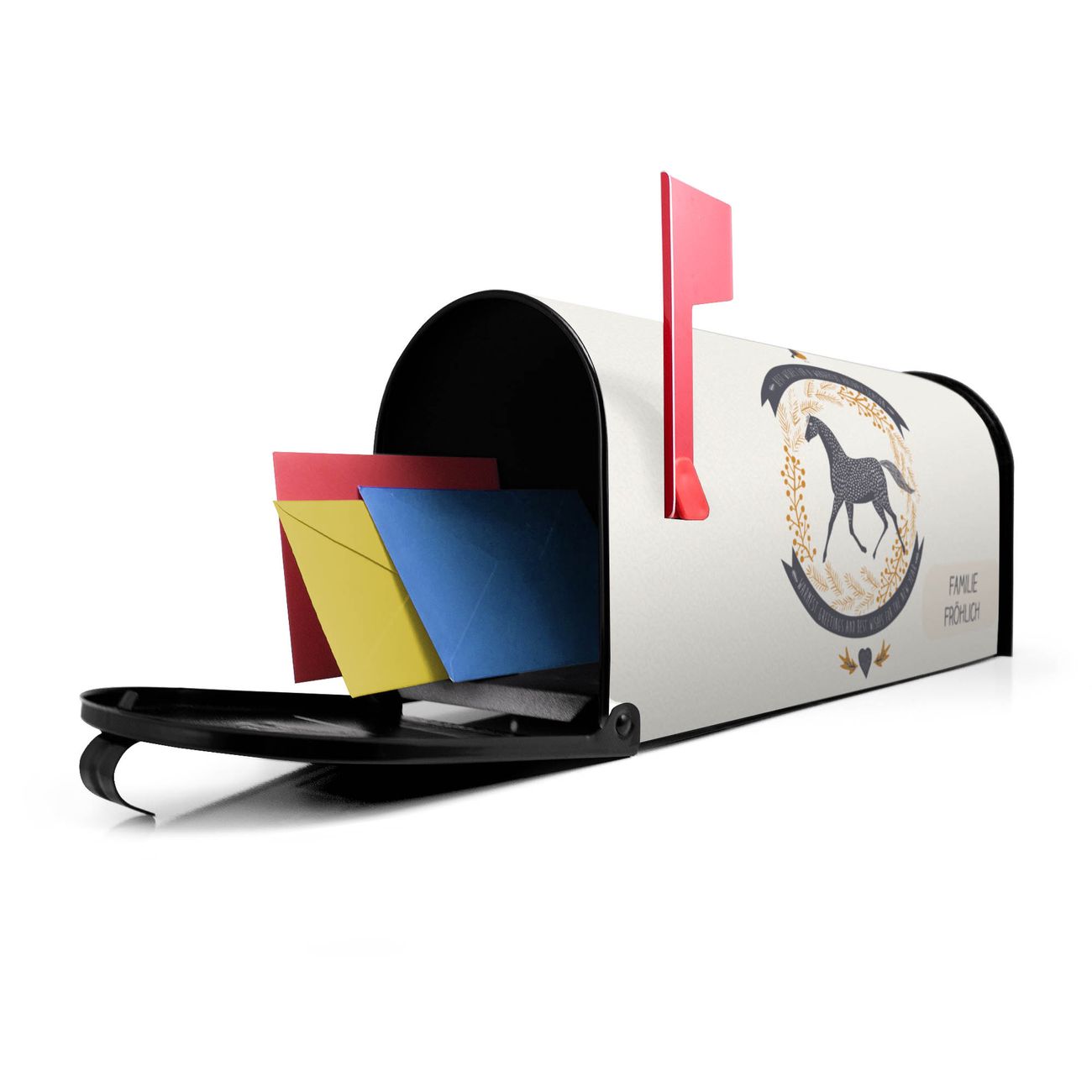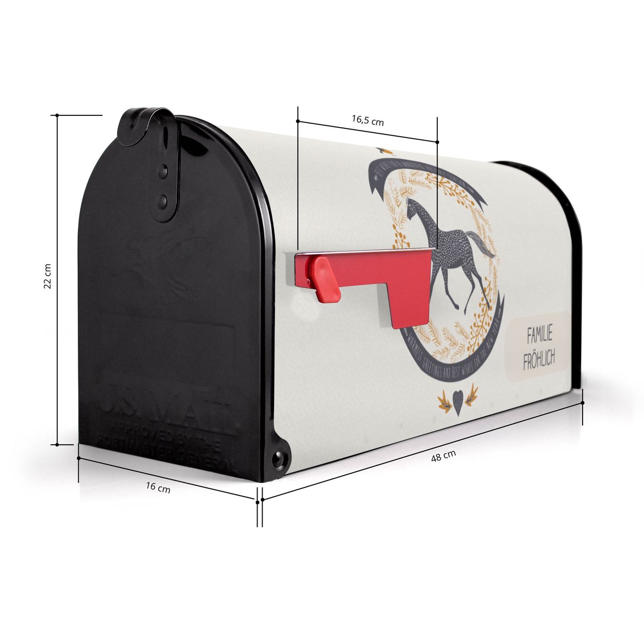 Der amerikanische Briefkasten von banjado mit Pferd und Vogel Motiv bietet Ihnen ausreichend Fassungsvermögen, um große A4 Sendungen und Zeitschriften zu empfangen. Die typisch amerikanische rote Fahne zeigt Ihnen an, wenn Sie Post erhalten haben. Die US-Mailbox besteht aus verzinktem Stahlblech welches lackiert wurde und ist 48 x 22 x 16 CM (BxHxT) groß. Die Folie mit Motiv Pferd und Vogel besteht aus einer wetter- und UV-resistenten Folie, die mit einem Schutzlaminat überzogen ist, sodass die US Mailbox zusätzlich vor Kratzern geschützt ist. An der Unterkante sind 4 Löcher je Seite um die Mailbox, typisch amerikanisch, an einem Holzpfahl oder einem Zaun zu befestigen. Auf Wunsch können Sie bei uns den passenden Standfuß oder die passende Wandhalterung kaufen um die US-Mailbox sicher zu befestigen. Wir bieten Ihnen ebenfalls Namensschilder, bereits beschriftet oder frei zu beschriften, und verschiedene selbst gestaltete Bitte-Keine-Werbung-Aufkleber.