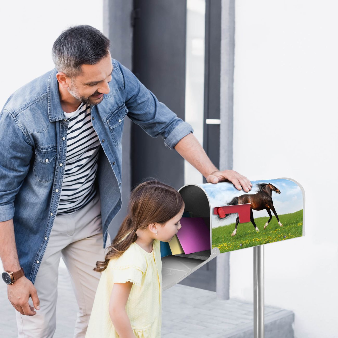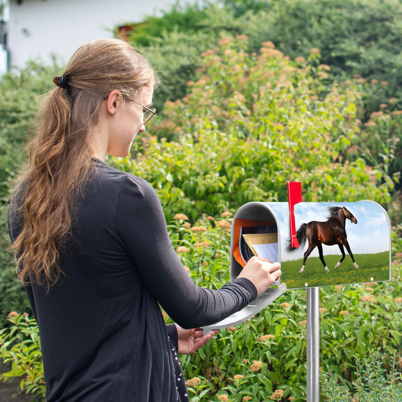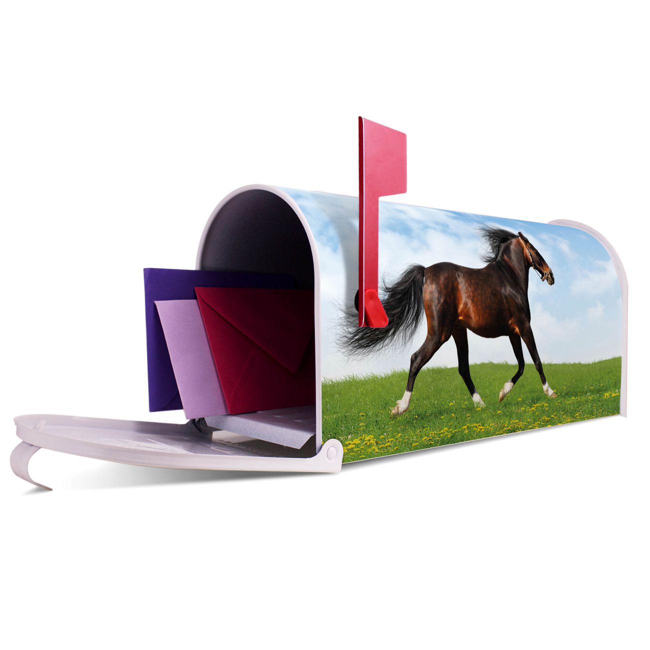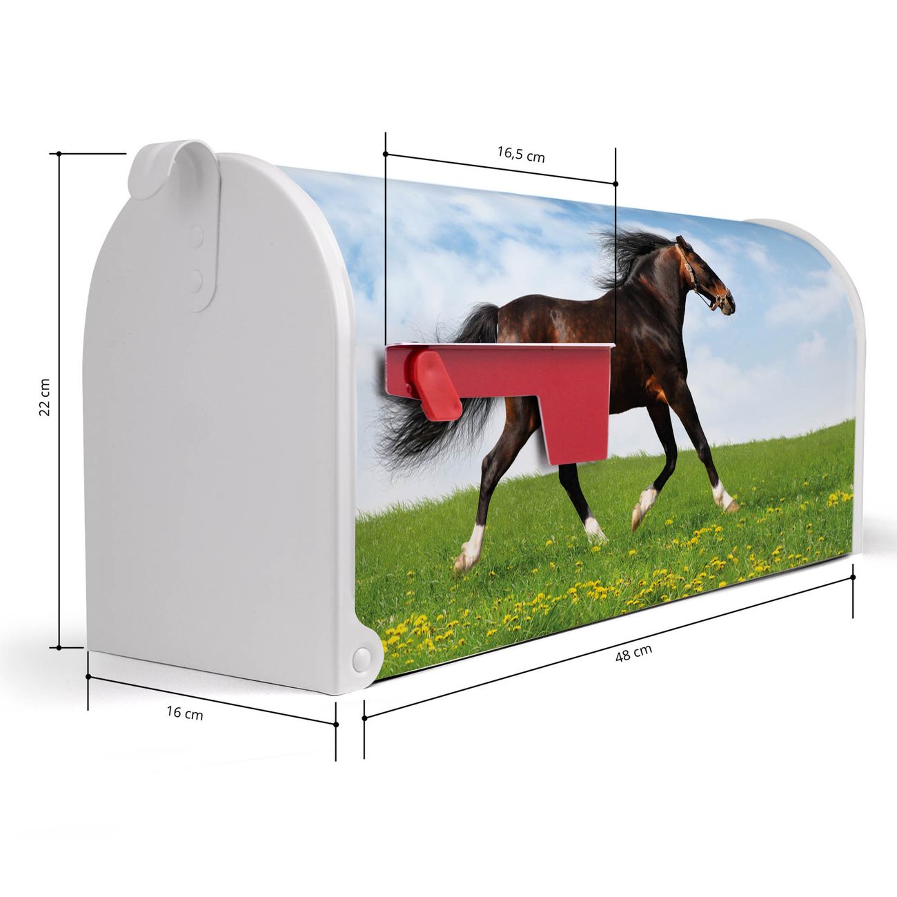 Der amerikanische Briefkasten von banjado mit Pferd Motiv bietet Ihnen ausreichend Fassungsvermögen, um große A4 Sendungen und Zeitschriften zu empfangen. Die typisch amerikanische rote Fahne zeigt Ihnen an, wenn Sie Post erhalten haben. Die US-Mailbox besteht aus verzinktem Stahlblech welches lackiert wurde und ist 48 x 22 x 16 CM (BxHxT) groß. Die Folie mit Motiv Pferd besteht aus einer wetter- und UV-resistenten Folie, die mit einem Schutzlaminat überzogen ist, sodass die US Mailbox zusätzlich vor Kratzern geschützt ist. An der Unterkante sind 4 Löcher je Seite um die Mailbox, typisch amerikanisch, an einem Holzpfahl oder einem Zaun zu befestigen. Auf Wunsch können Sie bei uns den passenden Standfuß oder die passende Wandhalterung kaufen um die US-Mailbox sicher zu befestigen. Wir bieten Ihnen ebenfalls Namensschilder, bereits beschriftet oder frei zu beschriften, und verschiedene selbst gestaltete Bitte-Keine-Werbung-Aufkleber.