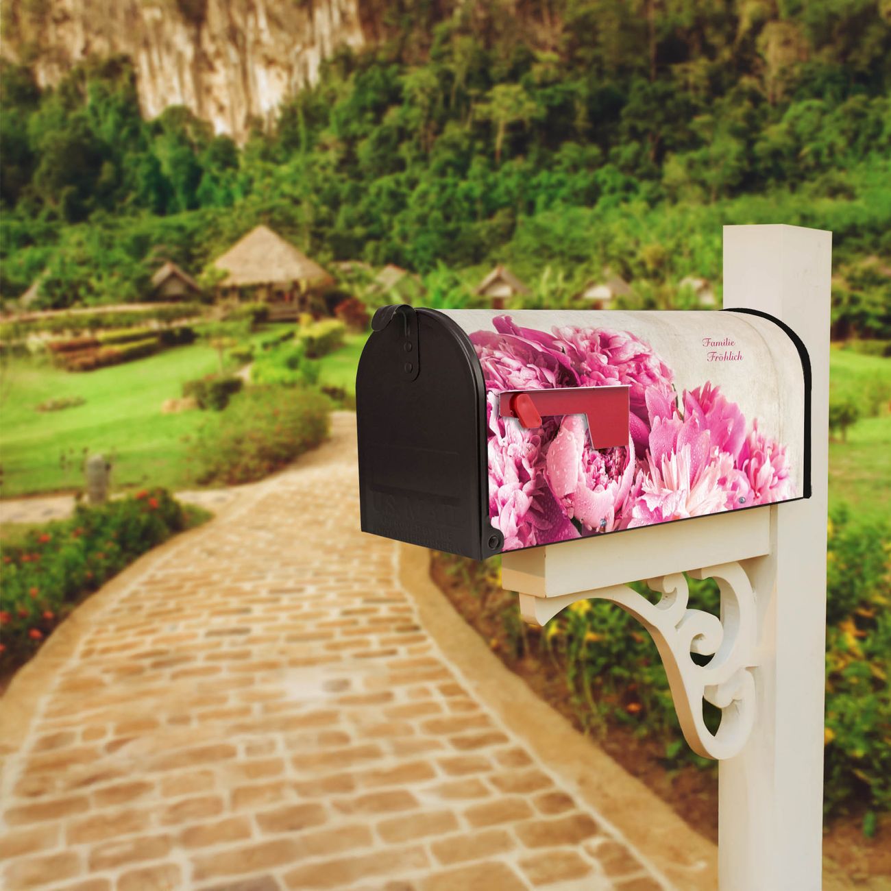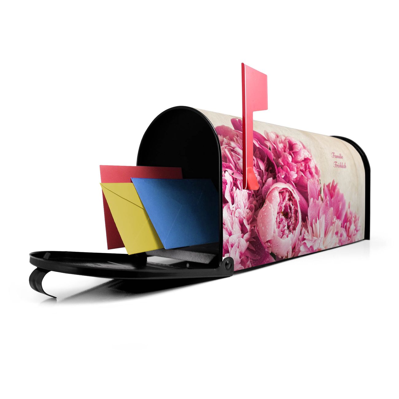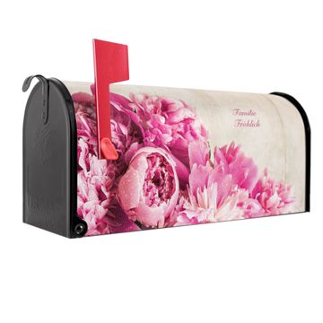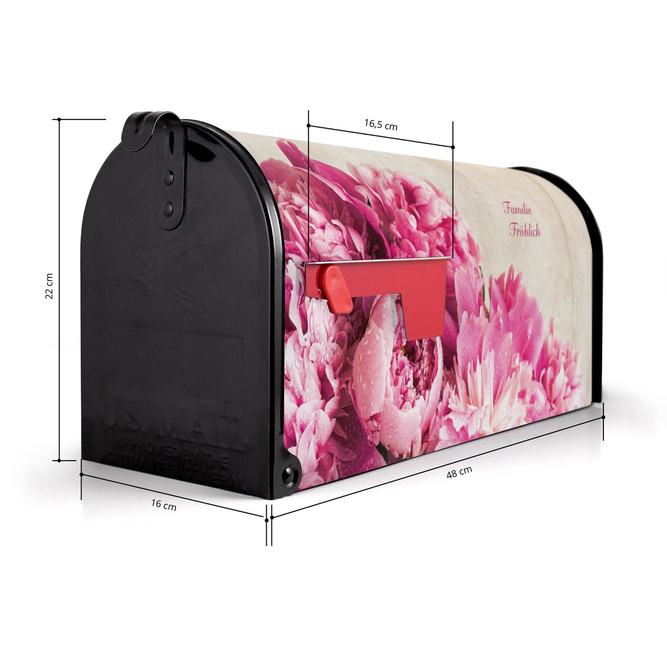Der amerikanische Briefkasten von banjado mit Pfingstrose Motiv bietet Ihnen ausreichend Fassungsvermögen, um große A4 Sendungen und Zeitschriften zu empfangen. Die typisch amerikanische rote Fahne zeigt Ihnen an, wenn Sie Post erhalten haben. Die US-Mailbox besteht aus verzinktem Stahlblech welches lackiert wurde und ist 48 x 22 x 16 CM (BxHxT) groß. Die Folie mit Motiv Pfingstrose besteht aus einer wetter- und UV-resistenten Folie, die mit einem Schutzlaminat überzogen ist, sodass die US Mailbox zusätzlich vor Kratzern geschützt ist. An der Unterkante sind 4 Löcher je Seite um die Mailbox, typisch amerikanisch, an einem Holzpfahl oder einem Zaun zu befestigen. Auf Wunsch können Sie bei uns den passenden Standfuß oder die passende Wandhalterung kaufen um die US-Mailbox sicher zu befestigen. Wir bieten Ihnen ebenfalls Namensschilder, bereits beschriftet oder frei zu beschriften, und verschiedene selbst gestaltete Bitte-Keine-Werbung-Aufkleber.