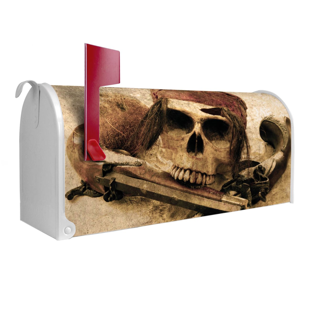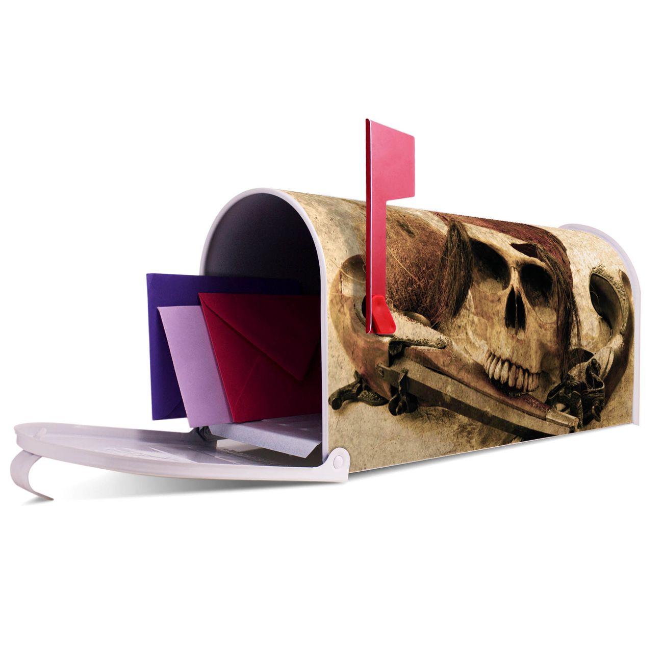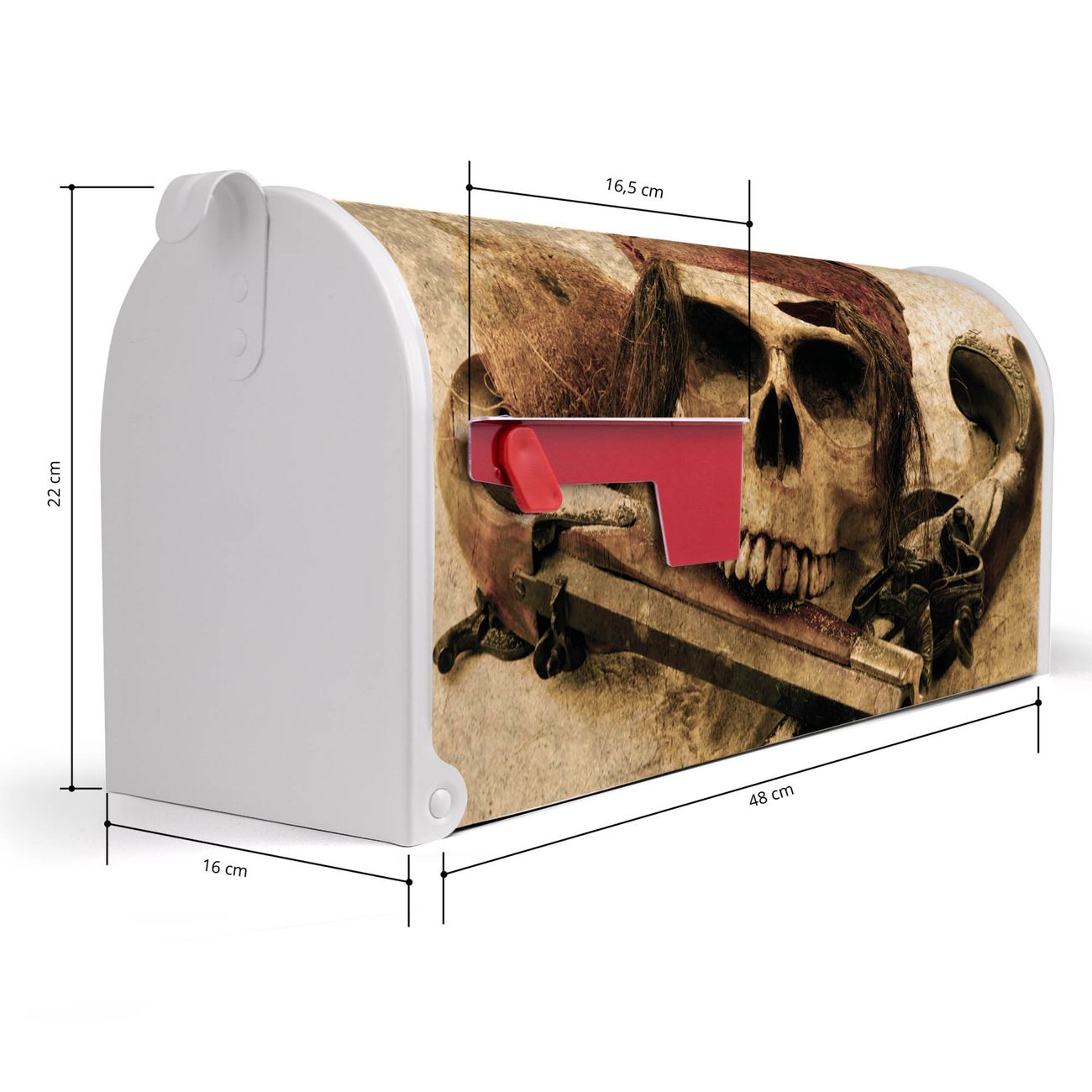 Der amerikanische Briefkasten von banjado mit Pirat Motiv bietet Ihnen ausreichend Fassungsvermögen, um große A4 Sendungen und Zeitschriften zu empfangen. Die typisch amerikanische rote Fahne zeigt Ihnen an, wenn Sie Post erhalten haben. Die US-Mailbox besteht aus verzinktem Stahlblech welches lackiert wurde und ist 48 x 22 x 16 CM (BxHxT) groß. Die Folie mit Motiv Pirat besteht aus einer wetter- und UV-resistenten Folie, die mit einem Schutzlaminat überzogen ist, sodass die US Mailbox zusätzlich vor Kratzern geschützt ist. An der Unterkante sind 4 Löcher je Seite um die Mailbox, typisch amerikanisch, an einem Holzpfahl oder einem Zaun zu befestigen. Auf Wunsch können Sie bei uns den passenden Standfuß oder die passende Wandhalterung kaufen um die US-Mailbox sicher zu befestigen. Wir bieten Ihnen ebenfalls Namensschilder, bereits beschriftet oder frei zu beschriften, und verschiedene selbst gestaltete Bitte-Keine-Werbung-Aufkleber.