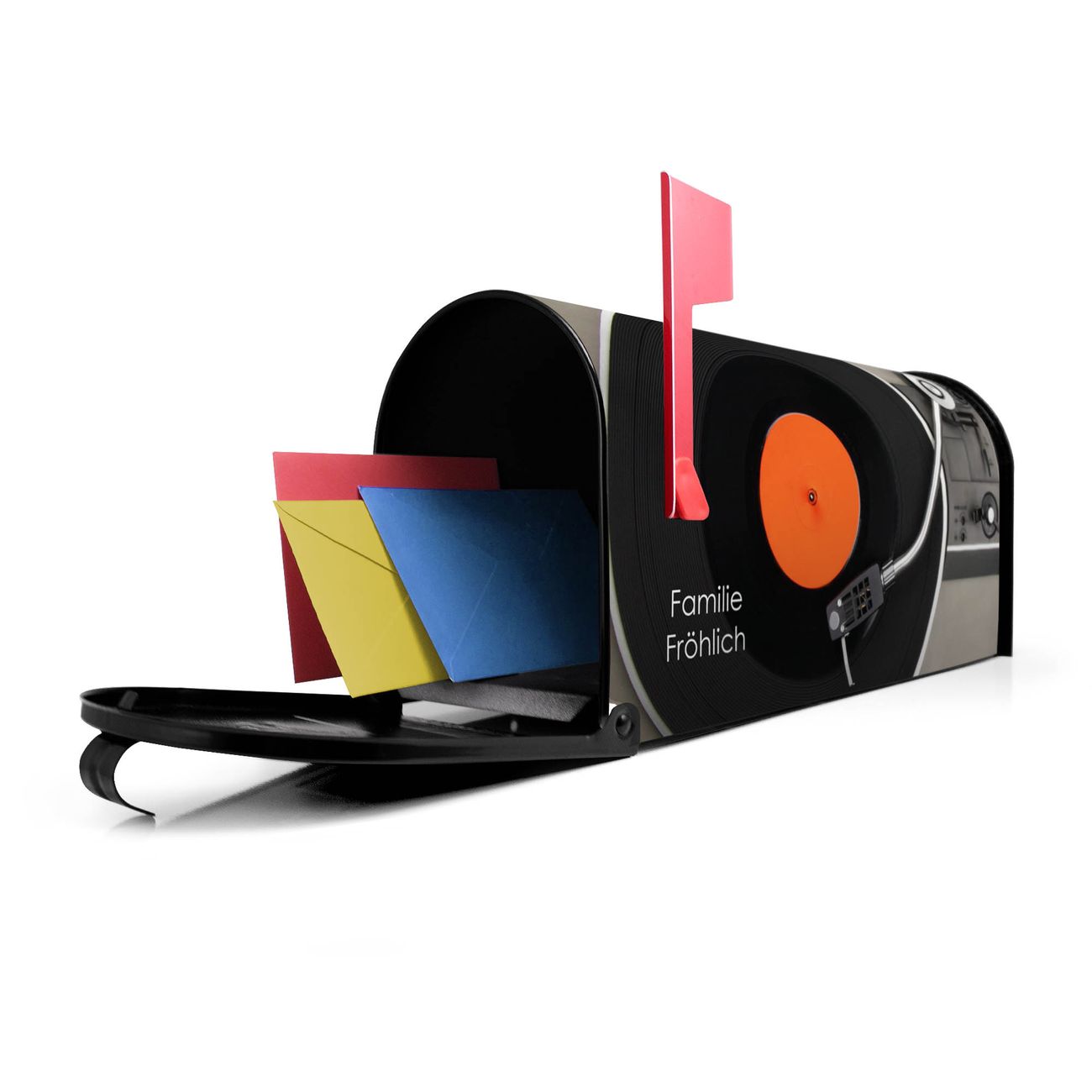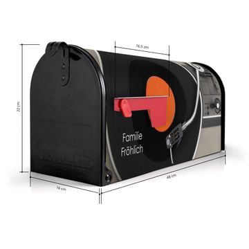Der amerikanische Briefkasten von banjado mit Plattenspieler Motiv bietet Ihnen ausreichend Fassungsvermögen, um große A4 Sendungen und Zeitschriften zu empfangen. Die typisch amerikanische rote Fahne zeigt Ihnen an, wenn Sie Post erhalten haben. Die US-Mailbox besteht aus verzinktem Stahlblech welches lackiert wurde und ist 48 x 22 x 16 CM (BxHxT) groß. Die Folie mit Motiv Plattenspieler besteht aus einer wetter- und UV-resistenten Folie, die mit einem Schutzlaminat überzogen ist, sodass die US Mailbox zusätzlich vor Kratzern geschützt ist. An der Unterkante sind 4 Löcher je Seite um die Mailbox, typisch amerikanisch, an einem Holzpfahl oder einem Zaun zu befestigen. Auf Wunsch können Sie bei uns den passenden Standfuß oder die passende Wandhalterung kaufen um die US-Mailbox sicher zu befestigen. Wir bieten Ihnen ebenfalls Namensschilder, bereits beschriftet oder frei zu beschriften, und verschiedene selbst gestaltete Bitte-Keine-Werbung-Aufkleber.