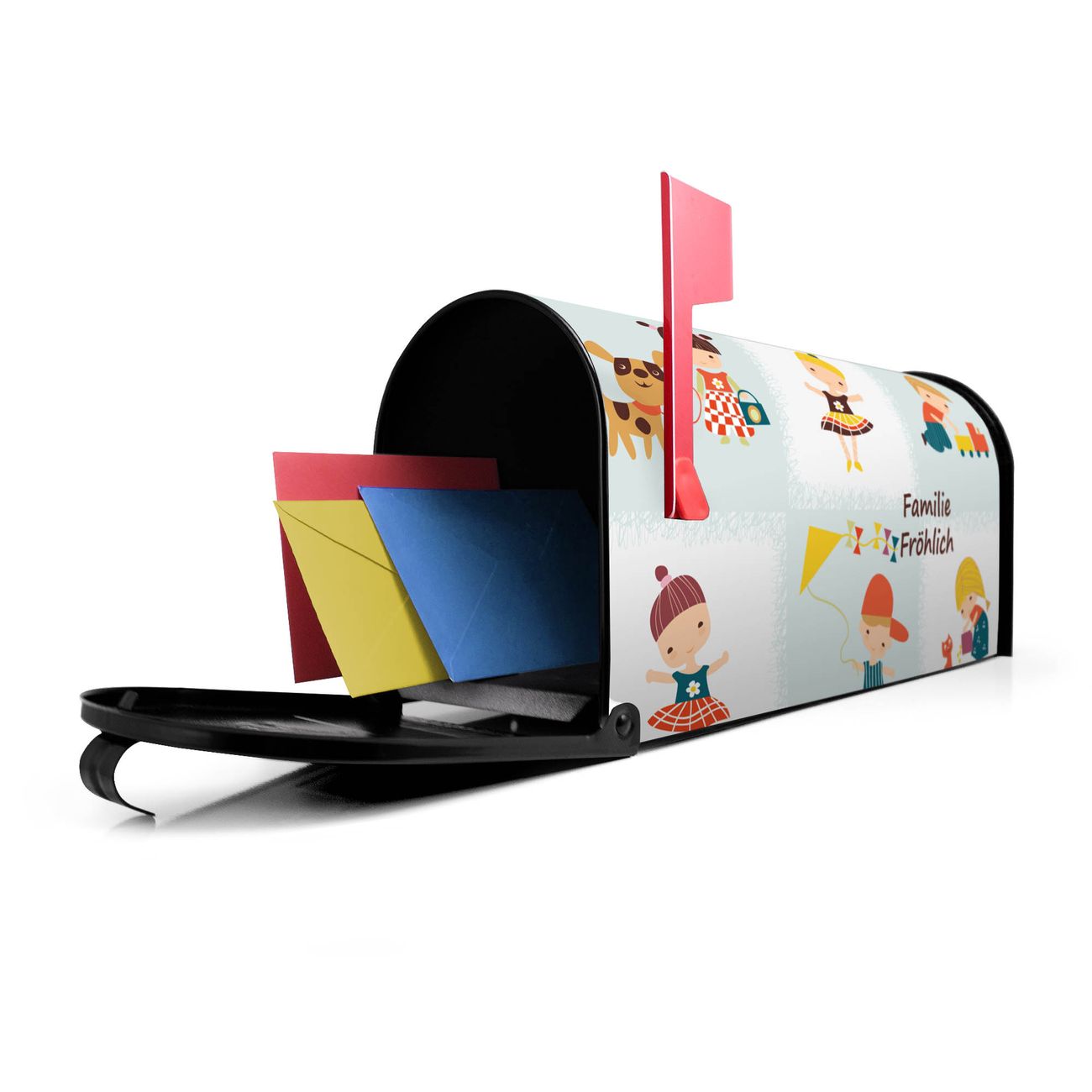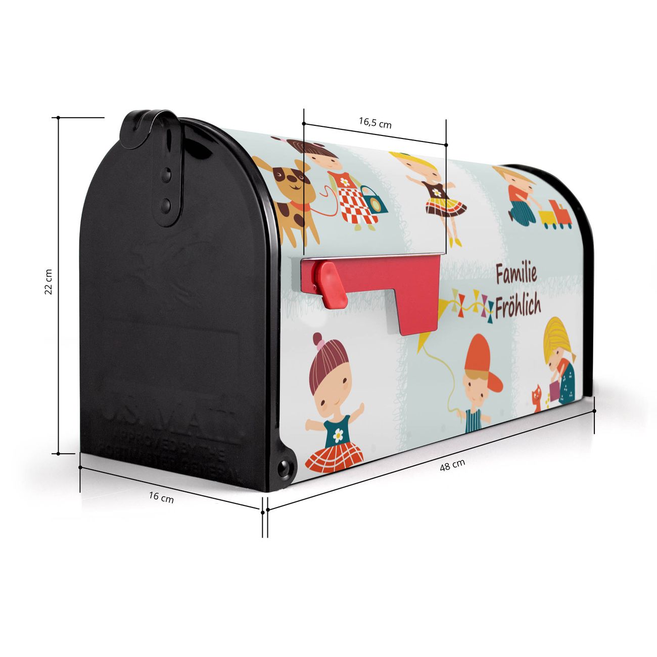 Der amerikanische Briefkasten von banjado mit Play Time Motiv bietet Ihnen ausreichend Fassungsvermögen, um große A4 Sendungen und Zeitschriften zu empfangen. Die typisch amerikanische rote Fahne zeigt Ihnen an, wenn Sie Post erhalten haben. Die US-Mailbox besteht aus verzinktem Stahlblech welches lackiert wurde und ist 48 x 22 x 16 CM (BxHxT) groß. Die Folie mit Motiv Play Time besteht aus einer wetter- und UV-resistenten Folie, die mit einem Schutzlaminat überzogen ist, sodass die US Mailbox zusätzlich vor Kratzern geschützt ist. An der Unterkante sind 4 Löcher je Seite um die Mailbox, typisch amerikanisch, an einem Holzpfahl oder einem Zaun zu befestigen. Auf Wunsch können Sie bei uns den passenden Standfuß oder die passende Wandhalterung kaufen um die US-Mailbox sicher zu befestigen. Wir bieten Ihnen ebenfalls Namensschilder, bereits beschriftet oder frei zu beschriften, und verschiedene selbst gestaltete Bitte-Keine-Werbung-Aufkleber.