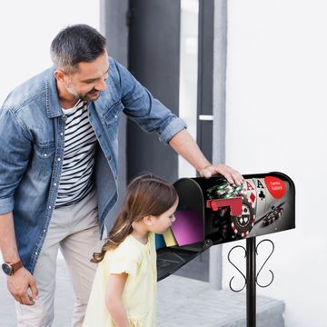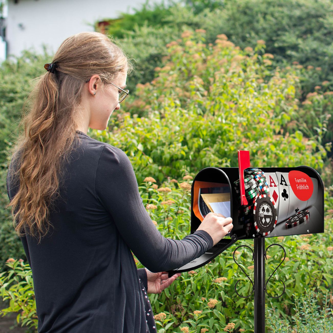 Unser amerikanischer Briefkasten mit dem Motiv Poker hat ein sehr ansprechendes und ausgefallenes Design, ist in der Grundfarbe weiß, grün oder schwarz erhältlich. Damit entlocken Sie Ihren Nachbarn und dem Postboten immer wieder ein Lächeln. Die Mailbox ist ein Original Import aus Mississippi USA und wird von unserer kleinen Manufaktur in Sachsen von Hand veredelt. Die US-Mailbox bietet ausreichend Platz auch für große Sendungen, eine Fahne die Ihnen Post anzeigt, wetterfestes und äußerst stabiles Material - so macht Post empfangen Freude.