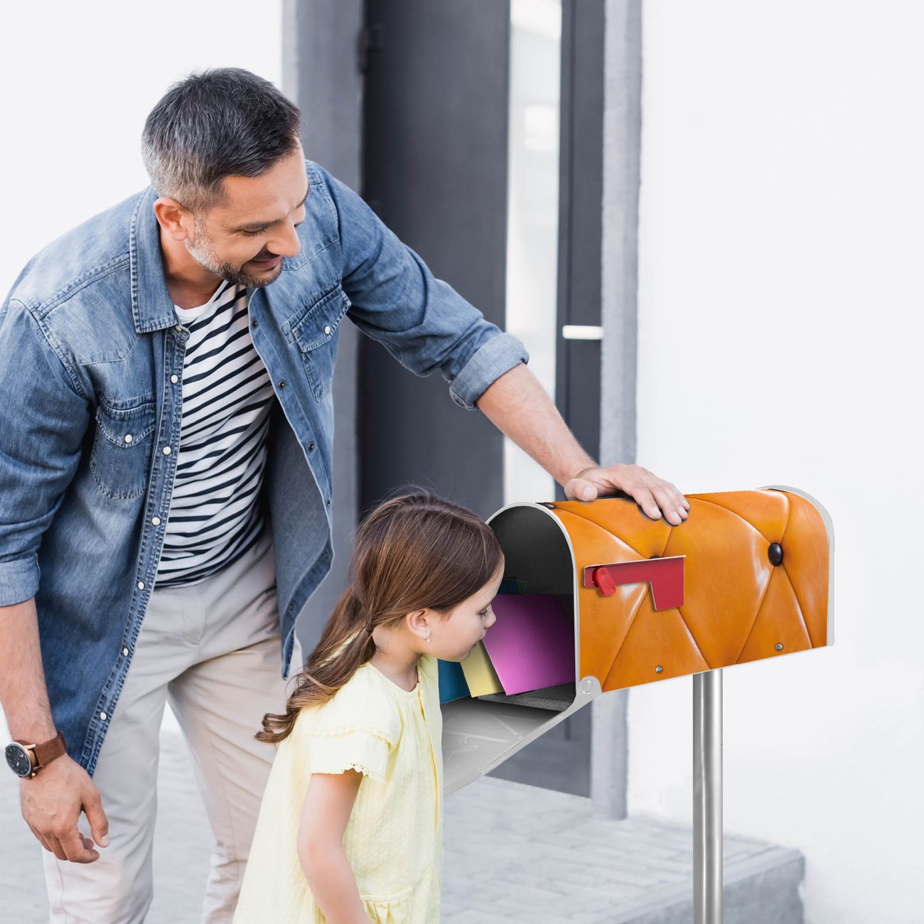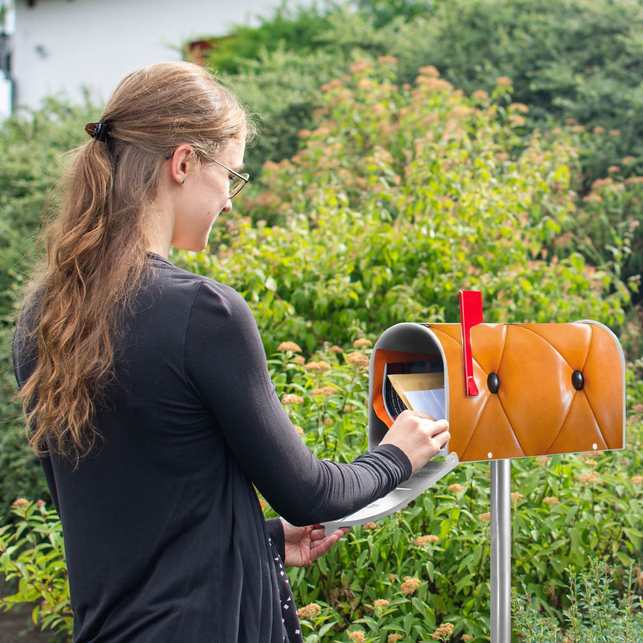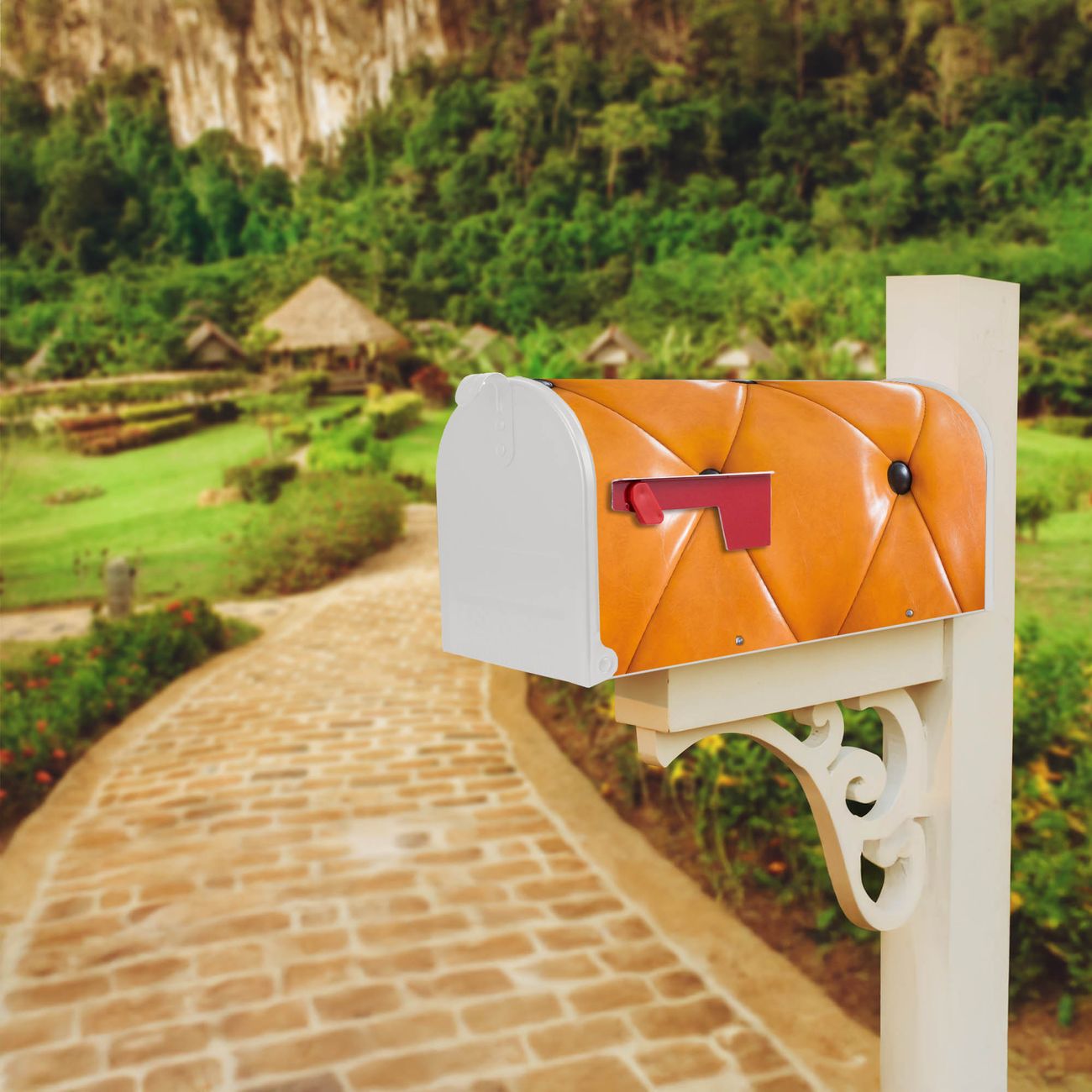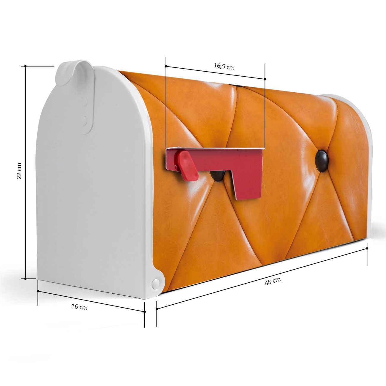 Der amerikanische Briefkasten von banjado mit Polster Orange Motiv bietet Ihnen ausreichend Fassungsvermögen, um große A4 Sendungen und Zeitschriften zu empfangen. Die typisch amerikanische rote Fahne zeigt Ihnen an, wenn Sie Post erhalten haben. Die US-Mailbox besteht aus verzinktem Stahlblech welches lackiert wurde und ist 48 x 22 x 16 CM (BxHxT) groß. Die Folie mit Motiv Polster Orange besteht aus einer wetter- und UV-resistenten Folie, die mit einem Schutzlaminat überzogen ist, sodass die US Mailbox zusätzlich vor Kratzern geschützt ist. An der Unterkante sind 4 Löcher je Seite um die Mailbox, typisch amerikanisch, an einem Holzpfahl oder einem Zaun zu befestigen. Auf Wunsch können Sie bei uns den passenden Standfuß oder die passende Wandhalterung kaufen um die US-Mailbox sicher zu befestigen. Wir bieten Ihnen ebenfalls Namensschilder, bereits beschriftet oder frei zu beschriften, und verschiedene selbst gestaltete Bitte-Keine-Werbung-Aufkleber.