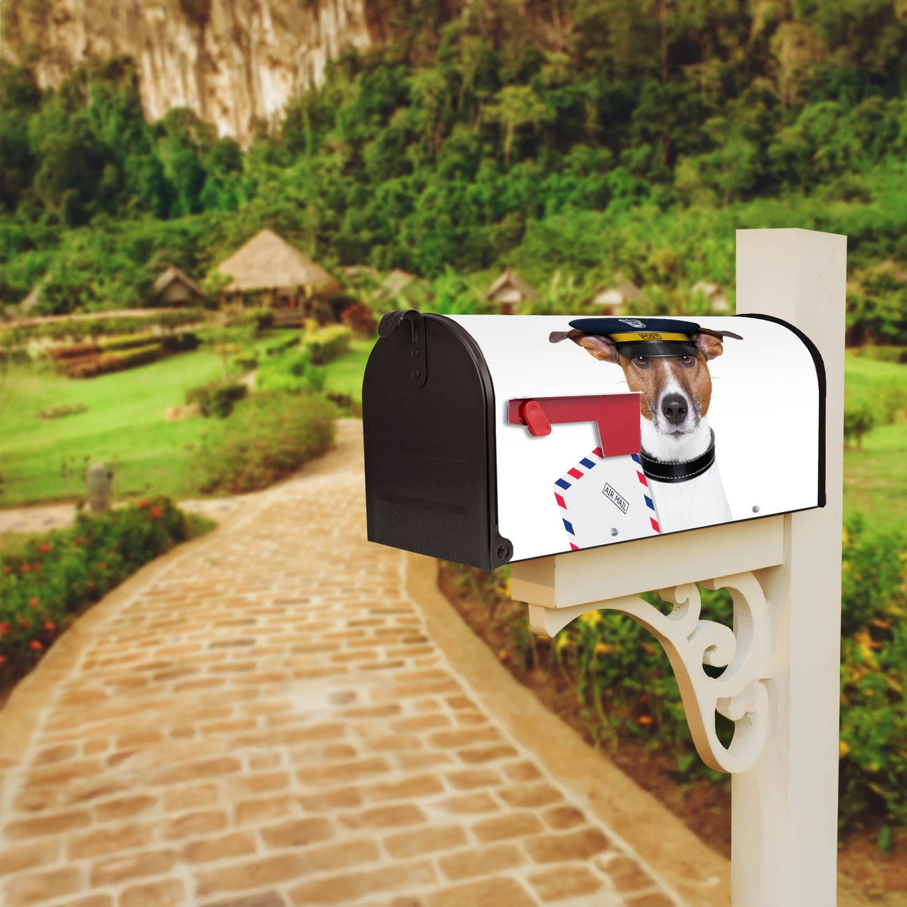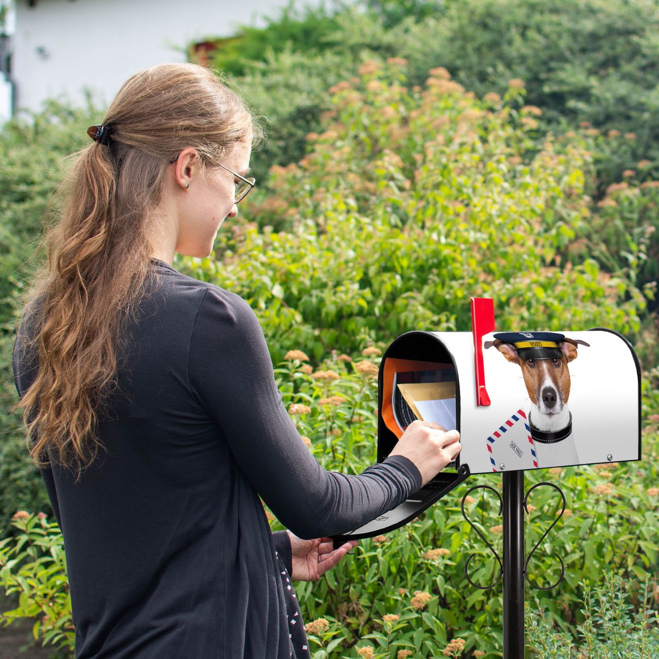 Der amerikanische Briefkasten von banjado mit Postbote Jack Russel Motiv bietet Ihnen ausreichend Fassungsvermögen, um große A4 Sendungen und Zeitschriften zu empfangen. Die typisch amerikanische rote Fahne zeigt Ihnen an, wenn Sie Post erhalten haben. Die US-Mailbox besteht aus verzinktem Stahlblech welches lackiert wurde und ist 48 x 22 x 16 CM (BxHxT) groß. Die Folie mit Motiv Postbote Jack Russel besteht aus einer wetter- und UV-resistenten Folie, die mit einem Schutzlaminat überzogen ist, sodass die US Mailbox zusätzlich vor Kratzern geschützt ist. An der Unterkante sind 4 Löcher je Seite um die Mailbox, typisch amerikanisch, an einem Holzpfahl oder einem Zaun zu befestigen. Auf Wunsch können Sie bei uns den passenden Standfuß oder die passende Wandhalterung kaufen um die US-Mailbox sicher zu befestigen. Wir bieten Ihnen ebenfalls Namensschilder, bereits beschriftet oder frei zu beschriften, und verschiedene selbst gestaltete Bitte-Keine-Werbung-Aufkleber.