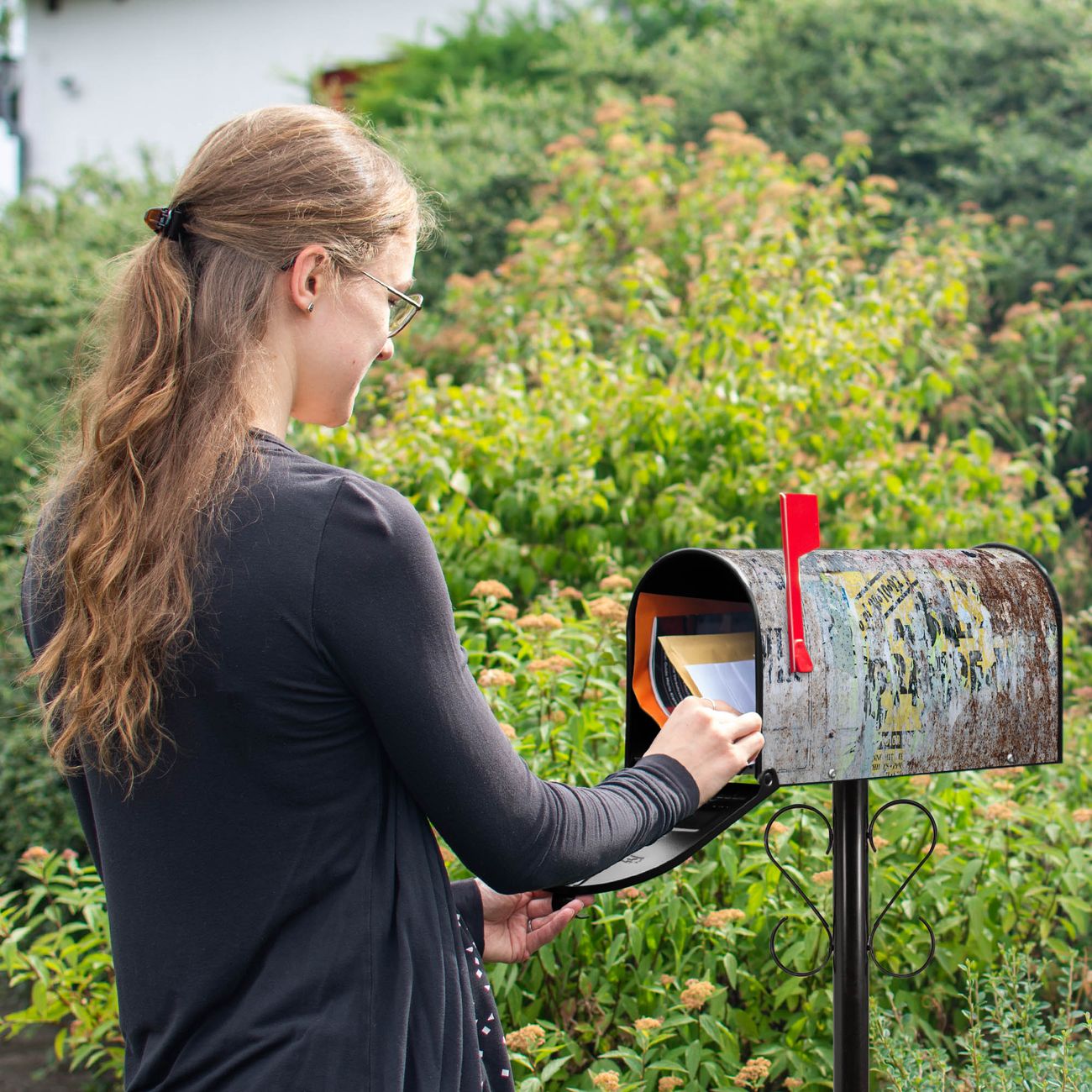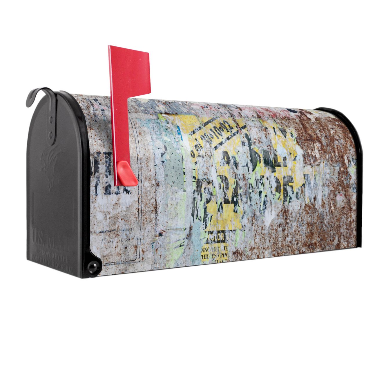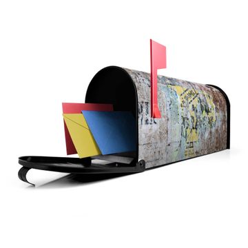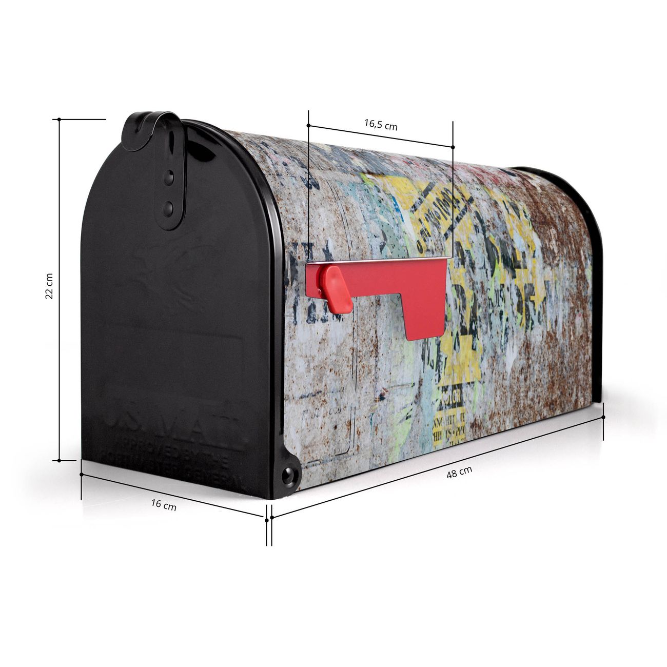 Der amerikanische Briefkasten von banjado mit Posterwand Motiv bietet Ihnen ausreichend Fassungsvermögen, um große A4 Sendungen und Zeitschriften zu empfangen. Die typisch amerikanische rote Fahne zeigt Ihnen an, wenn Sie Post erhalten haben. Die US-Mailbox besteht aus verzinktem Stahlblech welches lackiert wurde und ist 48 x 22 x 16 CM (BxHxT) groß. Die Folie mit Motiv Posterwand besteht aus einer wetter- und UV-resistenten Folie, die mit einem Schutzlaminat überzogen ist, sodass die US Mailbox zusätzlich vor Kratzern geschützt ist. An der Unterkante sind 4 Löcher je Seite um die Mailbox, typisch amerikanisch, an einem Holzpfahl oder einem Zaun zu befestigen. Auf Wunsch können Sie bei uns den passenden Standfuß oder die passende Wandhalterung kaufen um die US-Mailbox sicher zu befestigen. Wir bieten Ihnen ebenfalls Namensschilder, bereits beschriftet oder frei zu beschriften, und verschiedene selbst gestaltete Bitte-Keine-Werbung-Aufkleber.