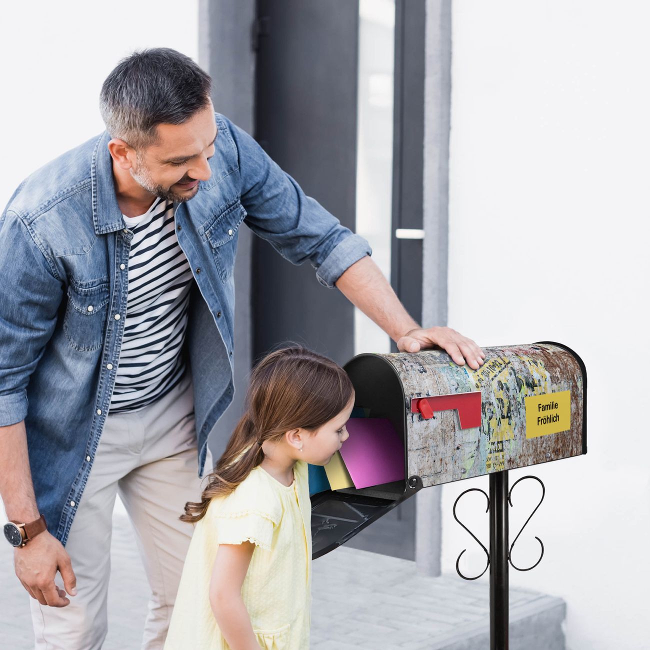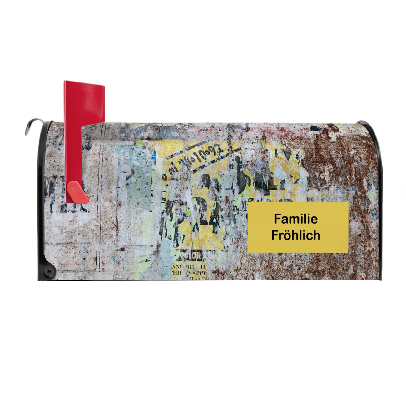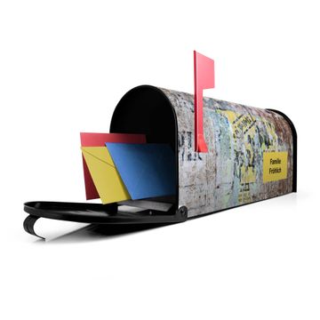 Der amerikanische Briefkasten von banjado mit Posterwand Motiv bietet Ihnen ausreichend Fassungsvermögen, um große A4 Sendungen und Zeitschriften zu empfangen. Die typisch amerikanische rote Fahne zeigt Ihnen an, wenn Sie Post erhalten haben. Die US-Mailbox besteht aus verzinktem Stahlblech welches lackiert wurde und ist 48 x 22 x 16 CM (BxHxT) groß. Die Folie mit Motiv Posterwand besteht aus einer wetter- und UV-resistenten Folie, die mit einem Schutzlaminat überzogen ist, sodass die US Mailbox zusätzlich vor Kratzern geschützt ist. An der Unterkante sind 4 Löcher je Seite um die Mailbox, typisch amerikanisch, an einem Holzpfahl oder einem Zaun zu befestigen. Auf Wunsch können Sie bei uns den passenden Standfuß oder die passende Wandhalterung kaufen um die US-Mailbox sicher zu befestigen. Wir bieten Ihnen ebenfalls Namensschilder, bereits beschriftet oder frei zu beschriften, und verschiedene selbst gestaltete Bitte-Keine-Werbung-Aufkleber.