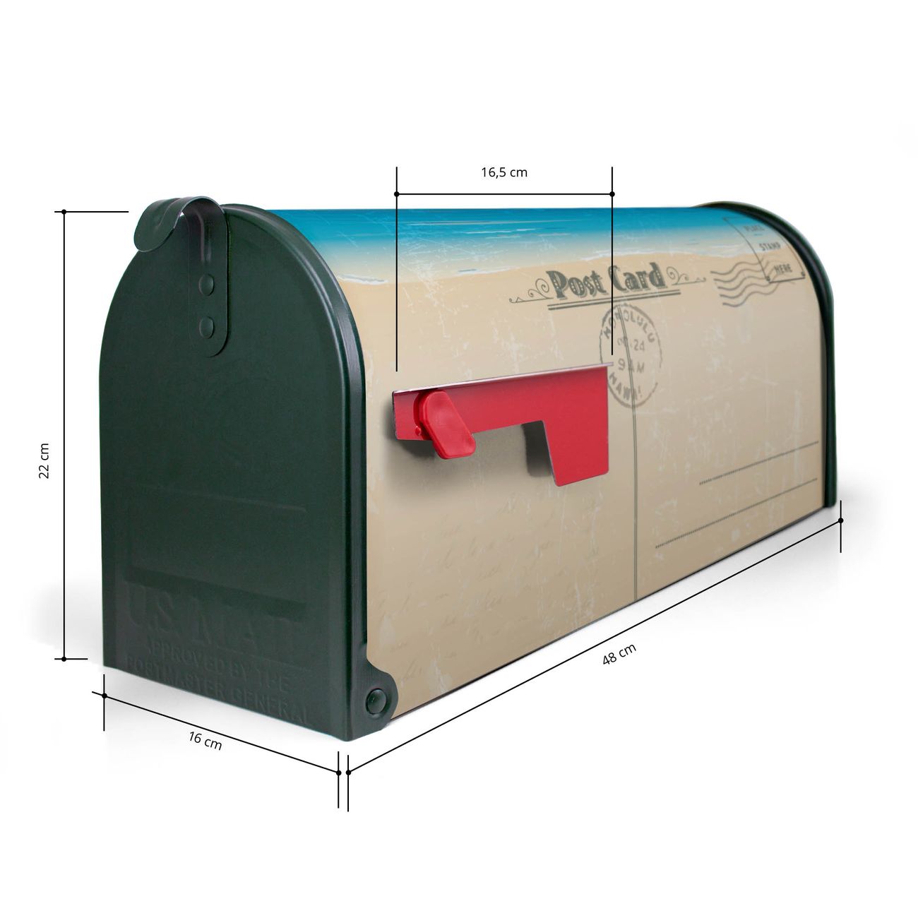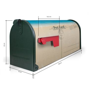 Der amerikanische Briefkasten von banjado mit Postkarte Motiv bietet Ihnen ausreichend Fassungsvermögen, um große A4 Sendungen und Zeitschriften zu empfangen. Die typisch amerikanische rote Fahne zeigt Ihnen an, wenn Sie Post erhalten haben. Die US-Mailbox besteht aus verzinktem Stahlblech welches lackiert wurde und ist 48 x 22 x 16 CM (BxHxT) groß. Die Folie mit Motiv Postkarte besteht aus einer wetter- und UV-resistenten Folie, die mit einem Schutzlaminat überzogen ist, sodass die US Mailbox zusätzlich vor Kratzern geschützt ist. An der Unterkante sind 4 Löcher je Seite um die Mailbox, typisch amerikanisch, an einem Holzpfahl oder einem Zaun zu befestigen. Auf Wunsch können Sie bei uns den passenden Standfuß oder die passende Wandhalterung kaufen um die US-Mailbox sicher zu befestigen. Wir bieten Ihnen ebenfalls Namensschilder, bereits beschriftet oder frei zu beschriften, und verschiedene selbst gestaltete Bitte-Keine-Werbung-Aufkleber.