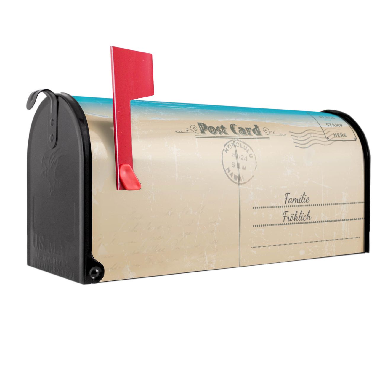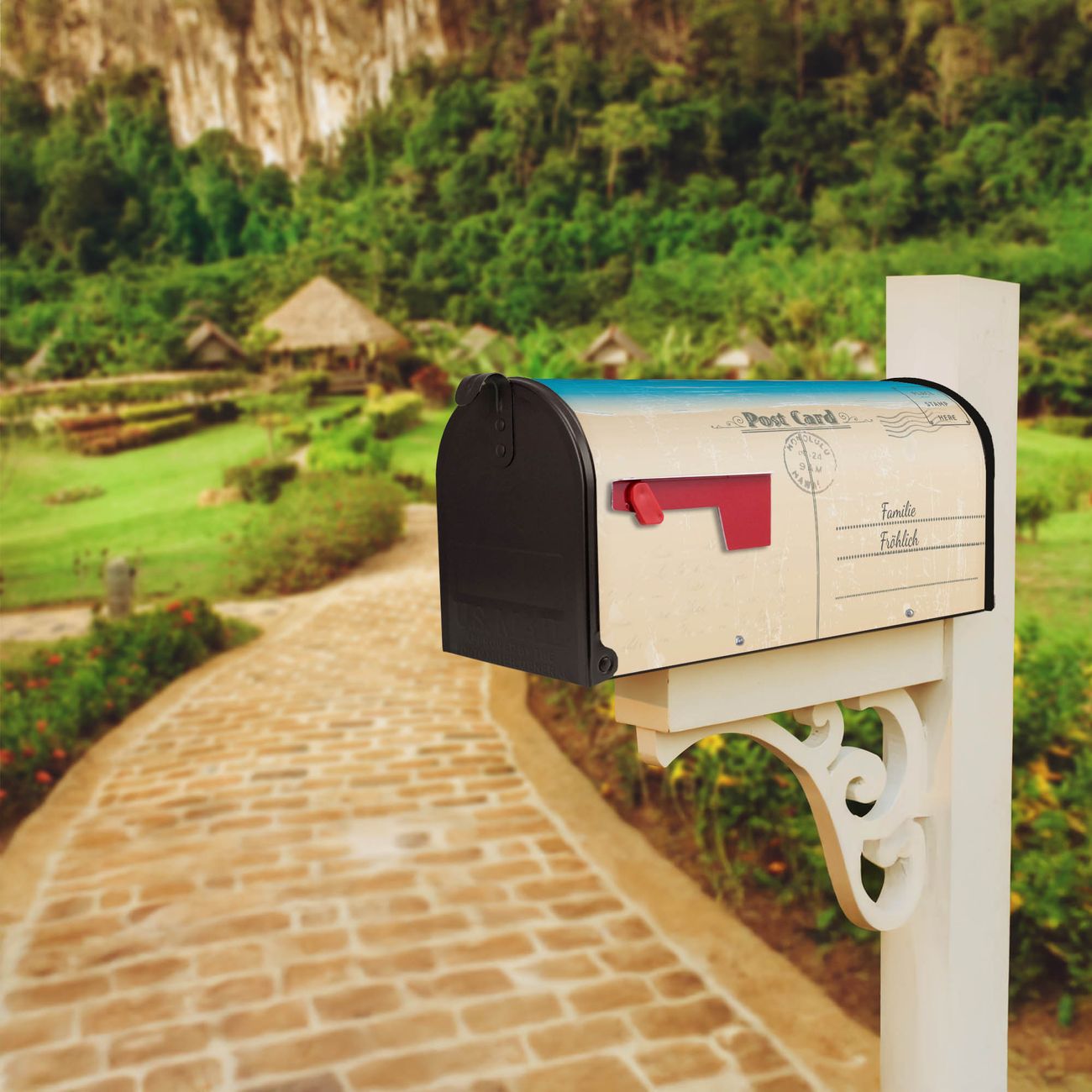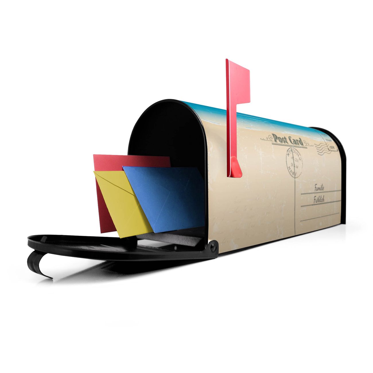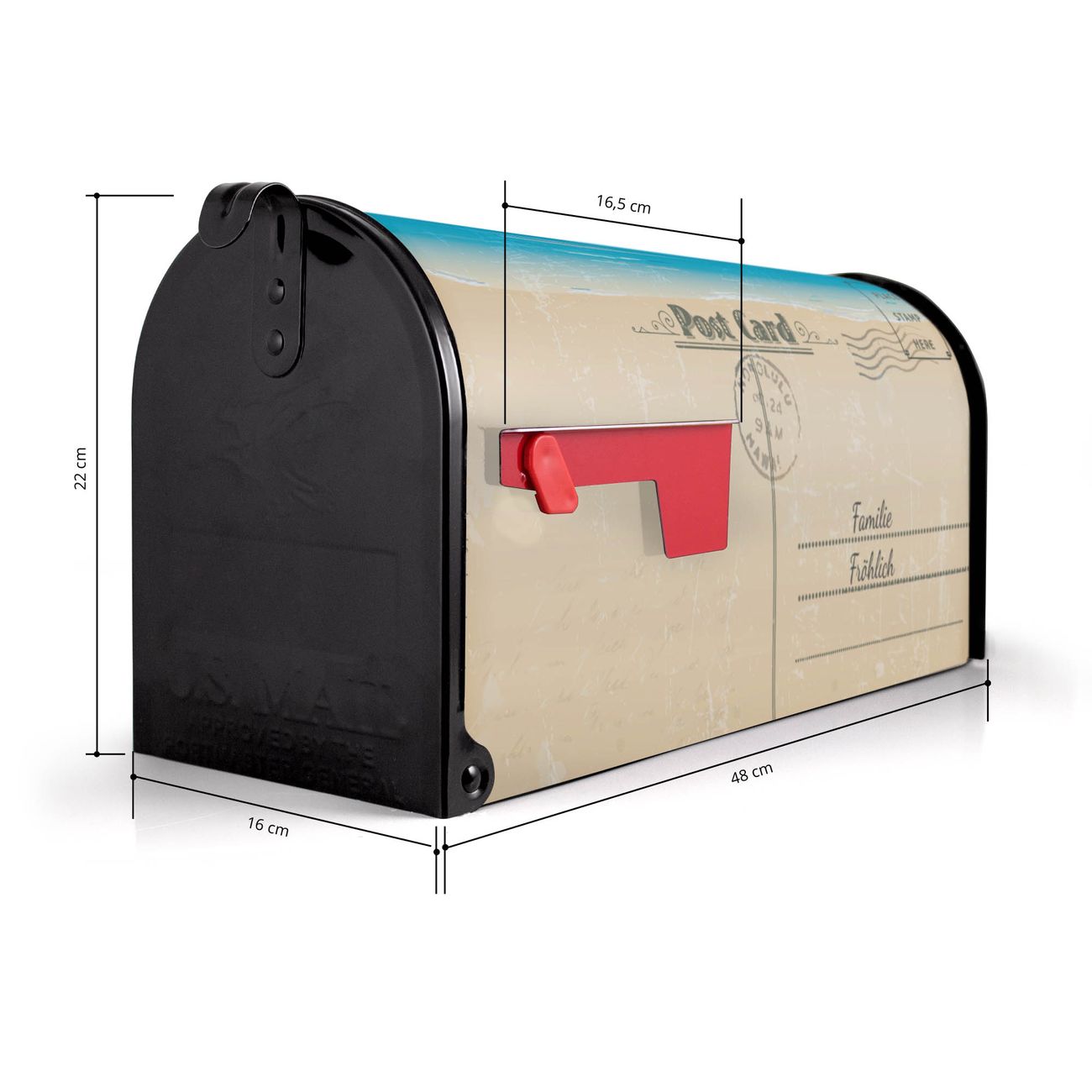 Der amerikanische Briefkasten von banjado mit Postkarte Motiv bietet Ihnen ausreichend Fassungsvermögen, um große A4 Sendungen und Zeitschriften zu empfangen. Die typisch amerikanische rote Fahne zeigt Ihnen an, wenn Sie Post erhalten haben. Die US-Mailbox besteht aus verzinktem Stahlblech welches lackiert wurde und ist 48 x 22 x 16 CM (BxHxT) groß. Die Folie mit Motiv Postkarte besteht aus einer wetter- und UV-resistenten Folie, die mit einem Schutzlaminat überzogen ist, sodass die US Mailbox zusätzlich vor Kratzern geschützt ist. An der Unterkante sind 4 Löcher je Seite um die Mailbox, typisch amerikanisch, an einem Holzpfahl oder einem Zaun zu befestigen. Auf Wunsch können Sie bei uns den passenden Standfuß oder die passende Wandhalterung kaufen um die US-Mailbox sicher zu befestigen. Wir bieten Ihnen ebenfalls Namensschilder, bereits beschriftet oder frei zu beschriften, und verschiedene selbst gestaltete Bitte-Keine-Werbung-Aufkleber.