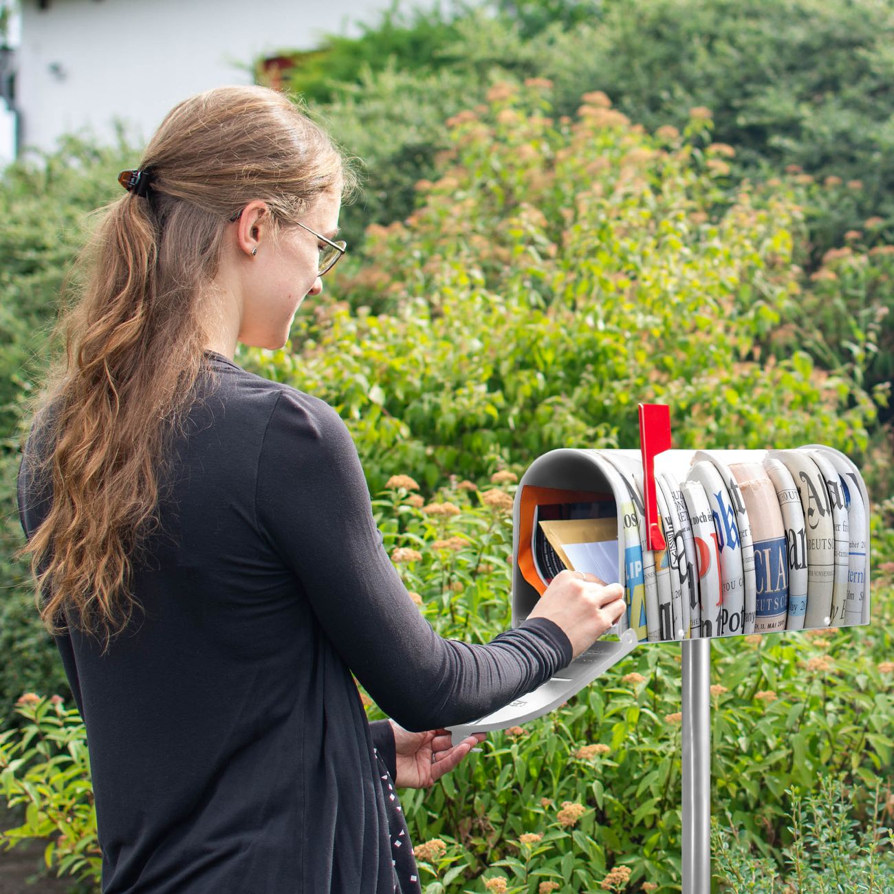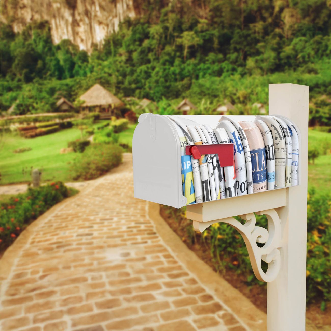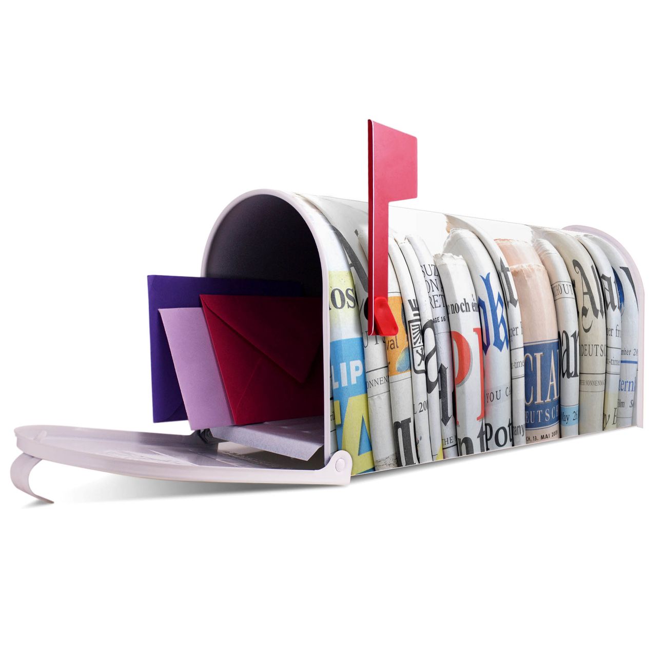 Der amerikanische Briefkasten von banjado mit Presse Motiv bietet Ihnen ausreichend Fassungsvermögen, um große A4 Sendungen und Zeitschriften zu empfangen. Die typisch amerikanische rote Fahne zeigt Ihnen an, wenn Sie Post erhalten haben. Die US-Mailbox besteht aus verzinktem Stahlblech welches lackiert wurde und ist 48 x 22 x 16 CM (BxHxT) groß. Die Folie mit Motiv Presse besteht aus einer wetter- und UV-resistenten Folie, die mit einem Schutzlaminat überzogen ist, sodass die US Mailbox zusätzlich vor Kratzern geschützt ist. An der Unterkante sind 4 Löcher je Seite um die Mailbox, typisch amerikanisch, an einem Holzpfahl oder einem Zaun zu befestigen. Auf Wunsch können Sie bei uns den passenden Standfuß oder die passende Wandhalterung kaufen um die US-Mailbox sicher zu befestigen. Wir bieten Ihnen ebenfalls Namensschilder, bereits beschriftet oder frei zu beschriften, und verschiedene selbst gestaltete Bitte-Keine-Werbung-Aufkleber.