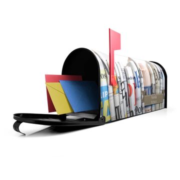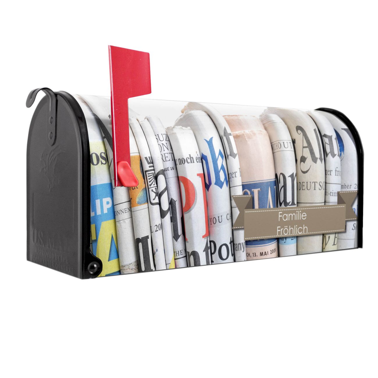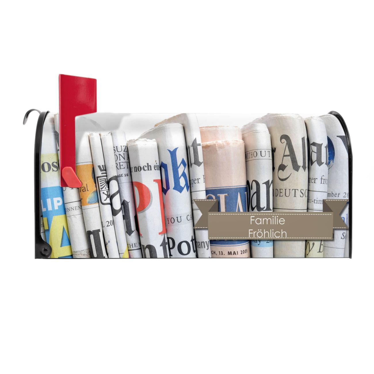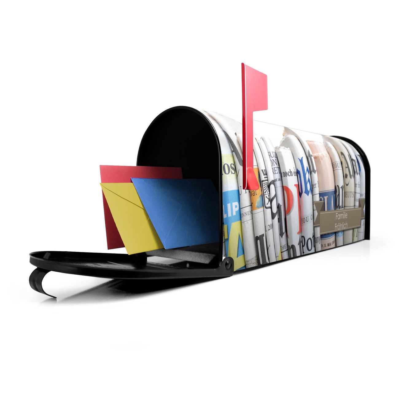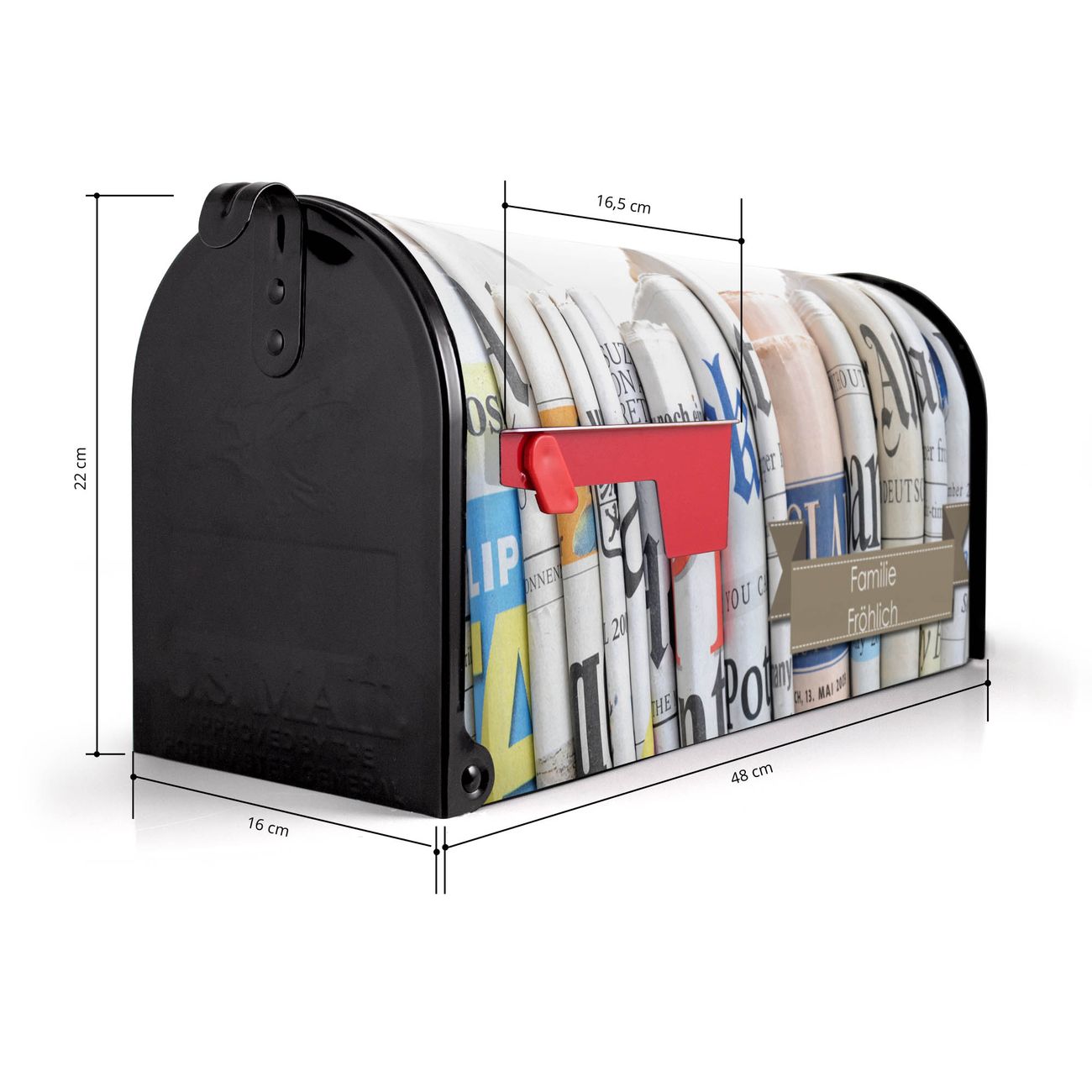 Der amerikanische Briefkasten von banjado mit Presse Motiv bietet Ihnen ausreichend Fassungsvermögen, um große A4 Sendungen und Zeitschriften zu empfangen. Die typisch amerikanische rote Fahne zeigt Ihnen an, wenn Sie Post erhalten haben. Die US-Mailbox besteht aus verzinktem Stahlblech welches lackiert wurde und ist 48 x 22 x 16 CM (BxHxT) groß. Die Folie mit Motiv Presse besteht aus einer wetter- und UV-resistenten Folie, die mit einem Schutzlaminat überzogen ist, sodass die US Mailbox zusätzlich vor Kratzern geschützt ist. An der Unterkante sind 4 Löcher je Seite um die Mailbox, typisch amerikanisch, an einem Holzpfahl oder einem Zaun zu befestigen. Auf Wunsch können Sie bei uns den passenden Standfuß oder die passende Wandhalterung kaufen um die US-Mailbox sicher zu befestigen. Wir bieten Ihnen ebenfalls Namensschilder, bereits beschriftet oder frei zu beschriften, und verschiedene selbst gestaltete Bitte-Keine-Werbung-Aufkleber.