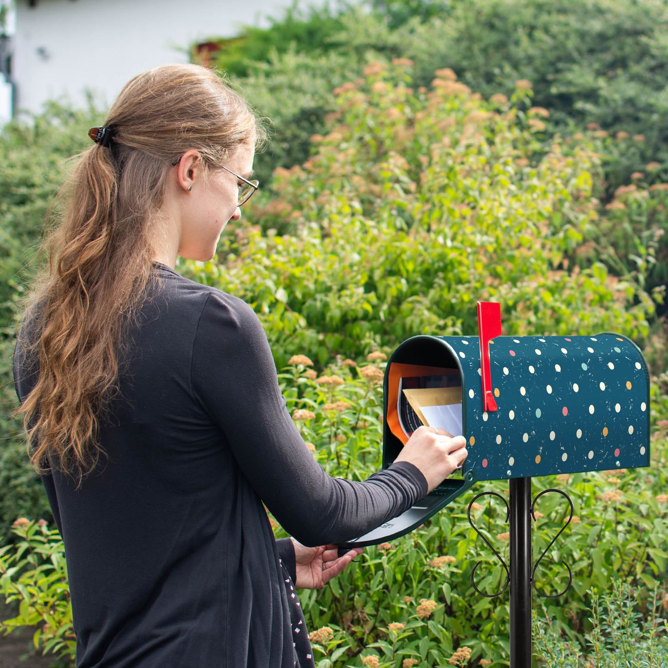 Unser amerikanischer Briefkasten mit dem Motiv Punkte auf Blau hat ein sehr ansprechendes und ausgefallenes Design, ist in der Grundfarbe weiß, grün oder schwarz erhältlich. Damit entlocken Sie Ihren Nachbarn und dem Postboten immer wieder ein Lächeln. Die Mailbox ist ein Original Import aus Mississippi USA und wird von unserer kleinen Manufaktur in Sachsen von Hand veredelt. Die US-Mailbox bietet ausreichend Platz auch für große Sendungen, eine Fahne die Ihnen Post anzeigt, wetterfestes und äußerst stabiles Material - so macht Post empfangen Freude.