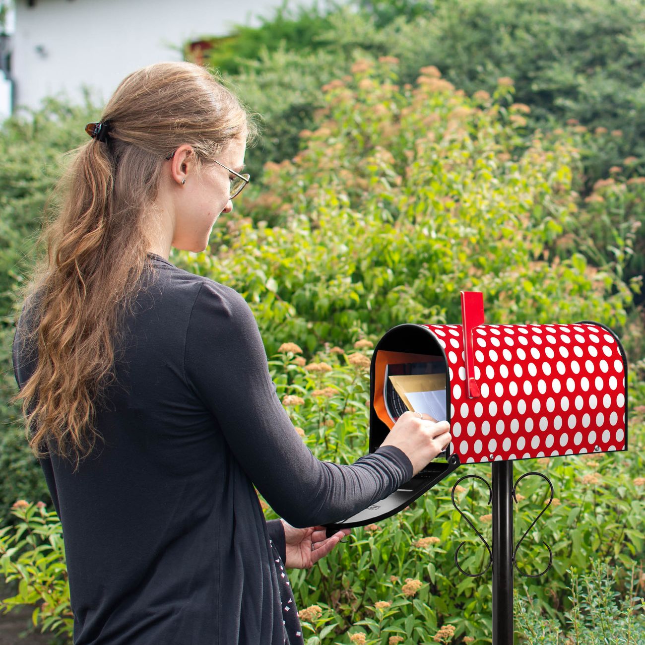 Unser amerikanischer Briefkasten mit dem Motiv Punkte Rot hat ein sehr ansprechendes und ausgefallenes Design, ist in der Grundfarbe weiß, grün oder schwarz erhältlich. Damit entlocken Sie Ihren Nachbarn und dem Postboten immer wieder ein Lächeln. Die Mailbox ist ein Original Import aus Mississippi USA und wird von unserer kleinen Manufaktur in Sachsen von Hand veredelt. Die US-Mailbox bietet ausreichend Platz auch für große Sendungen, eine Fahne die Ihnen Post anzeigt, wetterfestes und äußerst stabiles Material - so macht Post empfangen Freude.