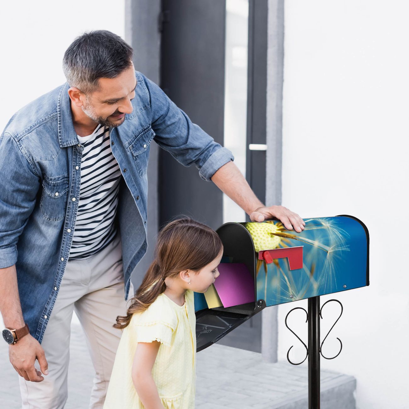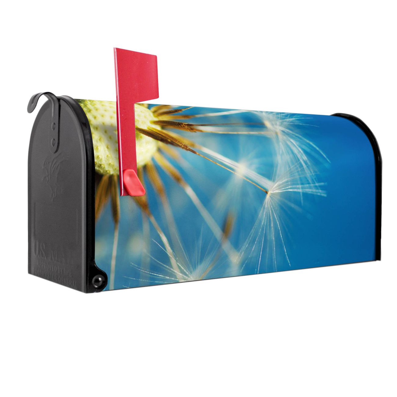 Unser amerikanischer Briefkasten mit dem Motiv Pusteblume Detail hat ein sehr ansprechendes und ausgefallenes Design, ist in der Grundfarbe weiß, grün oder schwarz erhältlich. Damit entlocken Sie Ihren Nachbarn und dem Postboten immer wieder ein Lächeln. Die Mailbox ist ein Original Import aus Mississippi USA und wird von unserer kleinen Manufaktur in Sachsen von Hand veredelt. Die US-Mailbox bietet ausreichend Platz auch für große Sendungen, eine Fahne die Ihnen Post anzeigt, wetterfestes und äußerst stabiles Material - so macht Post empfangen Freude.