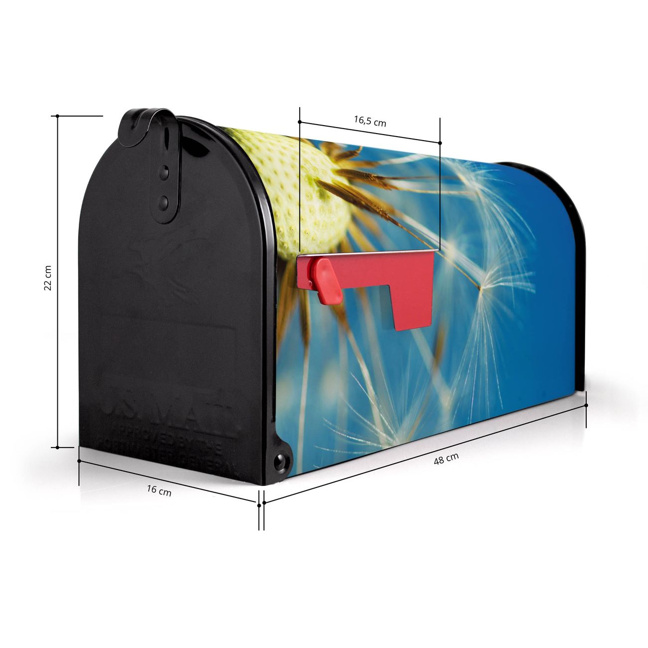 Der amerikanische Briefkasten von banjado mit Pusteblume Detail Motiv bietet Ihnen ausreichend Fassungsvermögen, um große A4 Sendungen und Zeitschriften zu empfangen. Die typisch amerikanische rote Fahne zeigt Ihnen an, wenn Sie Post erhalten haben. Die US-Mailbox besteht aus verzinktem Stahlblech welches lackiert wurde und ist 48 x 22 x 16 CM (BxHxT) groß. Die Folie mit Motiv Pusteblume Detail besteht aus einer wetter- und UV-resistenten Folie, die mit einem Schutzlaminat überzogen ist, sodass die US Mailbox zusätzlich vor Kratzern geschützt ist. An der Unterkante sind 4 Löcher je Seite um die Mailbox, typisch amerikanisch, an einem Holzpfahl oder einem Zaun zu befestigen. Auf Wunsch können Sie bei uns den passenden Standfuß oder die passende Wandhalterung kaufen um die US-Mailbox sicher zu befestigen. Wir bieten Ihnen ebenfalls Namensschilder, bereits beschriftet oder frei zu beschriften, und verschiedene selbst gestaltete Bitte-Keine-Werbung-Aufkleber.