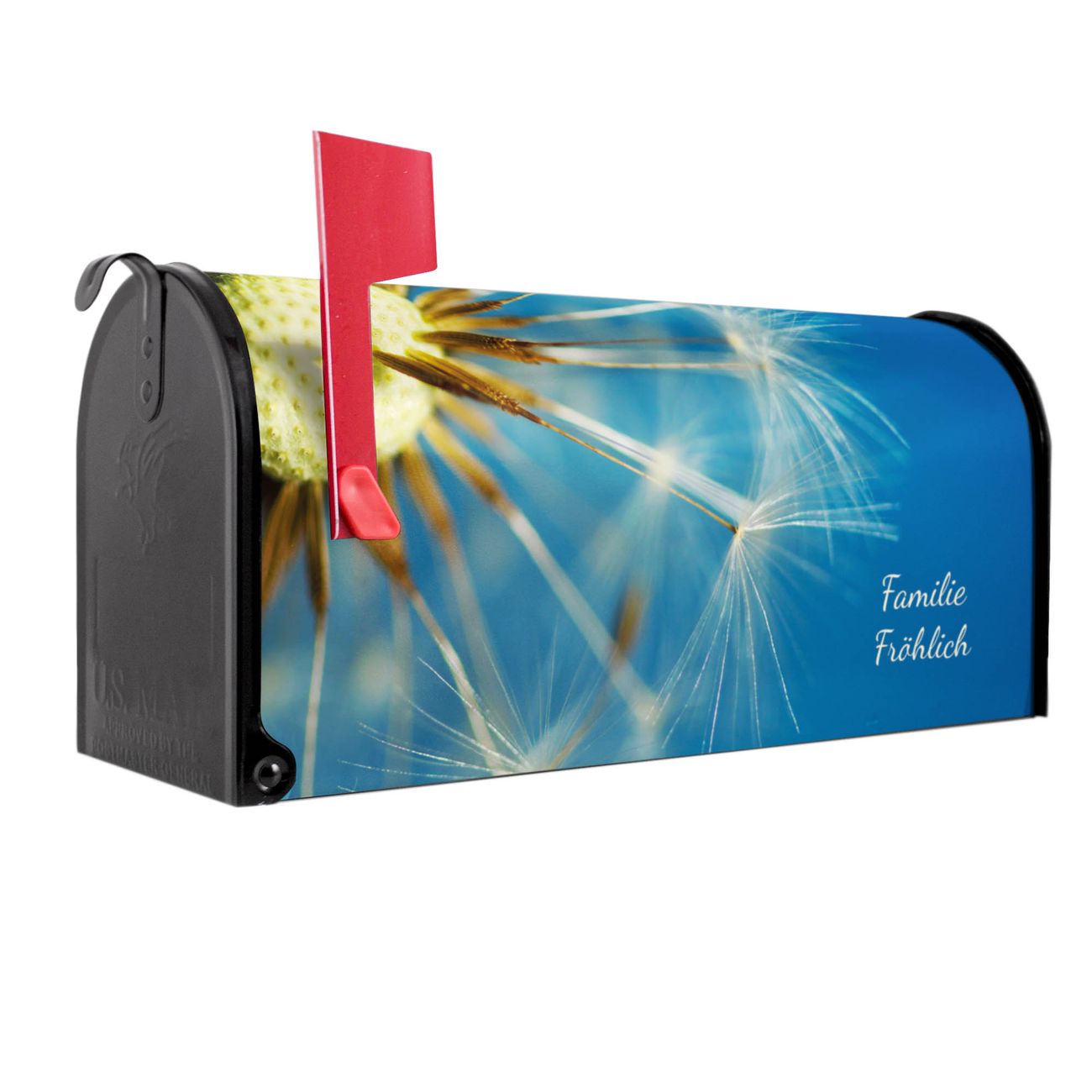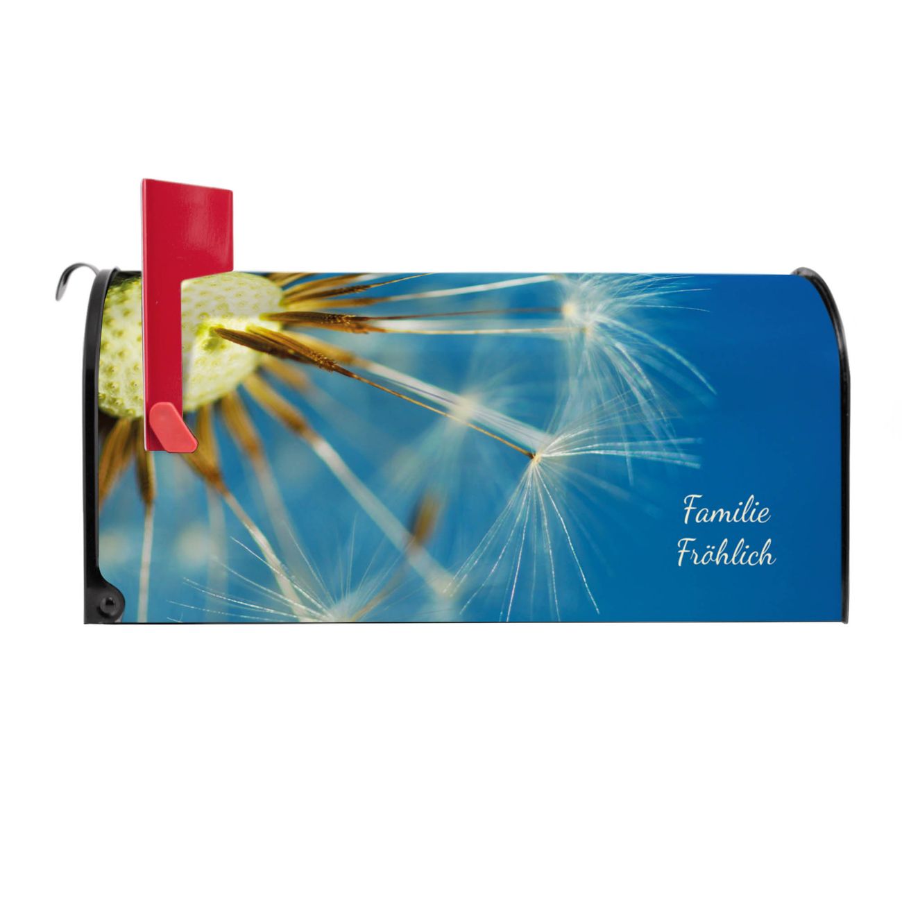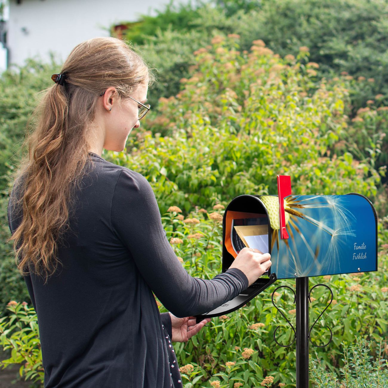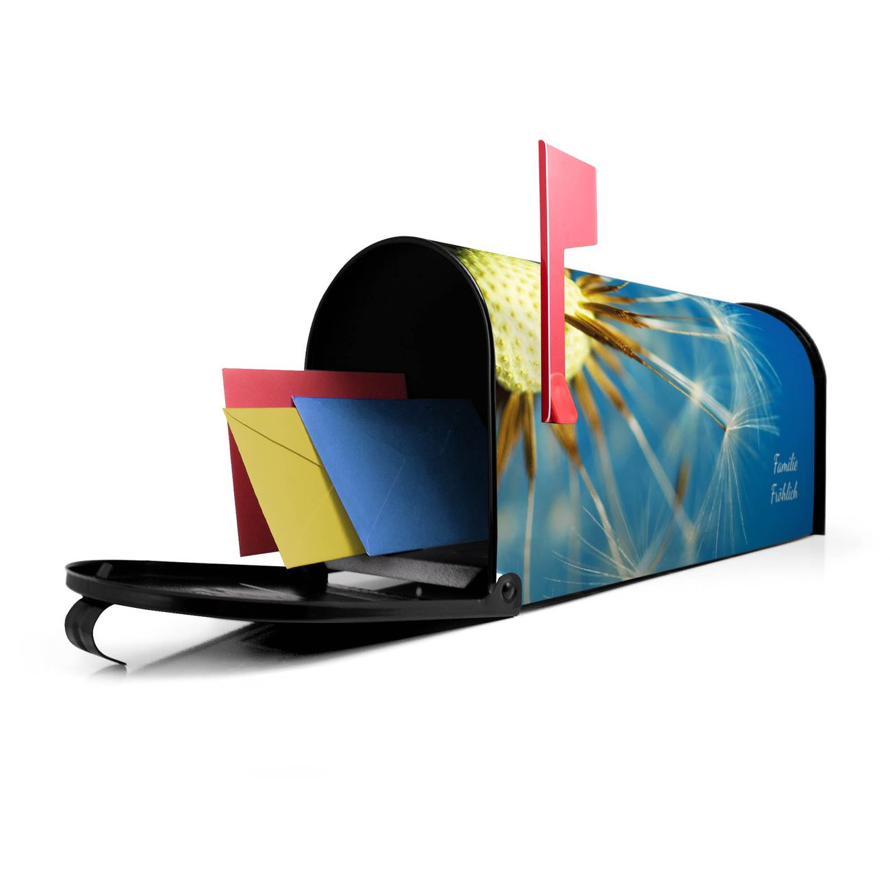 Der amerikanische Briefkasten von banjado mit Pusteblume Detail Motiv bietet Ihnen ausreichend Fassungsvermögen, um große A4 Sendungen und Zeitschriften zu empfangen. Die typisch amerikanische rote Fahne zeigt Ihnen an, wenn Sie Post erhalten haben. Die US-Mailbox besteht aus verzinktem Stahlblech welches lackiert wurde und ist 48 x 22 x 16 CM (BxHxT) groß. Die Folie mit Motiv Pusteblume Detail besteht aus einer wetter- und UV-resistenten Folie, die mit einem Schutzlaminat überzogen ist, sodass die US Mailbox zusätzlich vor Kratzern geschützt ist. An der Unterkante sind 4 Löcher je Seite um die Mailbox, typisch amerikanisch, an einem Holzpfahl oder einem Zaun zu befestigen. Auf Wunsch können Sie bei uns den passenden Standfuß oder die passende Wandhalterung kaufen um die US-Mailbox sicher zu befestigen. Wir bieten Ihnen ebenfalls Namensschilder, bereits beschriftet oder frei zu beschriften, und verschiedene selbst gestaltete Bitte-Keine-Werbung-Aufkleber.