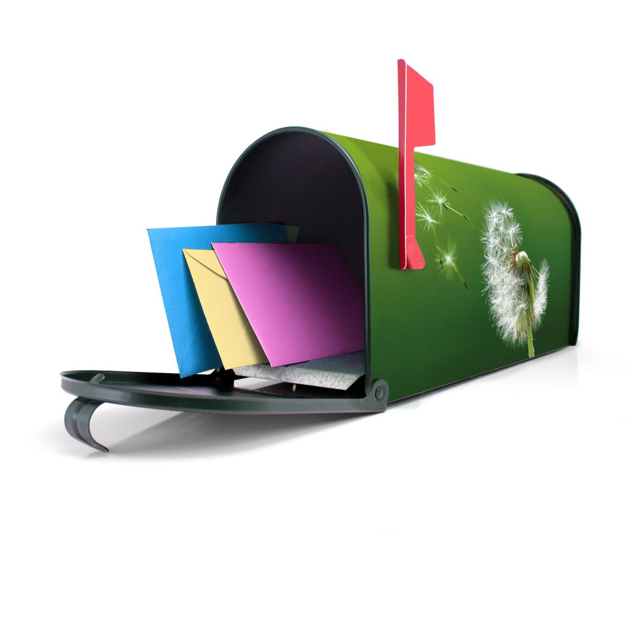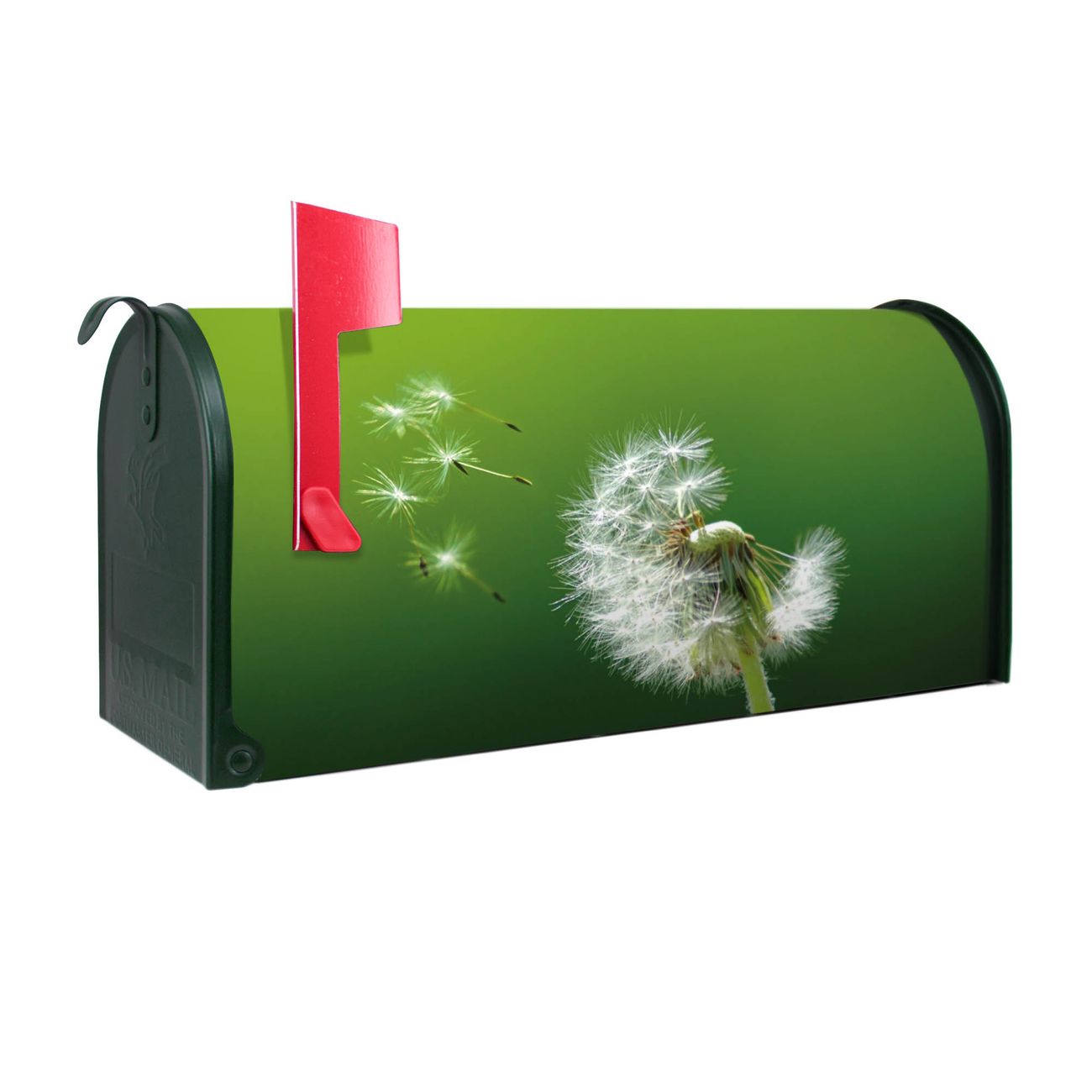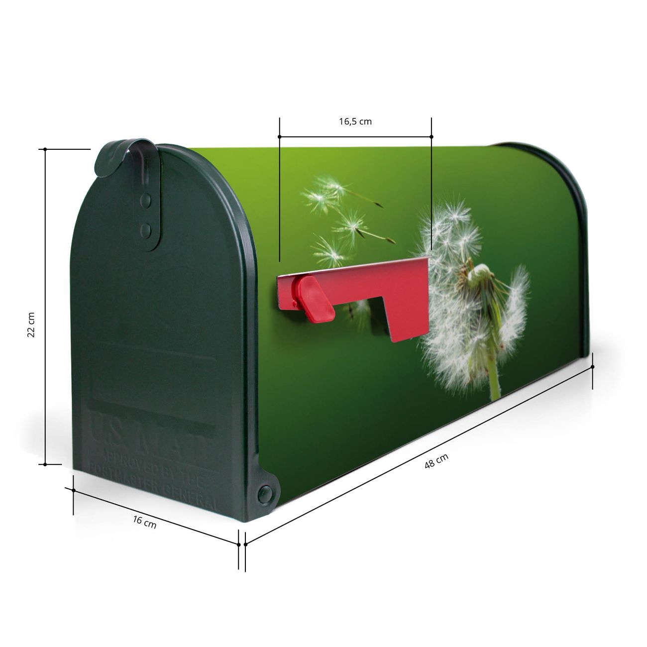 Der amerikanische Briefkasten von banjado mit Pusteblume Motiv bietet Ihnen ausreichend Fassungsvermögen, um große A4 Sendungen und Zeitschriften zu empfangen. Die typisch amerikanische rote Fahne zeigt Ihnen an, wenn Sie Post erhalten haben. Die US-Mailbox besteht aus verzinktem Stahlblech welches lackiert wurde und ist 48 x 22 x 16 CM (BxHxT) groß. Die Folie mit Motiv Pusteblume besteht aus einer wetter- und UV-resistenten Folie, die mit einem Schutzlaminat überzogen ist, sodass die US Mailbox zusätzlich vor Kratzern geschützt ist. An der Unterkante sind 4 Löcher je Seite um die Mailbox, typisch amerikanisch, an einem Holzpfahl oder einem Zaun zu befestigen. Auf Wunsch können Sie bei uns den passenden Standfuß oder die passende Wandhalterung kaufen um die US-Mailbox sicher zu befestigen. Wir bieten Ihnen ebenfalls Namensschilder, bereits beschriftet oder frei zu beschriften, und verschiedene selbst gestaltete Bitte-Keine-Werbung-Aufkleber.