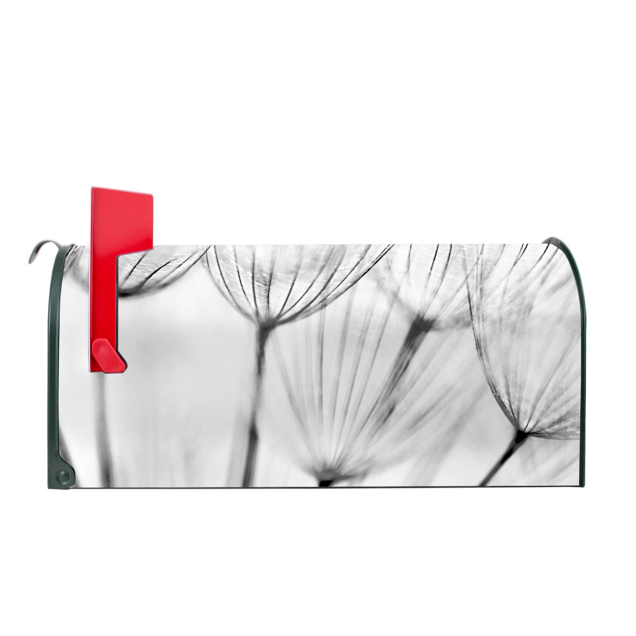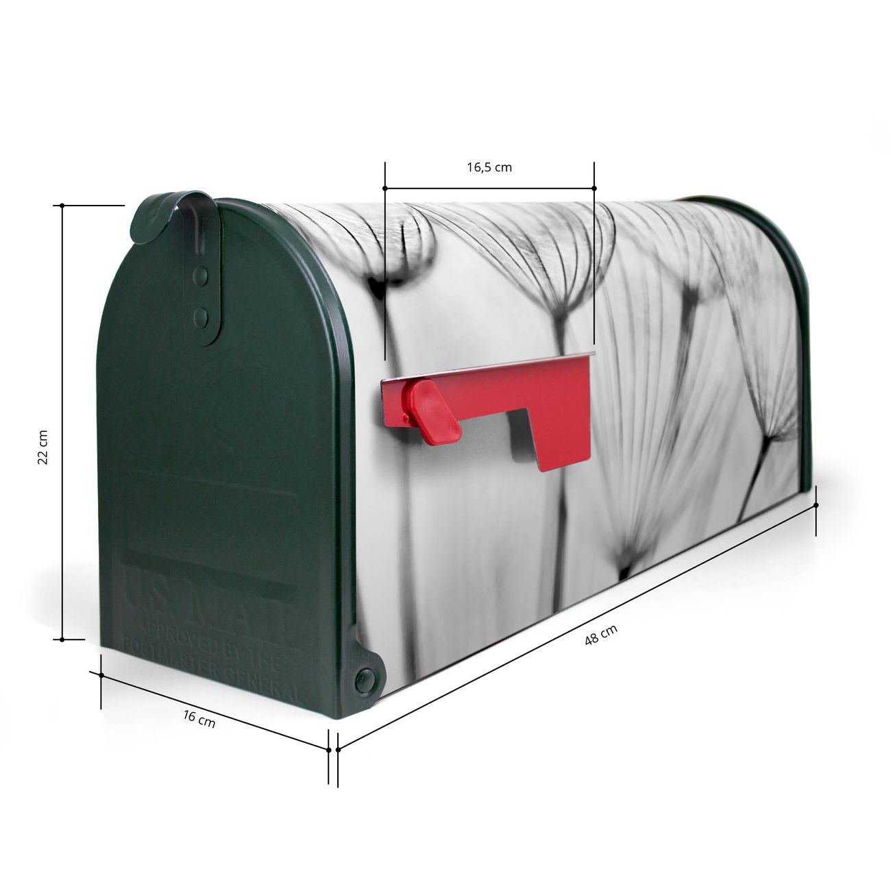 Der amerikanische Briefkasten von banjado mit Pusteblumen SW Motiv bietet Ihnen ausreichend Fassungsvermögen, um große A4 Sendungen und Zeitschriften zu empfangen. Die typisch amerikanische rote Fahne zeigt Ihnen an, wenn Sie Post erhalten haben. Die US-Mailbox besteht aus verzinktem Stahlblech welches lackiert wurde und ist 48 x 22 x 16 CM (BxHxT) groß. Die Folie mit Motiv Pusteblumen SW besteht aus einer wetter- und UV-resistenten Folie, die mit einem Schutzlaminat überzogen ist, sodass die US Mailbox zusätzlich vor Kratzern geschützt ist. An der Unterkante sind 4 Löcher je Seite um die Mailbox, typisch amerikanisch, an einem Holzpfahl oder einem Zaun zu befestigen. Auf Wunsch können Sie bei uns den passenden Standfuß oder die passende Wandhalterung kaufen um die US-Mailbox sicher zu befestigen. Wir bieten Ihnen ebenfalls Namensschilder, bereits beschriftet oder frei zu beschriften, und verschiedene selbst gestaltete Bitte-Keine-Werbung-Aufkleber.