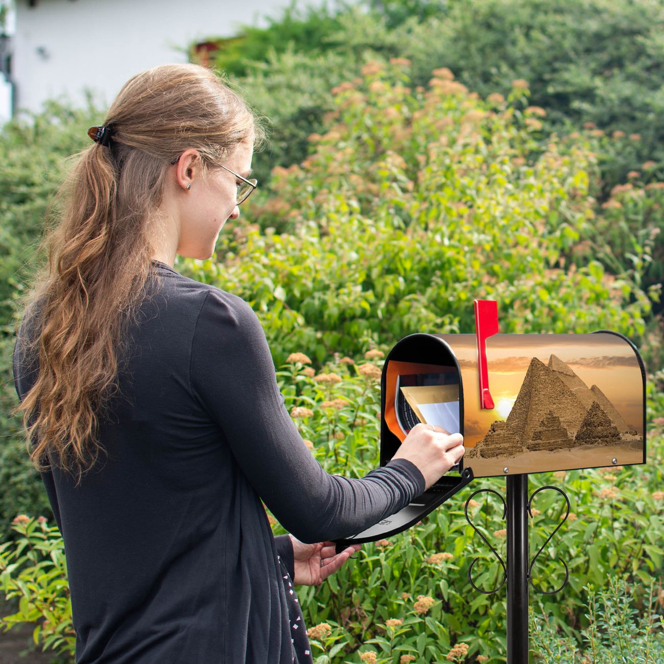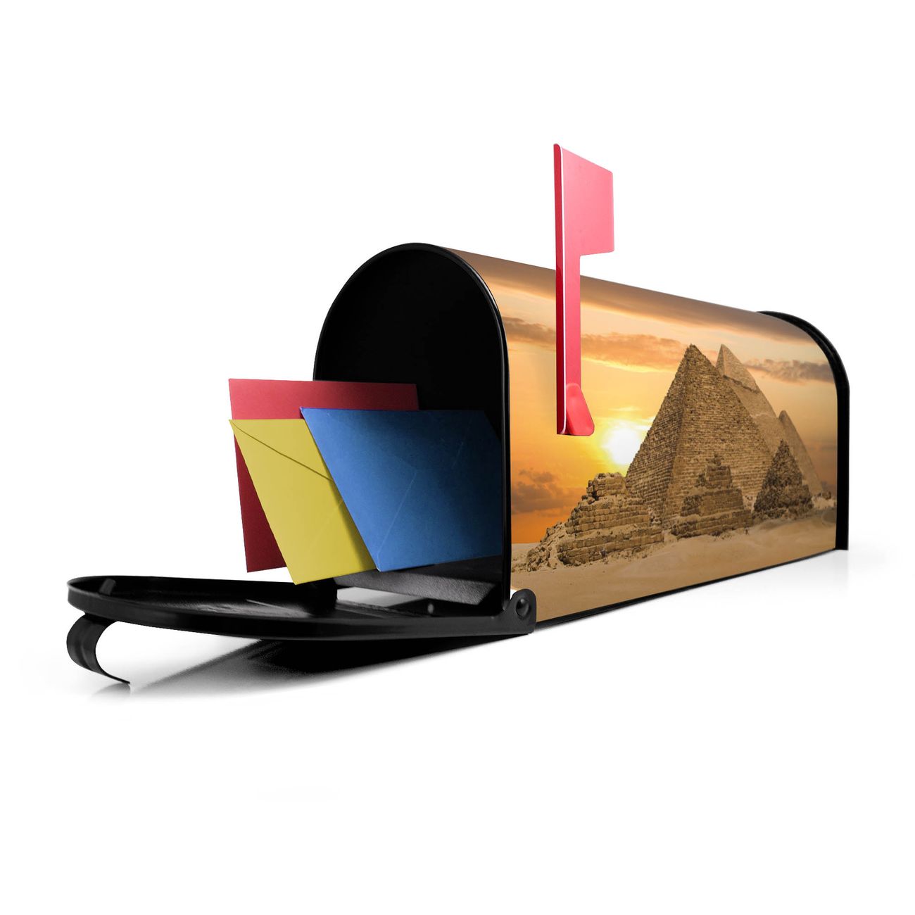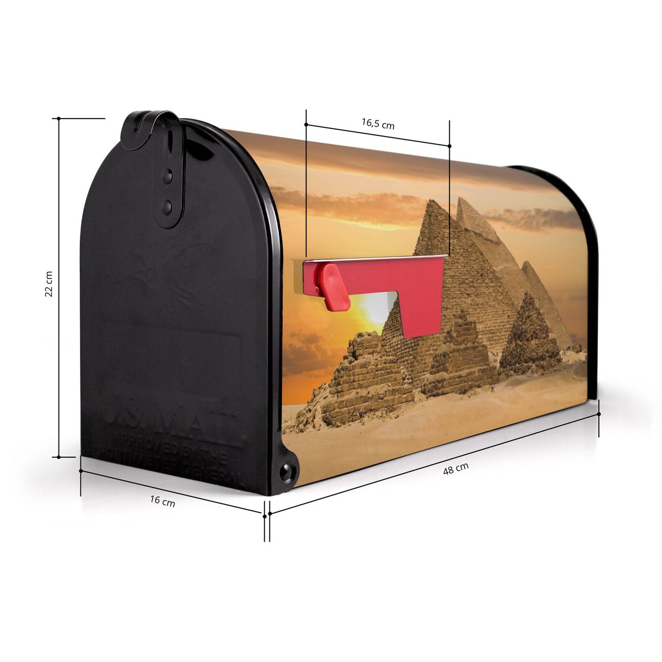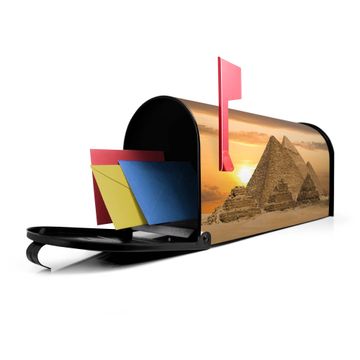 Der amerikanische Briefkasten von banjado mit Pyramiden Motiv bietet Ihnen ausreichend Fassungsvermögen, um große A4 Sendungen und Zeitschriften zu empfangen. Die typisch amerikanische rote Fahne zeigt Ihnen an, wenn Sie Post erhalten haben. Die US-Mailbox besteht aus verzinktem Stahlblech welches lackiert wurde und ist 48 x 22 x 16 CM (BxHxT) groß. Die Folie mit Motiv Pyramiden besteht aus einer wetter- und UV-resistenten Folie, die mit einem Schutzlaminat überzogen ist, sodass die US Mailbox zusätzlich vor Kratzern geschützt ist. An der Unterkante sind 4 Löcher je Seite um die Mailbox, typisch amerikanisch, an einem Holzpfahl oder einem Zaun zu befestigen. Auf Wunsch können Sie bei uns den passenden Standfuß oder die passende Wandhalterung kaufen um die US-Mailbox sicher zu befestigen. Wir bieten Ihnen ebenfalls Namensschilder, bereits beschriftet oder frei zu beschriften, und verschiedene selbst gestaltete Bitte-Keine-Werbung-Aufkleber.