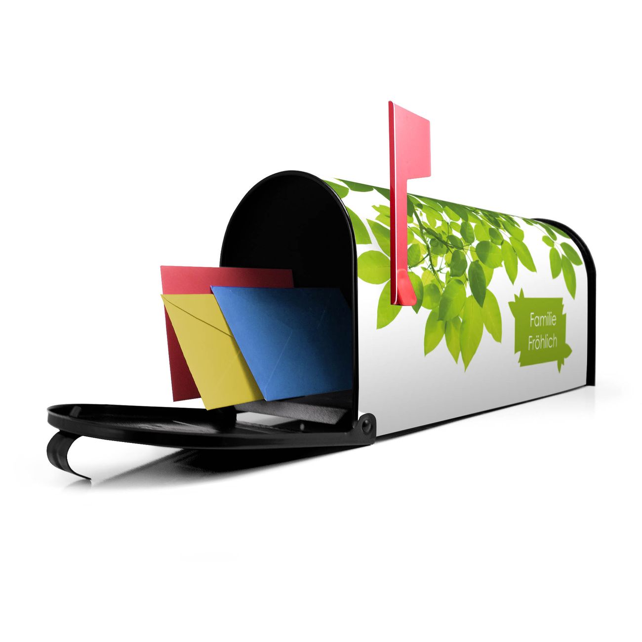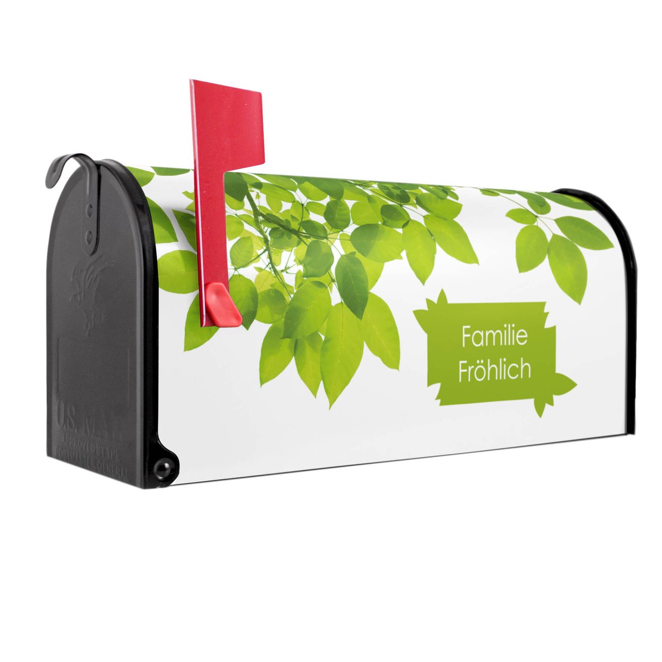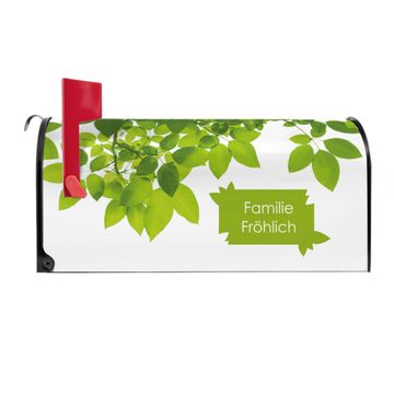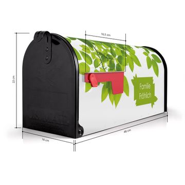 Der amerikanische Briefkasten von banjado mit Rahmen Blätter Motiv bietet Ihnen ausreichend Fassungsvermögen, um große A4 Sendungen und Zeitschriften zu empfangen. Die typisch amerikanische rote Fahne zeigt Ihnen an, wenn Sie Post erhalten haben. Die US-Mailbox besteht aus verzinktem Stahlblech welches lackiert wurde und ist 48 x 22 x 16 CM (BxHxT) groß. Die Folie mit Motiv Rahmen Blätter besteht aus einer wetter- und UV-resistenten Folie, die mit einem Schutzlaminat überzogen ist, sodass die US Mailbox zusätzlich vor Kratzern geschützt ist. An der Unterkante sind 4 Löcher je Seite um die Mailbox, typisch amerikanisch, an einem Holzpfahl oder einem Zaun zu befestigen. Auf Wunsch können Sie bei uns den passenden Standfuß oder die passende Wandhalterung kaufen um die US-Mailbox sicher zu befestigen. Wir bieten Ihnen ebenfalls Namensschilder, bereits beschriftet oder frei zu beschriften, und verschiedene selbst gestaltete Bitte-Keine-Werbung-Aufkleber.