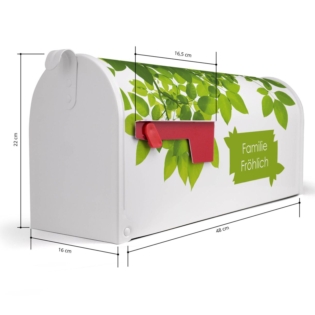 Der amerikanische Briefkasten von banjado mit WT Rahmen Blätter Motiv bietet Ihnen ausreichend Fassungsvermögen, um große A4 Sendungen und Zeitschriften zu empfangen. Die typisch amerikanische rote Fahne zeigt Ihnen an, wenn Sie Post erhalten haben. Die US-Mailbox besteht aus verzinktem Stahlblech welches lackiert wurde und ist 48 x 22 x 16 CM (BxHxT) groß. Die Folie mit Motiv WT Rahmen Blätter besteht aus einer wetter- und UV-resistenten Folie, die mit einem Schutzlaminat überzogen ist, sodass die US Mailbox zusätzlich vor Kratzern geschützt ist. An der Unterkante sind 4 Löcher je Seite um die Mailbox, typisch amerikanisch, an einem Holzpfahl oder einem Zaun zu befestigen. Auf Wunsch können Sie bei uns den passenden Standfuß oder die passende Wandhalterung kaufen um die US-Mailbox sicher zu befestigen. Wir bieten Ihnen ebenfalls Namensschilder, bereits beschriftet oder frei zu beschriften, und verschiedene selbst gestaltete Bitte-Keine-Werbung-Aufkleber.