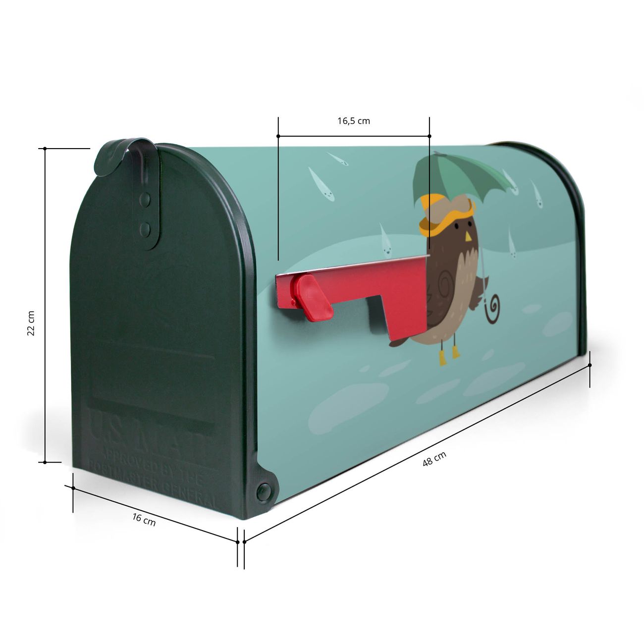 Unser amerikanischer Briefkasten mit dem Motiv Rainbird hat ein sehr ansprechendes und ausgefallenes Design, ist in der Grundfarbe weiß, grün oder schwarz erhältlich. Damit entlocken Sie Ihren Nachbarn und dem Postboten immer wieder ein Lächeln. Die Mailbox ist ein Original Import aus Mississippi USA und wird von unserer kleinen Manufaktur in Sachsen von Hand veredelt. Die US-Mailbox bietet ausreichend Platz auch für große Sendungen, eine Fahne die Ihnen Post anzeigt, wetterfestes und äußerst stabiles Material - so macht Post empfangen Freude.