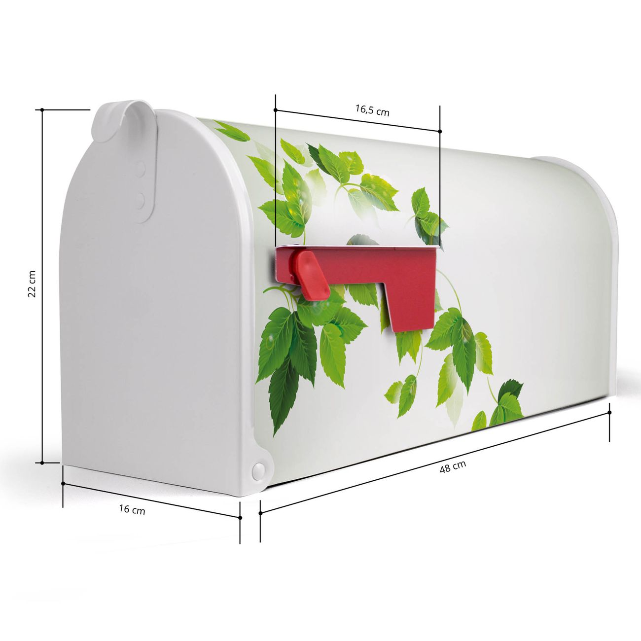 Der amerikanische Briefkasten von banjado mit Ranke Gelb Weiß Motiv bietet Ihnen ausreichend Fassungsvermögen, um große A4 Sendungen und Zeitschriften zu empfangen. Die typisch amerikanische rote Fahne zeigt Ihnen an, wenn Sie Post erhalten haben. Die US-Mailbox besteht aus verzinktem Stahlblech welches lackiert wurde und ist 48 x 22 x 16 CM (BxHxT) groß. Die Folie mit Motiv Ranke Gelb Weiß besteht aus einer wetter- und UV-resistenten Folie, die mit einem Schutzlaminat überzogen ist, sodass die US Mailbox zusätzlich vor Kratzern geschützt ist. An der Unterkante sind 4 Löcher je Seite um die Mailbox, typisch amerikanisch, an einem Holzpfahl oder einem Zaun zu befestigen. Auf Wunsch können Sie bei uns den passenden Standfuß oder die passende Wandhalterung kaufen um die US-Mailbox sicher zu befestigen. Wir bieten Ihnen ebenfalls Namensschilder, bereits beschriftet oder frei zu beschriften, und verschiedene selbst gestaltete Bitte-Keine-Werbung-Aufkleber.