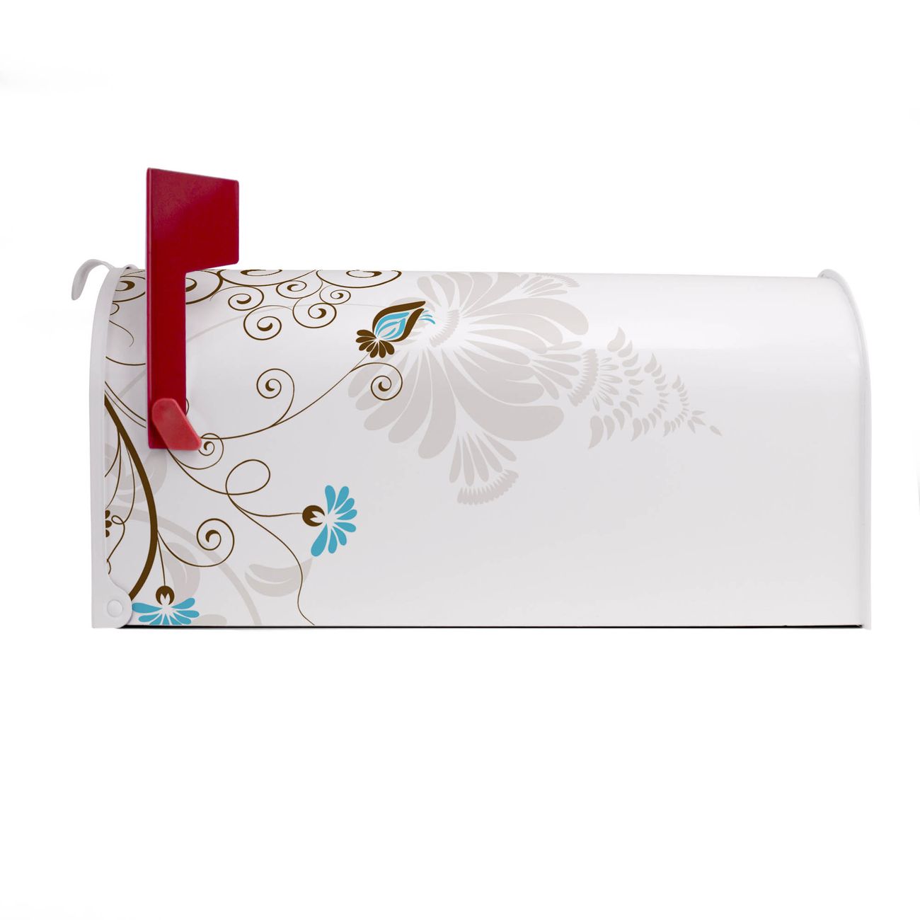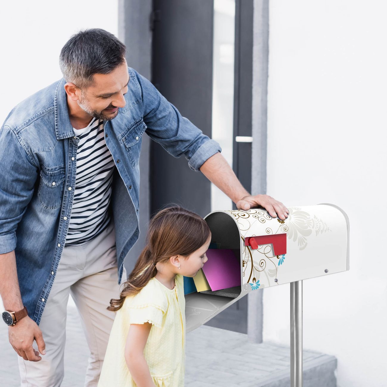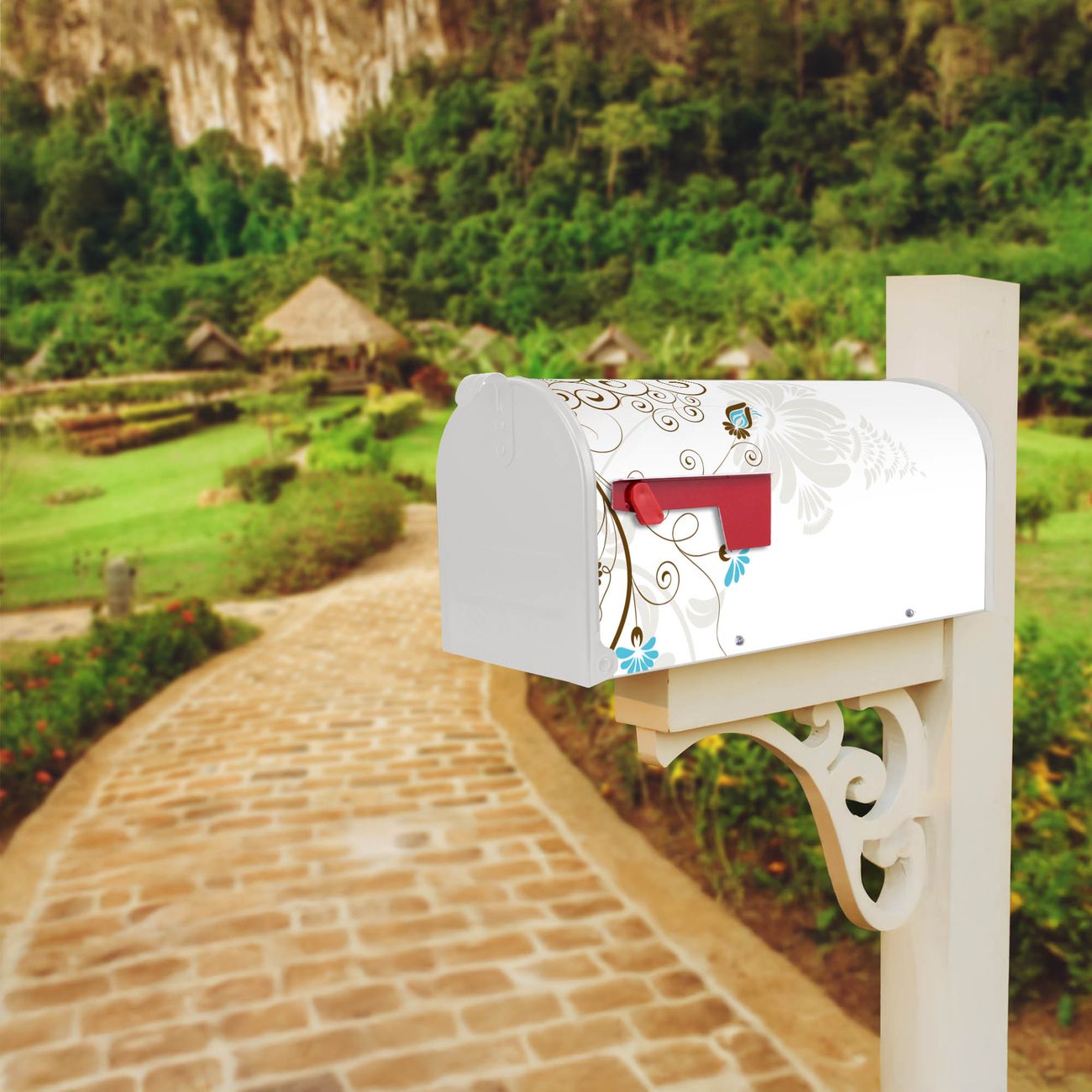 Der amerikanische Briefkasten von banjado mit Rankenrahmen Motiv bietet Ihnen ausreichend Fassungsvermögen, um große A4 Sendungen und Zeitschriften zu empfangen. Die typisch amerikanische rote Fahne zeigt Ihnen an, wenn Sie Post erhalten haben. Die US-Mailbox besteht aus verzinktem Stahlblech welches lackiert wurde und ist 48 x 22 x 16 CM (BxHxT) groß. Die Folie mit Motiv Rankenrahmen besteht aus einer wetter- und UV-resistenten Folie, die mit einem Schutzlaminat überzogen ist, sodass die US Mailbox zusätzlich vor Kratzern geschützt ist. An der Unterkante sind 4 Löcher je Seite um die Mailbox, typisch amerikanisch, an einem Holzpfahl oder einem Zaun zu befestigen. Auf Wunsch können Sie bei uns den passenden Standfuß oder die passende Wandhalterung kaufen um die US-Mailbox sicher zu befestigen. Wir bieten Ihnen ebenfalls Namensschilder, bereits beschriftet oder frei zu beschriften, und verschiedene selbst gestaltete Bitte-Keine-Werbung-Aufkleber.
