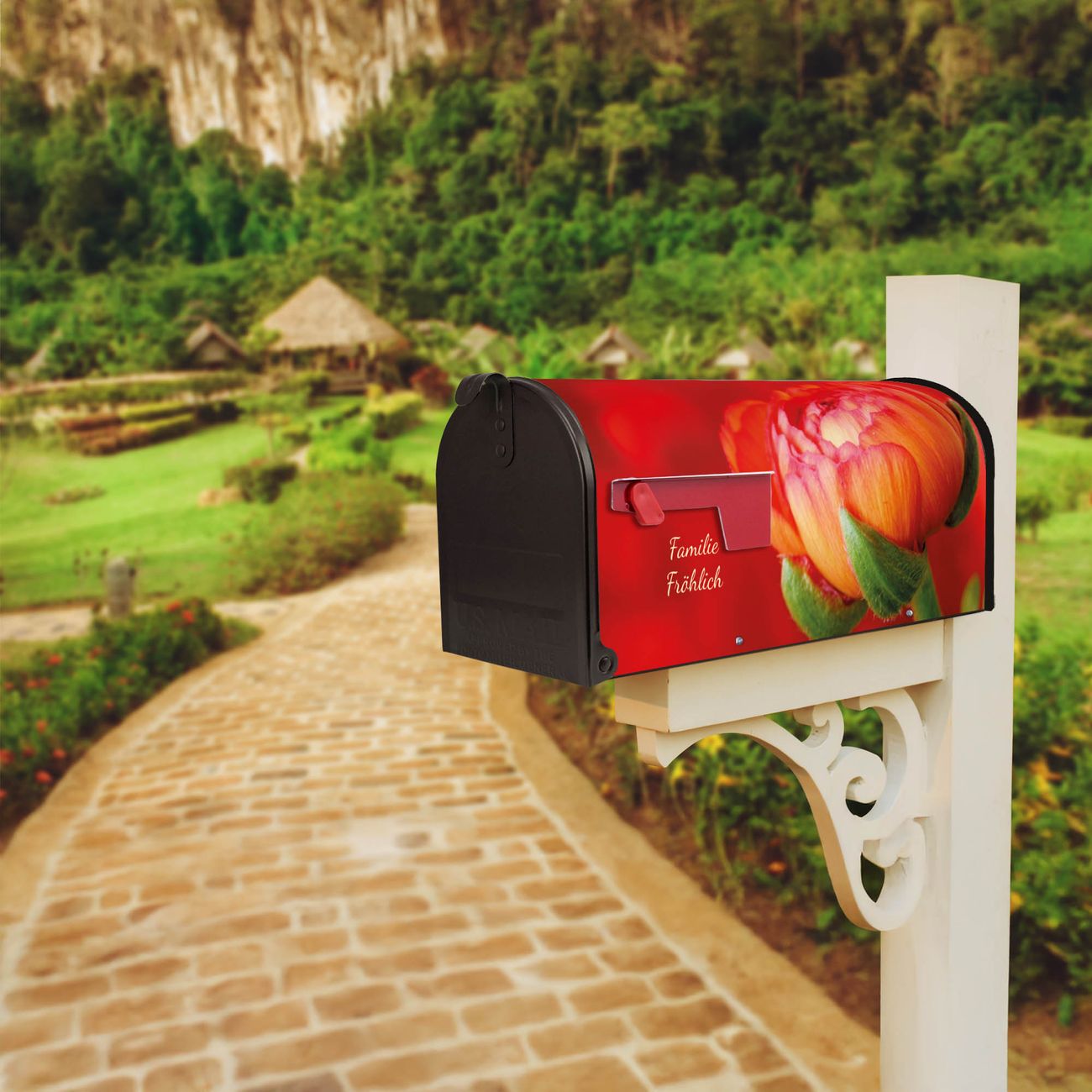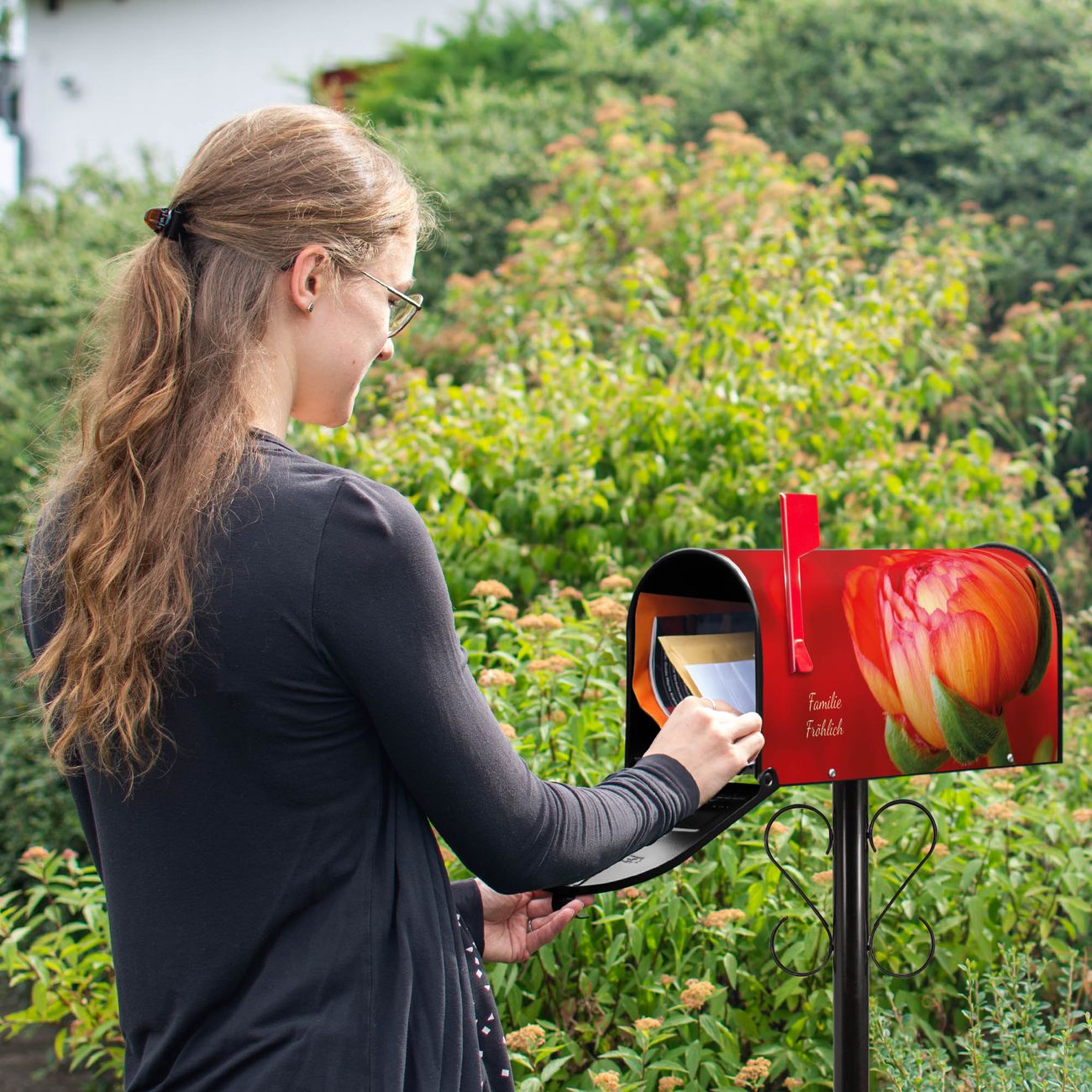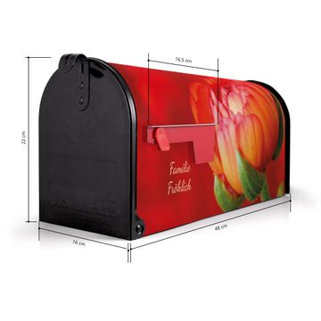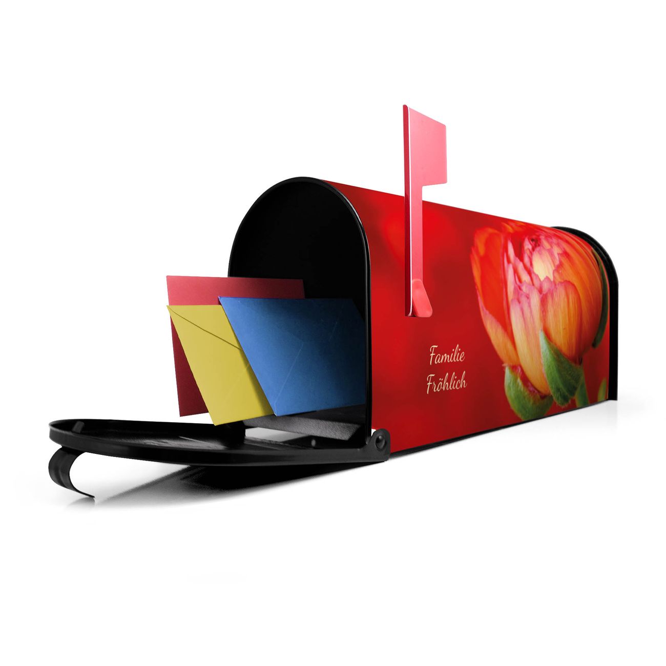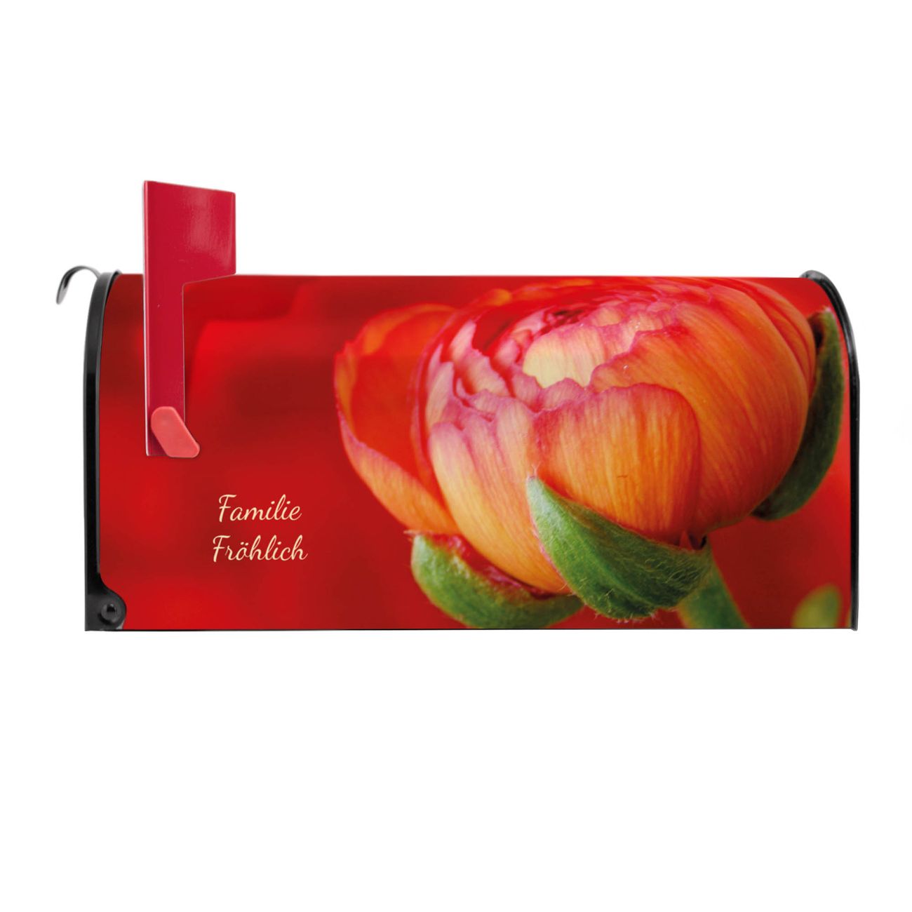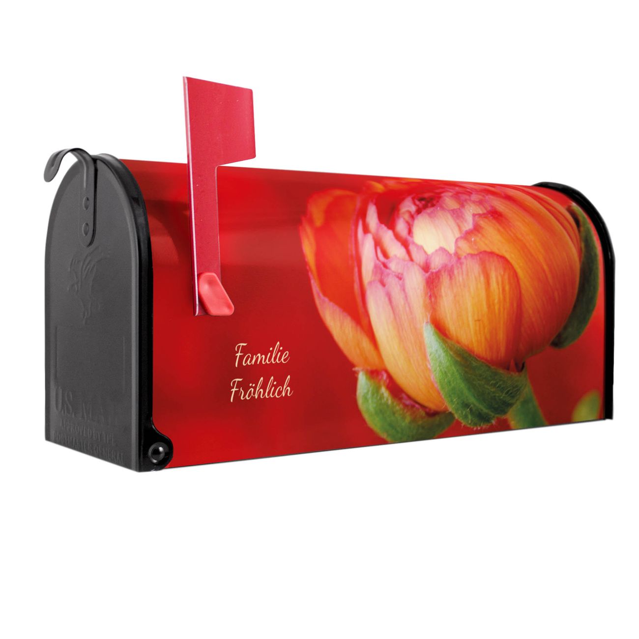 Der amerikanische Briefkasten von banjado mit Ranunkel Motiv bietet Ihnen ausreichend Fassungsvermögen, um große A4 Sendungen und Zeitschriften zu empfangen. Die typisch amerikanische rote Fahne zeigt Ihnen an, wenn Sie Post erhalten haben. Die US-Mailbox besteht aus verzinktem Stahlblech welches lackiert wurde und ist 48 x 22 x 16 CM (BxHxT) groß. Die Folie mit Motiv Ranunkel besteht aus einer wetter- und UV-resistenten Folie, die mit einem Schutzlaminat überzogen ist, sodass die US Mailbox zusätzlich vor Kratzern geschützt ist. An der Unterkante sind 4 Löcher je Seite um die Mailbox, typisch amerikanisch, an einem Holzpfahl oder einem Zaun zu befestigen. Auf Wunsch können Sie bei uns den passenden Standfuß oder die passende Wandhalterung kaufen um die US-Mailbox sicher zu befestigen. Wir bieten Ihnen ebenfalls Namensschilder, bereits beschriftet oder frei zu beschriften, und verschiedene selbst gestaltete Bitte-Keine-Werbung-Aufkleber.